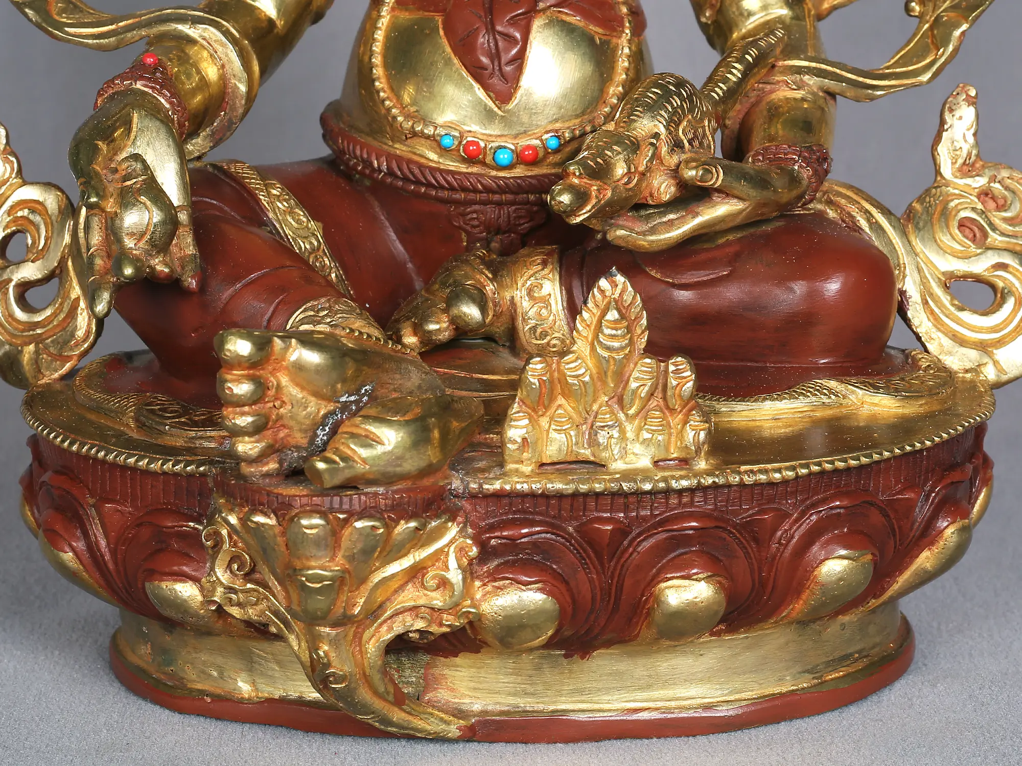 The posture of Lord Kubera, with his hands resting comfortably and holding symbols of wealth such as the mongoose (a dispenser of jewels) and a pot of gold, signifies his unwavering control over the flow of abundance. His benevolent gaze and gentle smile reflect his role as a giver, a deity who blesses his devotees with prosperity and well-being. The rich, warm tones of the gilded copper evoke the brilliance of gold and the inherent value of wealth. The deep crimson of his lower garments and the intricately carved pedestal add depth and visual richness, grounding the divine figure in earthly beauty. This statue serves as a powerful reminder of the divine source of all sustenance and the importance of balanced prosperity, encompassing both material comfort and spiritual richness. ––––––––––––––––––––