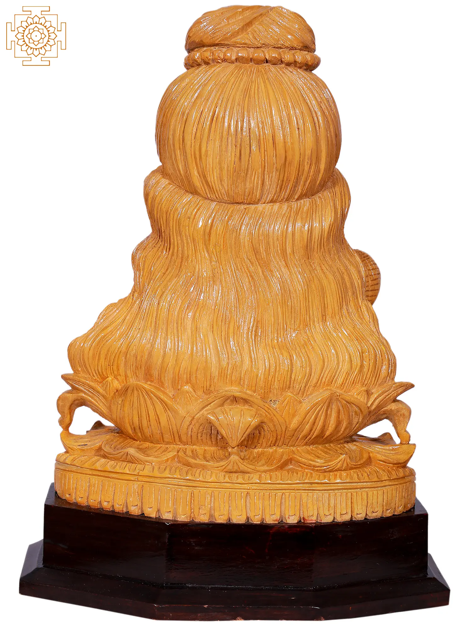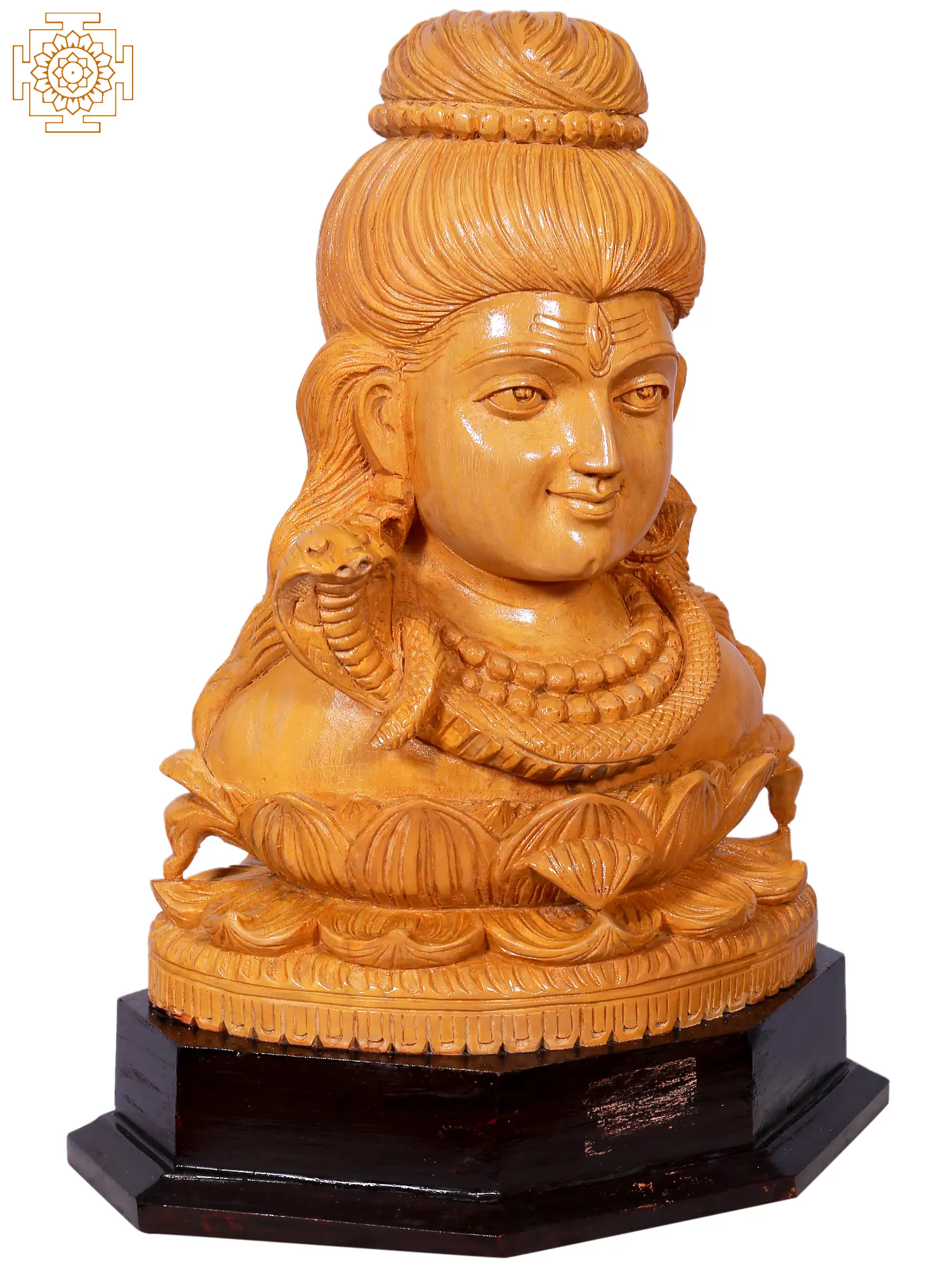 Immerse yourself in the divine presence of Lord Shiva, the supreme deity in Hinduism, with this exquisitely carved wooden head. Rendered in a warm, natural wood, this masterpiece stands as a testament to artisanal skill and spiritual devotion. The serene expression on Shiva's face, characterized by half-closed eyes and a gentle smile, evokes a profound sense of peace and inner contemplation. This depiction captures Shiva in his aspect as Mahayogi, the great ascetic, lost in deep meditation, radiating an aura of calm amidst the cosmic dance of creation and destruction. The intricate details are a feast for the eyes. The flowing locks of hair are meticulously carved, framing a face etched with divine wisdom. The third eye, a potent symbol of Shiva's spiritual sight and destructive power, is subtly present on his forehead. Adorning his neck is a coiled serpent, Vasuki, a powerful symbol of transformation, rebirth, and the cyclical nature of time. Vasuki is also known as the king of all Nagas and is often depicted as Shiva's adornment, representing his mastery over fear and poison. This serpent is not merely an ornament but a powerful reminder of Shiva's ability to conquer even the deadliest of forces. The entire bust rests upon a beautifully carved lotus, the sacred flower that symbolizes purity, spiritual awakening, and detachment from the material world, further emphasizing Shiva's divine nature.