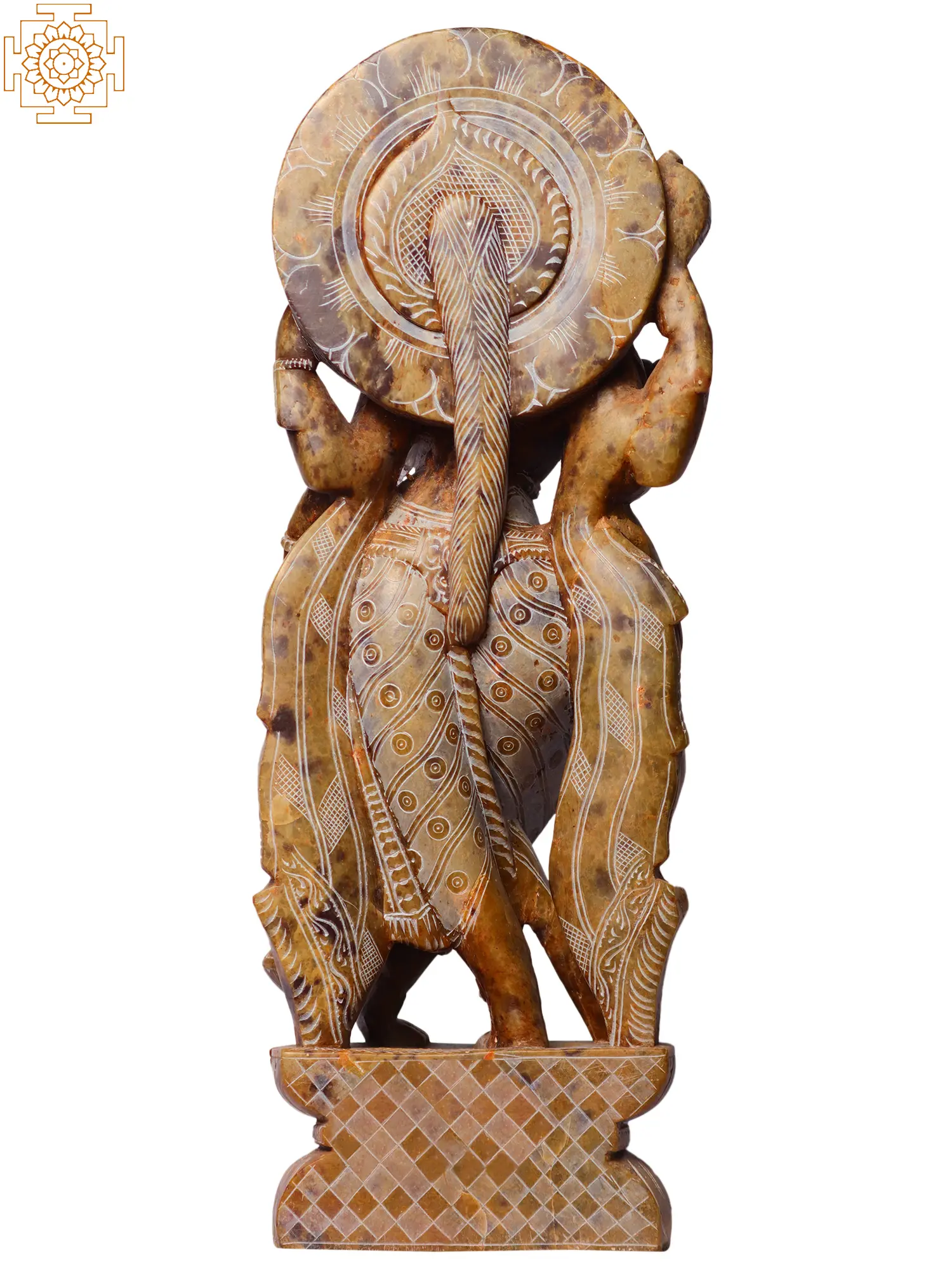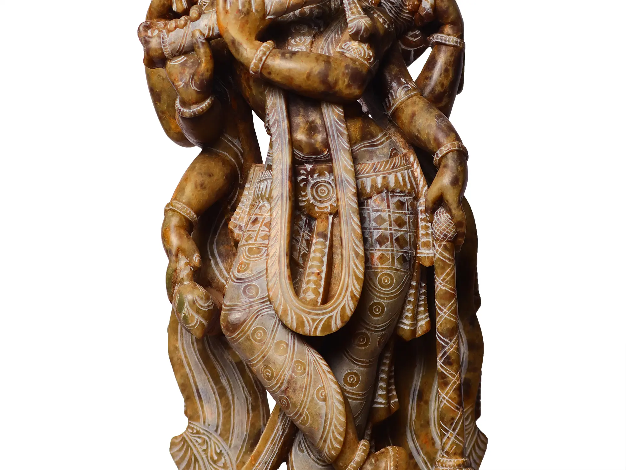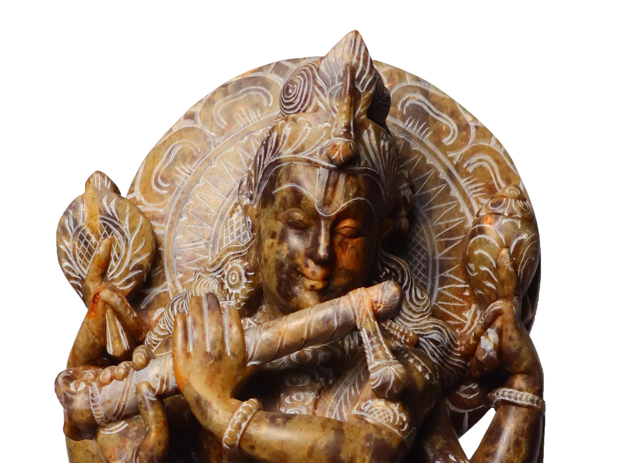 The sculptor has masterfully rendered Krishna in a dynamic pose, his body gracefully curved as he draws forth the celestial notes. The multiple arms suggest his divine omnipresence and the various roles he plays in the cosmic play. His serene face, with eyes closed in deep meditation and devotion, speaks of an inner peace that radiates outwards. The intricate carvings on his garments, the delicate bangles on his wrists, and the elaborate headwear all speak to the reverence and artistry poured into its creation. Each curve and contour of the stone has been coaxed to life, reflecting the devotion of generations of artisans. ––––––––––––––––––––