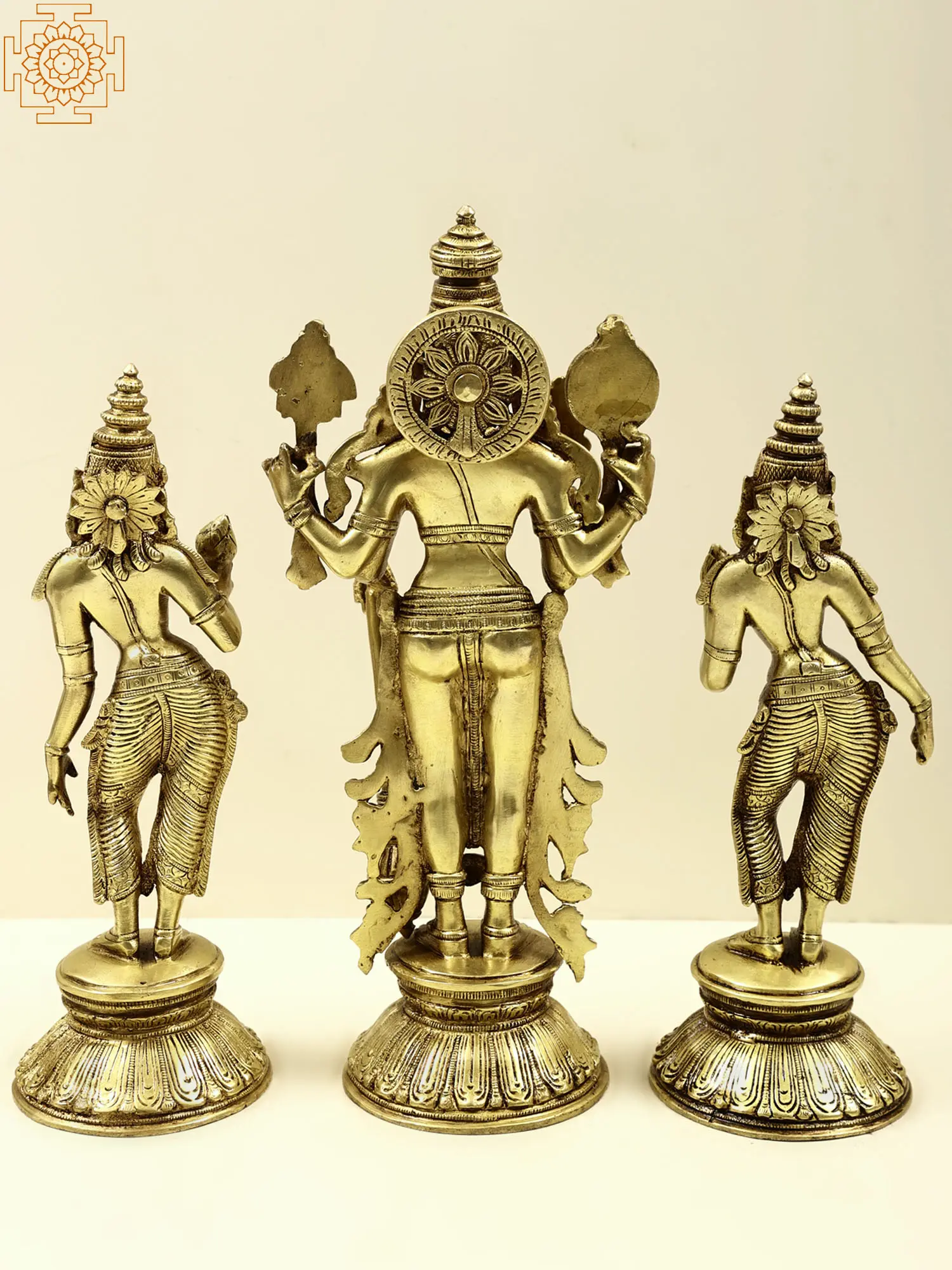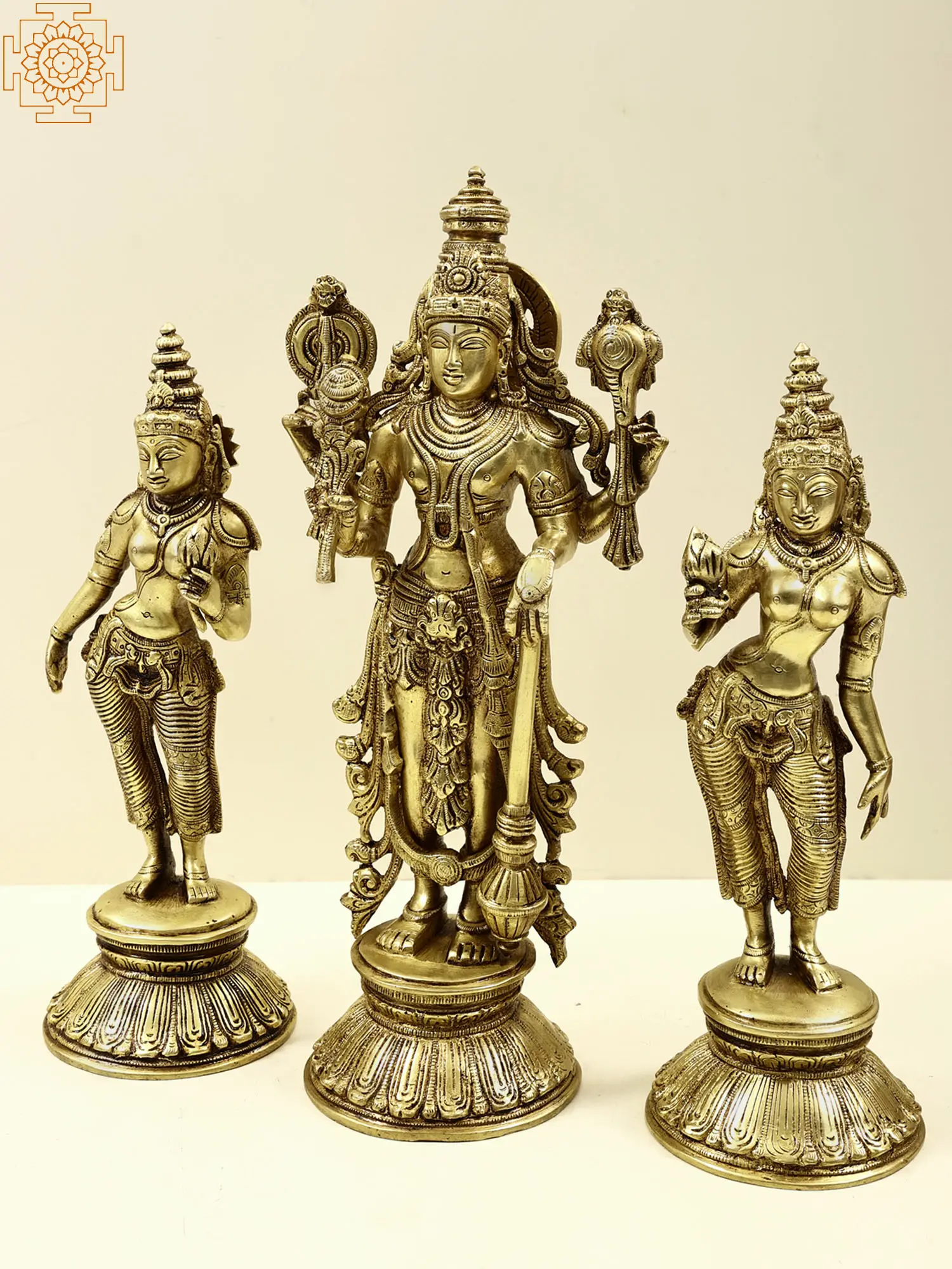 The Hindu belief in divine harmony and prosperity is profoundly represented by the brass sculptures of Lord Vishnu with Shridevi and Bhudevi. Protector of the universe Lord Vishnu is seen with his consorts, the goddesses Bhudevi, representing Mother Earth, and Shridevi, the goddess of riches. Their well-known features, including Bhudevi's grain bowl and Shridevi's lotus blossom, stand for wealth, purity, and the connection between the Earth and the skies. Carefully crafted in India, these sculptures serve as both works of art and symbols of profound respect and devotion in Hindu homes and temples. They serve as a constant reminder to protect the planet's natural resources and to welcome spiritual prosperity as an essential aspect of life and culture.