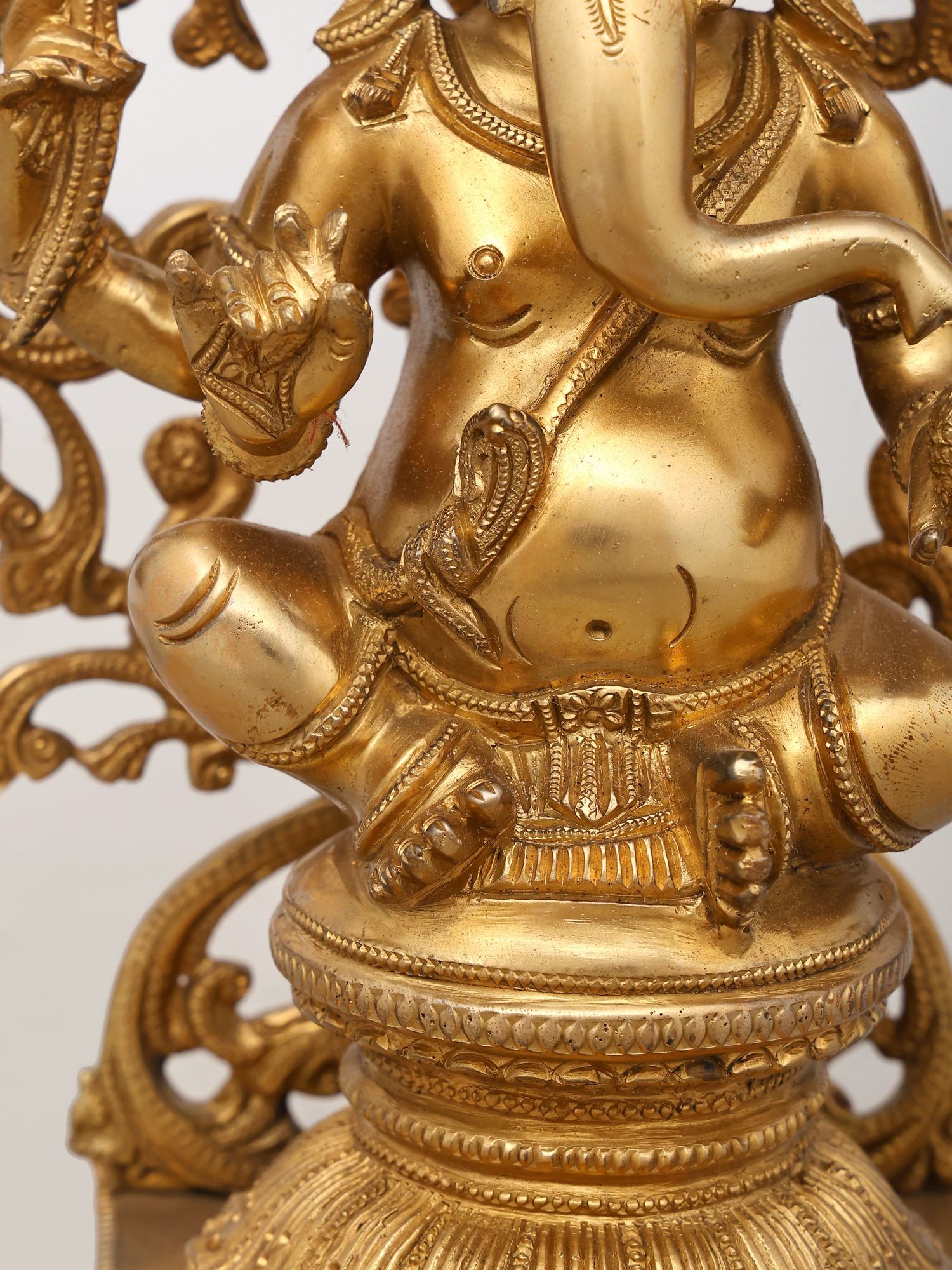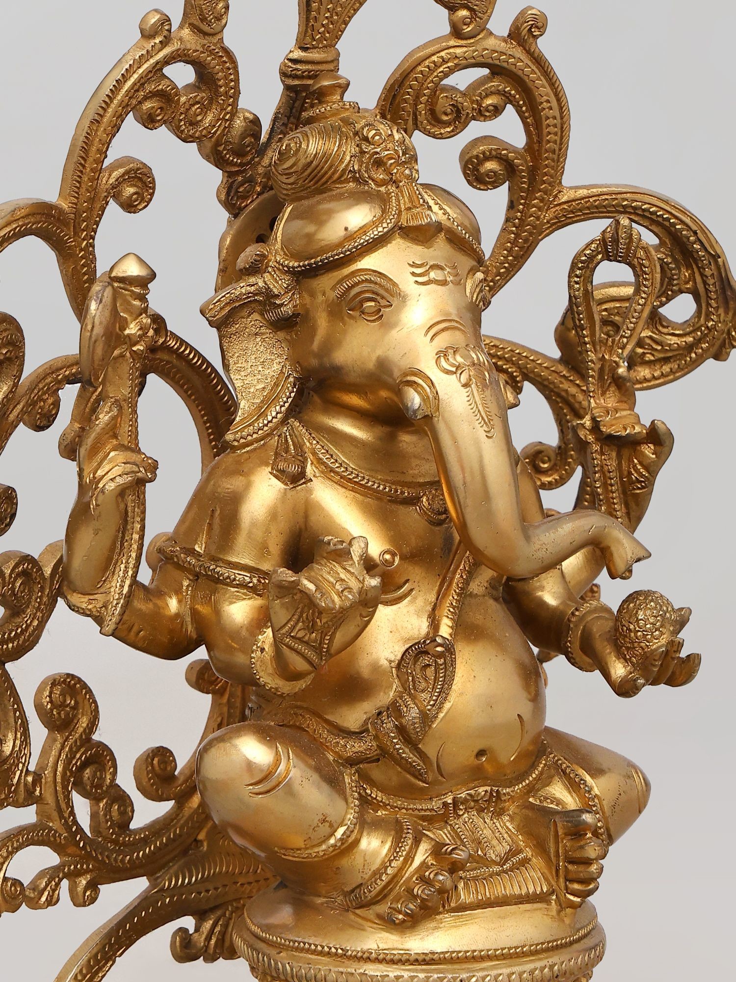 Observe the sublime beauty of the ornate *prabhavali*, a radiant aureole that cradles the divine figure. Intricate scrollwork and decorative motifs flourish, drawing the eye to the tranquil countenance of the elephant-headed god. The masterful rendering of his four arms, each holding a symbolic object, further accentuates the piece's spiritual significance and aesthetic appeal.