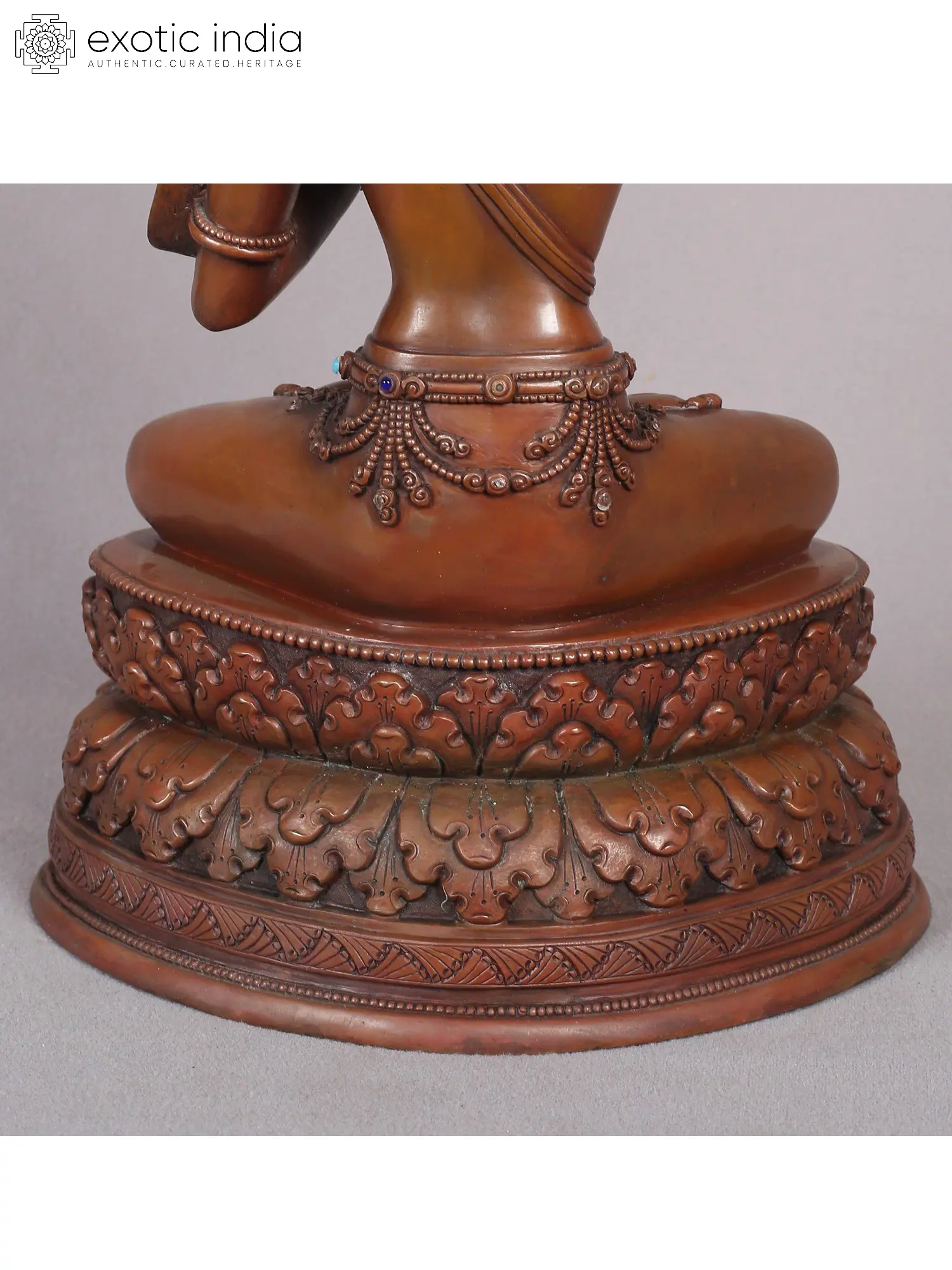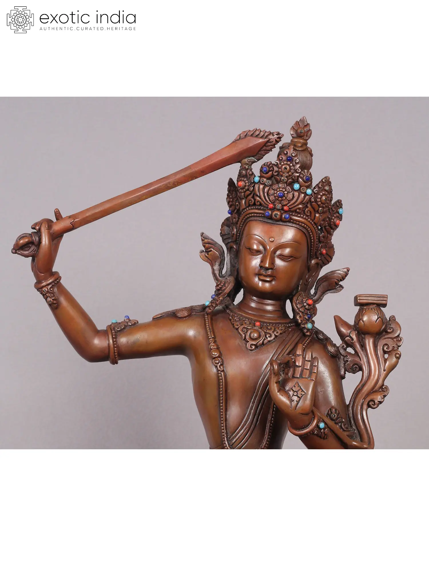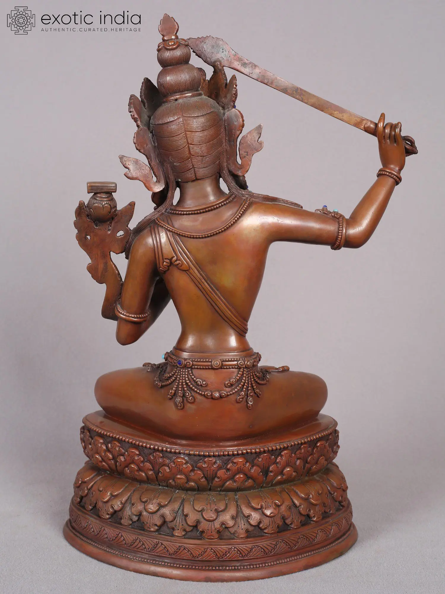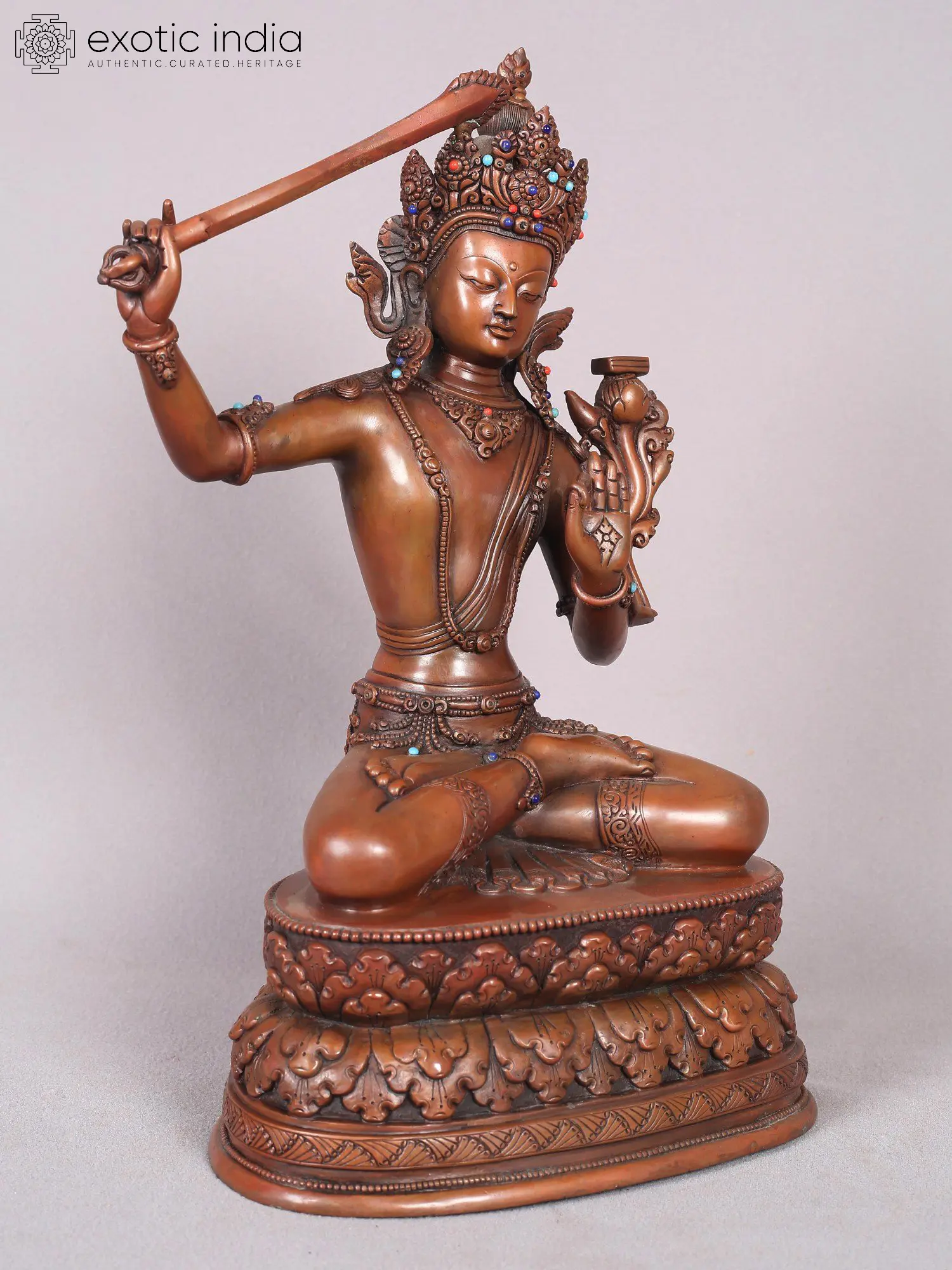 Manjushri, a revered Bodhisattva whose name translates to "gentle or sweet glory" in Sanskrit, is beautifully captured in this Nepalese copper masterpiece. The craftsmanship of this sculpture showcases his divine essence with unparalleled grace and precision. With his flaming sword and the enlightening Vitarka Mudra (a gesture symbolizing discussion and transmission of Buddhist teachings), Manjushri emanates timeless wisdom that transcends all boundaries.