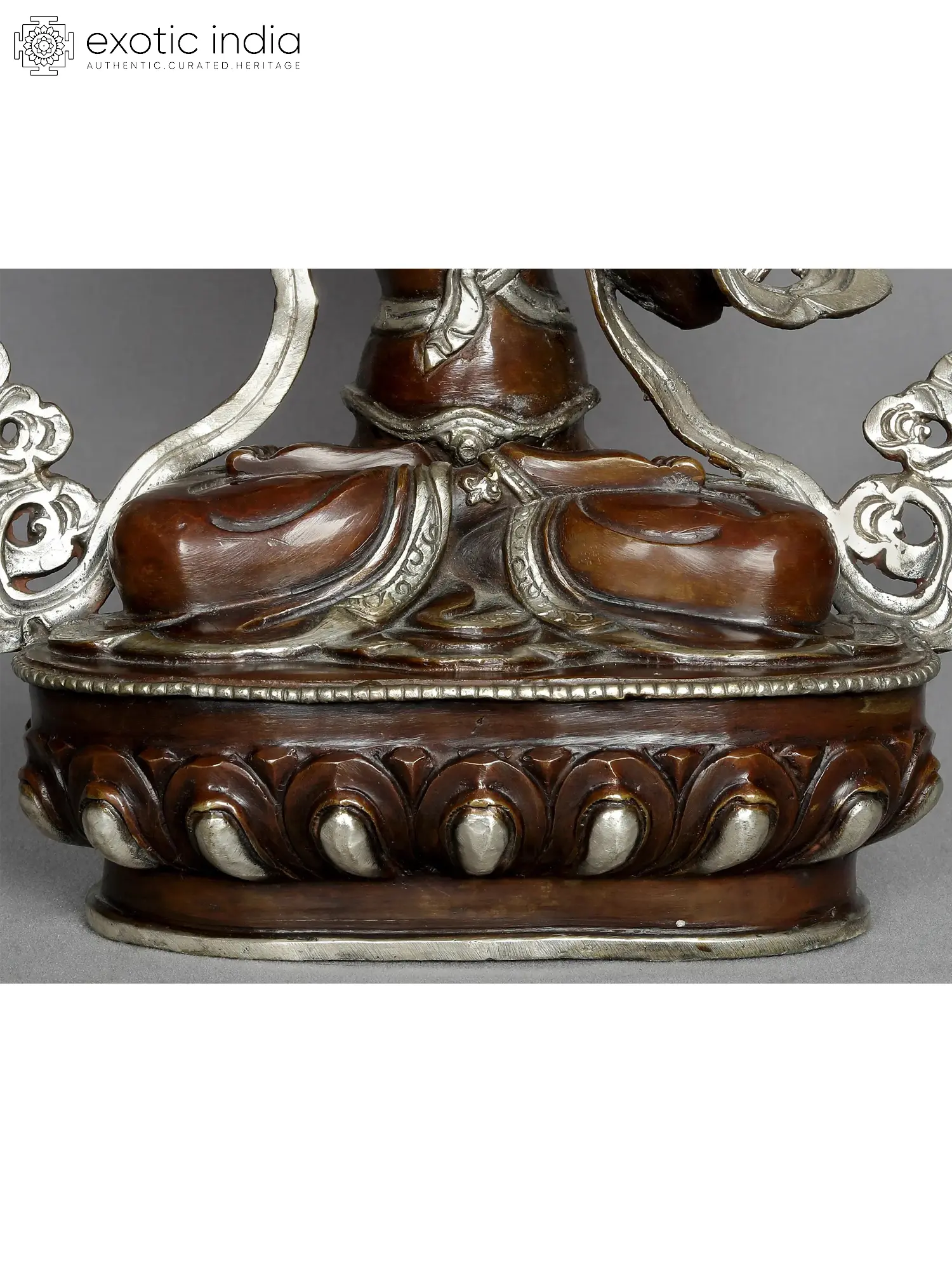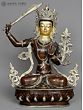 "Manjushri," translates to "Gentle Glory," signifying his compassionate and gentle demeanor while imparting profound knowledge. He is considered the founder of the valley and is deeply revered for his transformative actions. This 13” silver and brown Manjushri sculpture depicts a radiant and youthful countenance, representing the eternal nature of wisdom. The lotus throne he is sitting on symbolizes purity, while his flaming sword represents his ability to cut through ignorance and dispel darkness. Adorned with jeweled ornaments, including necklaces, bracelets, and earrings, he is painted having enlightened qualities and exalted nature.
