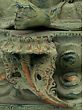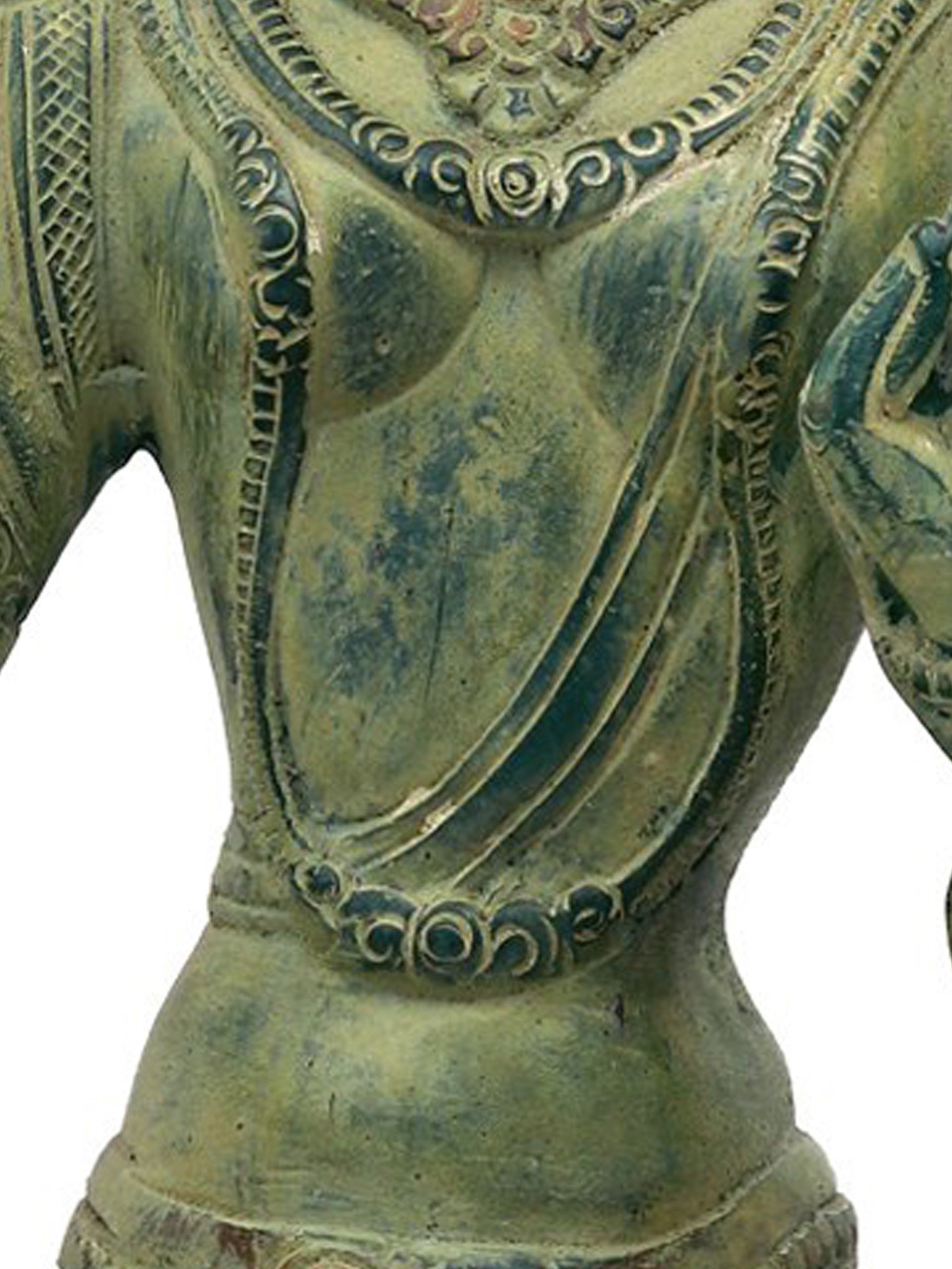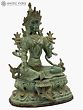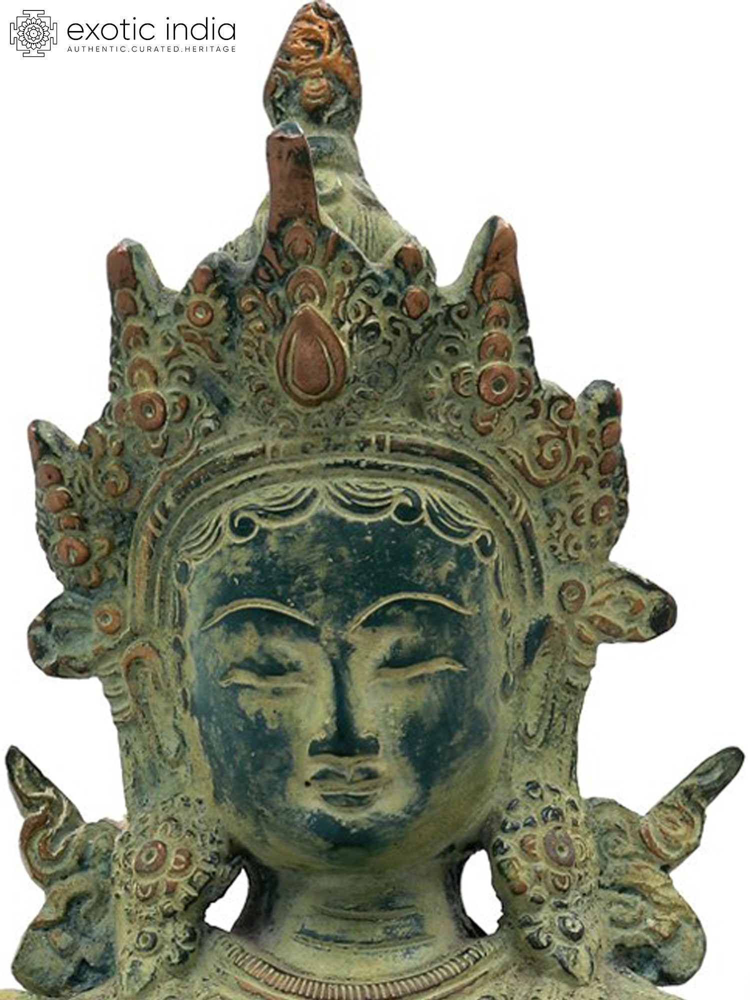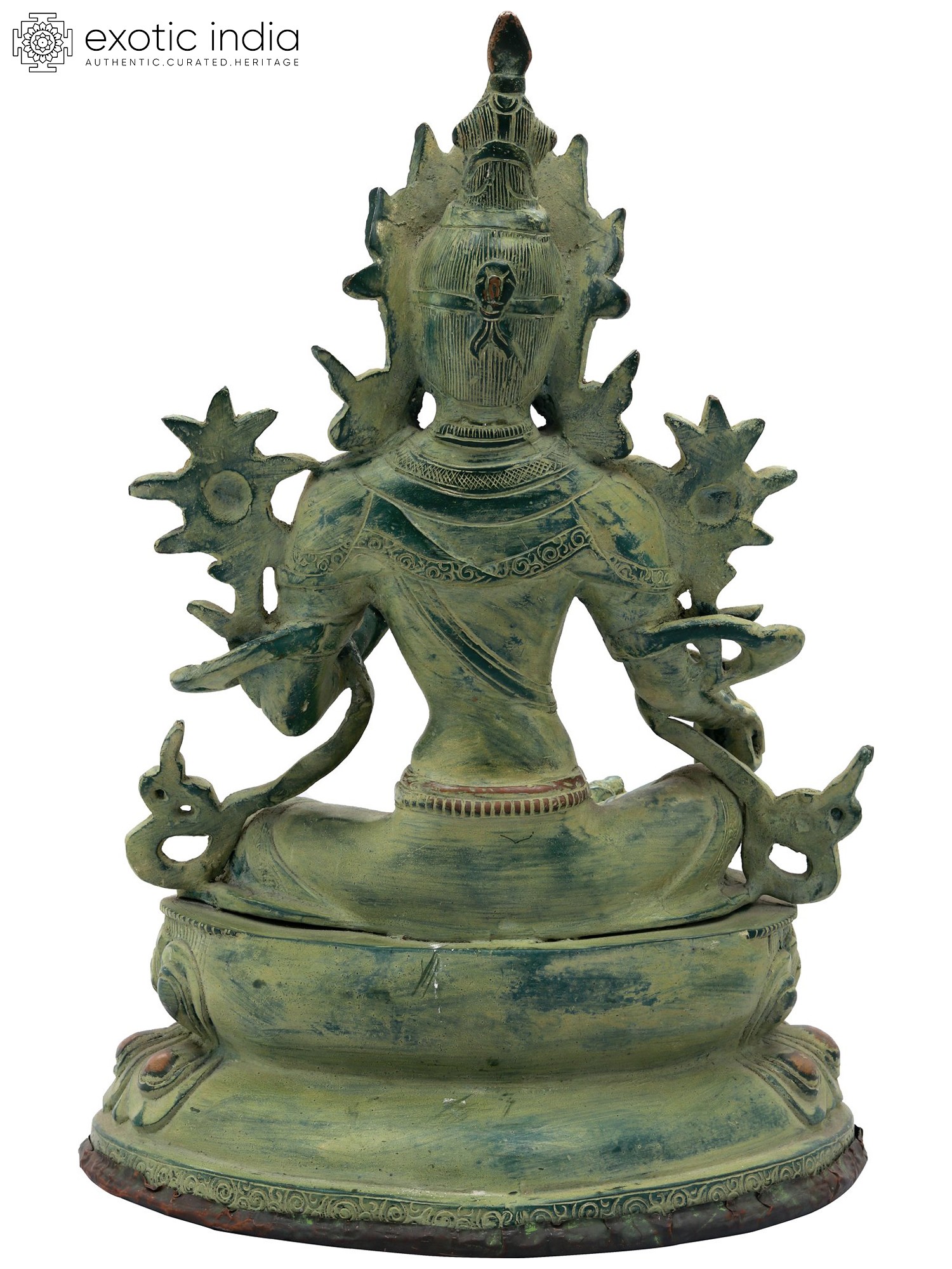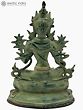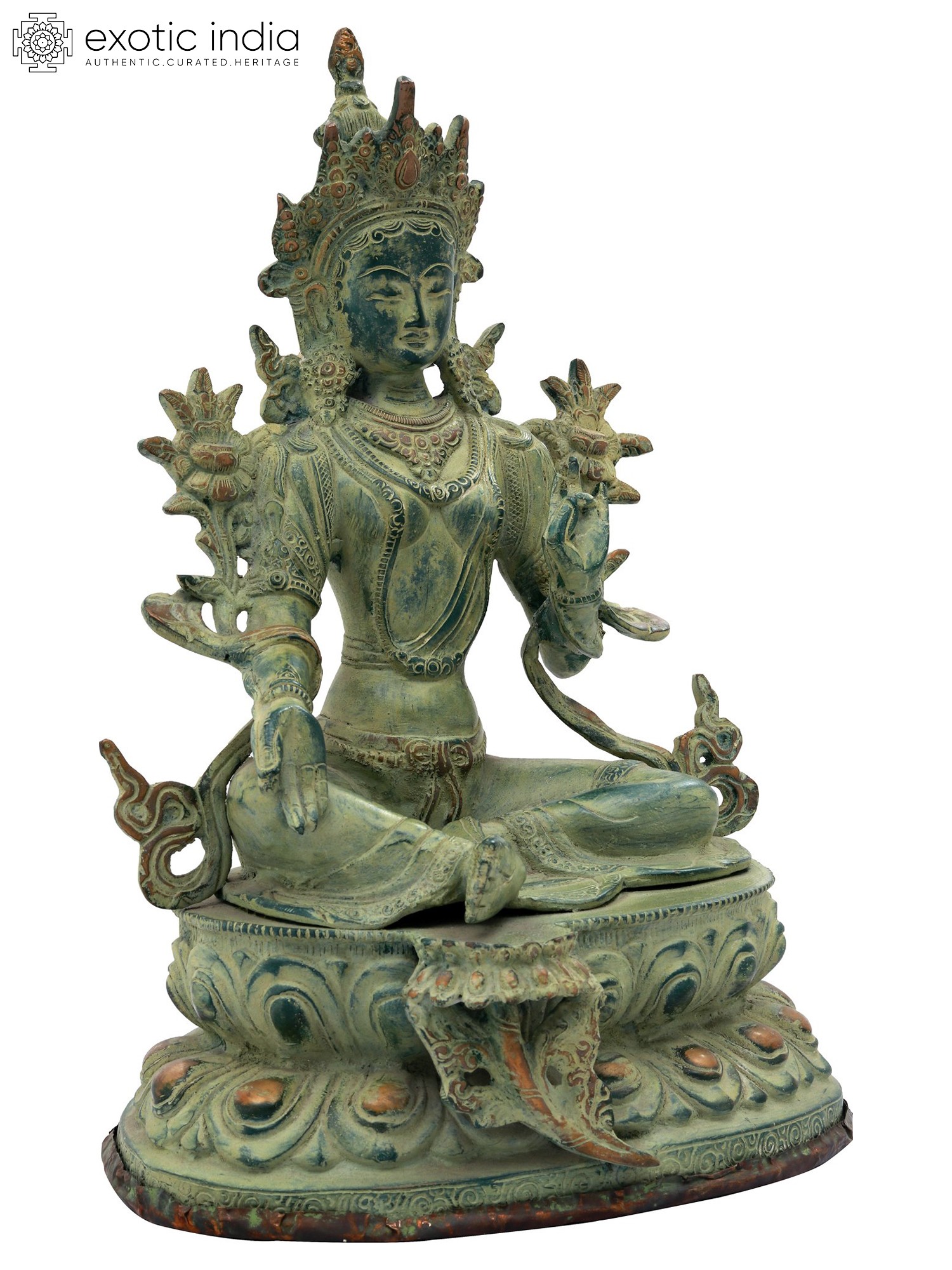 The sculptor has carved the slender, long proportionate body of this Buddhist deity with smooth and sharp curves maintaining her charmness and divine aura. We at Exotic India avail you with one of the most distinctive and rare beauty of sculptural art. This Green Tara brass sculpture is available with us in two unique colors of mehendi green highlighted with gold touch and a green chola giving it an ancient stone look.