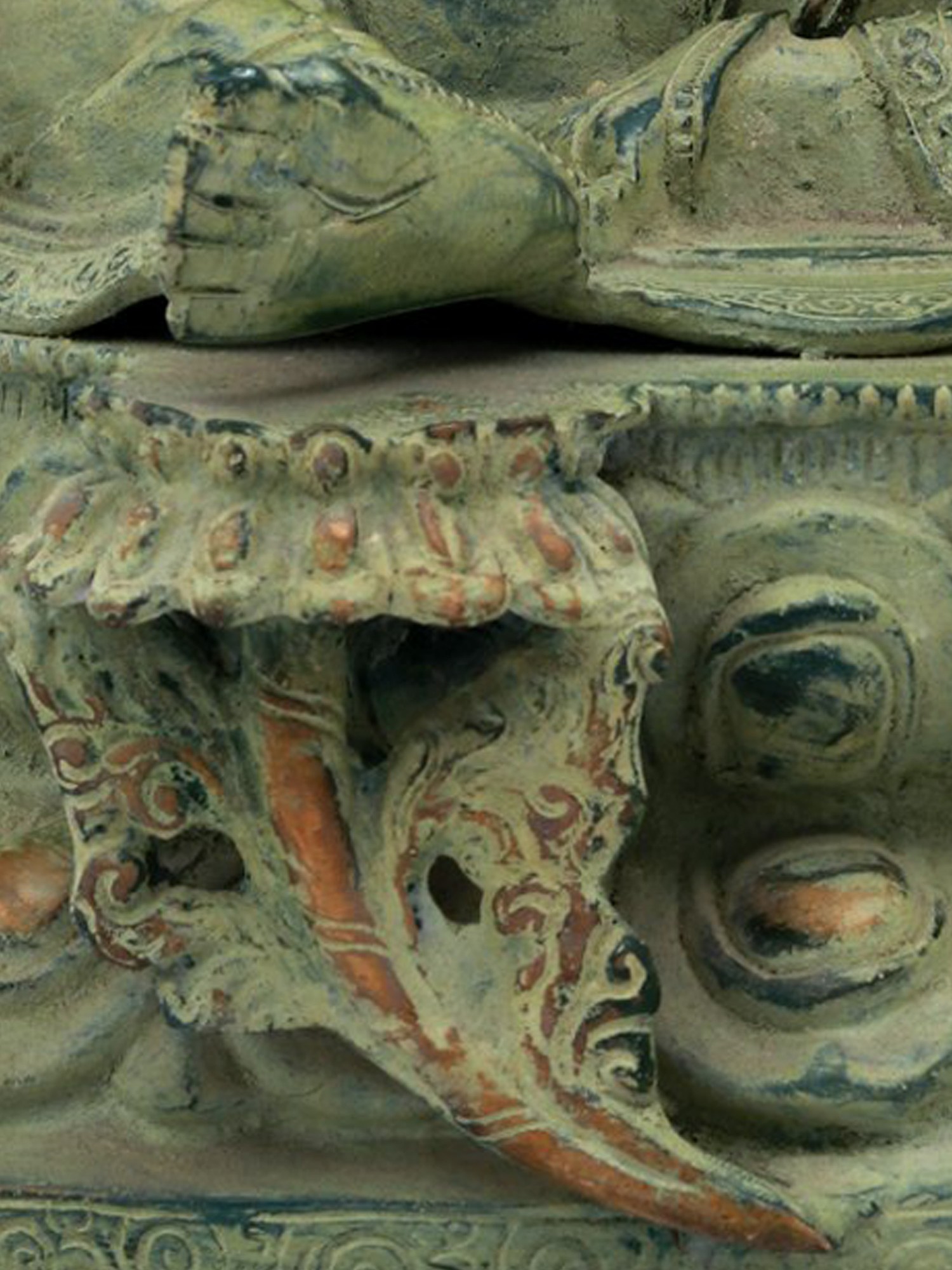The holy mother is perched on a double layered lotus pedestal, carved beautifully with every petal highlighted in clear designs. The right hand touches the right knee with the palm facing outwards in a gesture of ‘giving’ and holds the stem of a pink lotus while the left hand is postured near the heart in a mudra of granting refuge and holds a blue lotus as a symbol of power; both the lotuses bloom gracefully on either of her shoulders. Tara is jewelled humbly with necklaces, earrings and bracelets along with a supremely carved crown glorified on her head. The loving eyes are closed in compassion along with a sweet smile on her face.