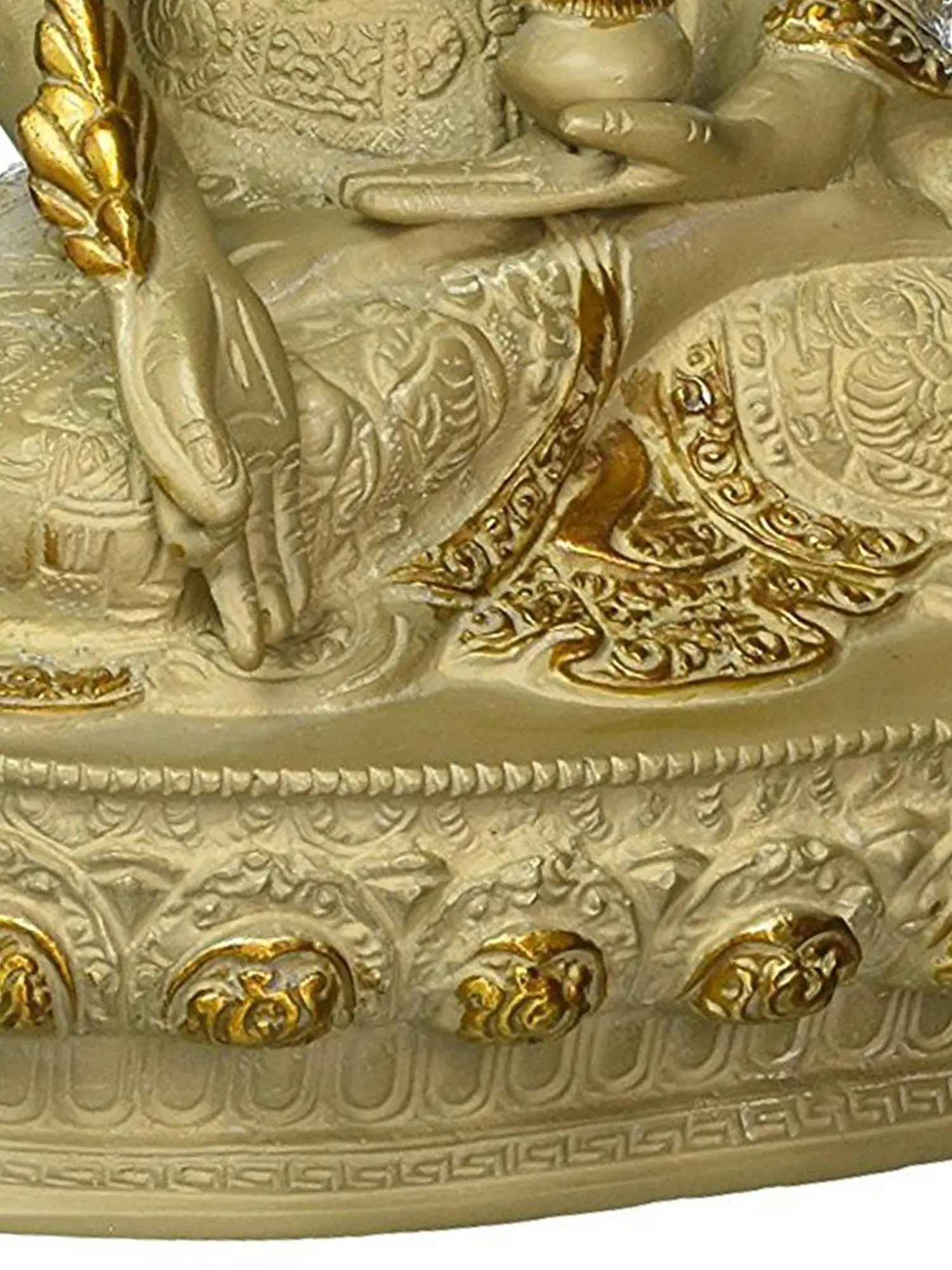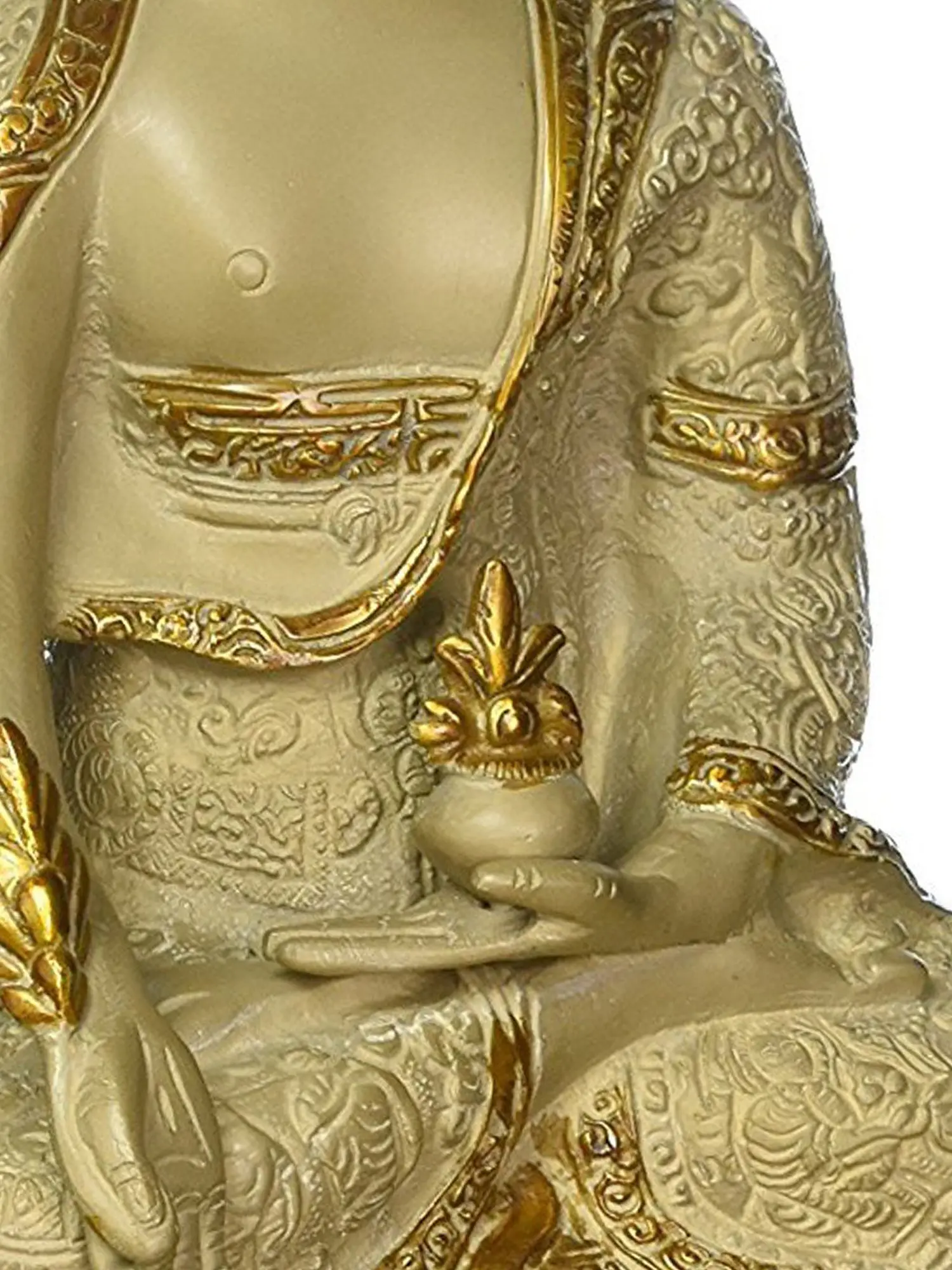 Hand-carved with meticulous attention to detail in India, this statue showcases the pinnacle of traditional brass sculpting. The artisans have poured their skill and devotion into every curve and contour, creating a piece that is both aesthetically stunning and spiritually significant. The serene countenance of the Medicine Buddha, with his eyes gently closed in meditation, radiates tranquility. His monastic robes are adorned with intricate, embossed patterns and highlighted with gleaming gold accents, symbolizing the purity and richness of his teachings. The subtle golden highlights further accentuate the divine aura and the radiant essence of the Buddha. The posture of the Medicine Buddha is equally significant. Seated in a meditative pose, his left hand rests in his lap, palm facing upwards, holding a bowl filled with the nectar of immortality and healing herbs. This symbolic gesture represents his boundless generosity and his capacity to cure all diseases. His right hand is extended downwards, palm open, with the thumb and index finger touching. This mudra, known as the Varada Mudra or gesture of giving, signifies his readiness to bestow blessings, offer boons, and alleviate suffering. The base of the statue is equally ornate, featuring a rich lotus motif, a universal symbol of purity, enlightenment, and spiritual growth. The intricate detailing on the base further enhances the regal and sacred nature of the deity.