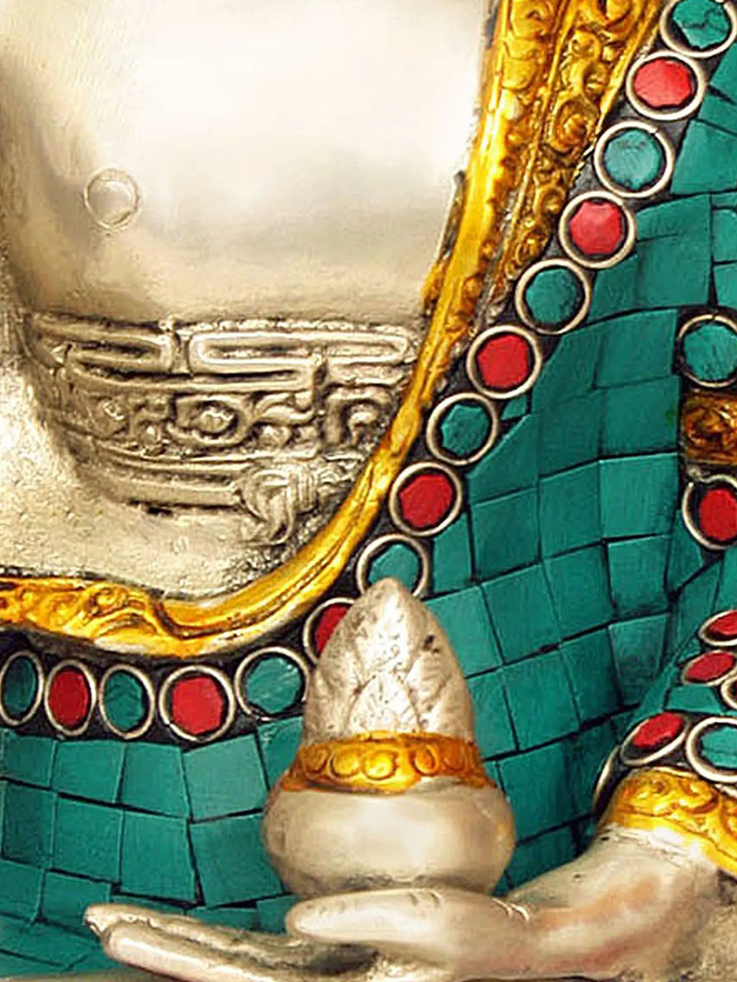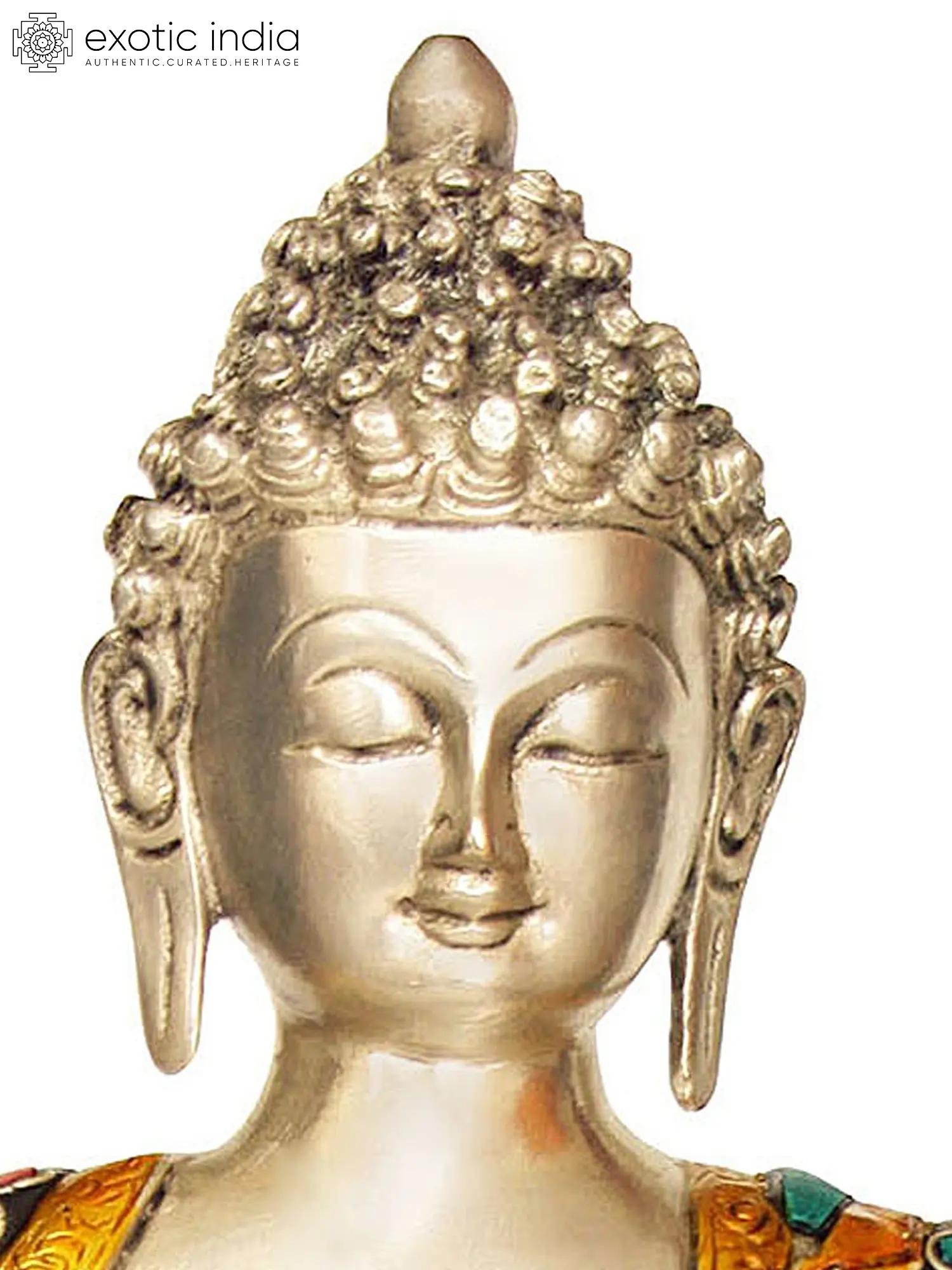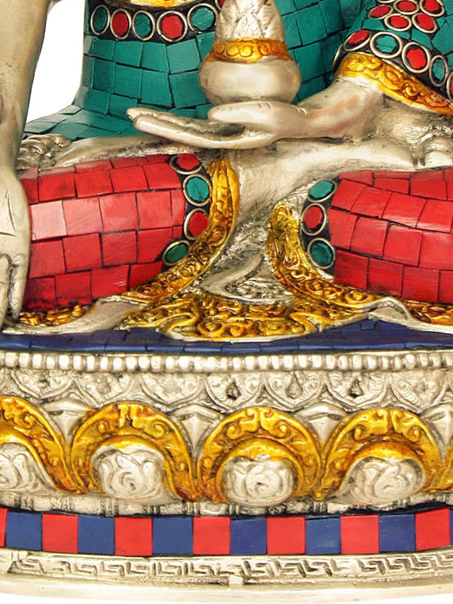 Every curve and contour of this statue reflects the skill and dedication of the artisans who created it. The brass form is meticulously worked to capture the essence of the Medicine Buddha’s compassionate presence. The inlaid details, carefully placed, enhance the richness and depth of the piece. The combination of the enduring metal and the vibrant inlay creates a visually stunning piece that serves as a focal point for meditation and spiritual reflection. The statue's creation is imbued with the spirit of devotion, adding another layer of meaning and significance to this sacred object. The brass material ensures durability and longevity, allowing this image of the Medicine Buddha to inspire peace and healing for generations to come.