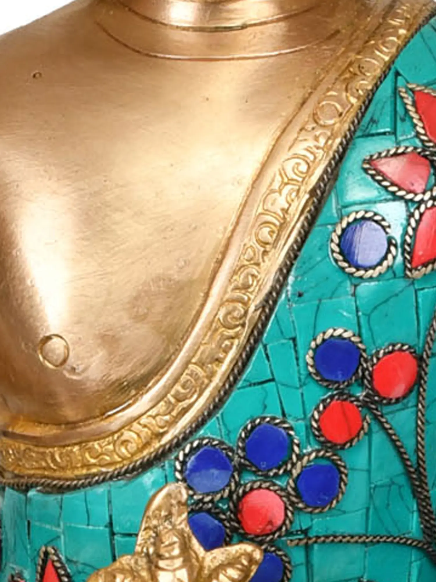 Hand-crafted in India by master artisans, this statue is a testament to centuries of artistic tradition. The lustrous brass offers a warm, inviting glow, while the intricate inlay work elevates its sacred significance. The vibrant turquoise and coral gemstones, meticulously set into the robes and base, represent precious elements and symbolize vital energies. Turquoise is often associated with healing, protection, and wisdom, while coral is linked to vitality, passion, and courage. The rich blue of the lapis lazuli on the ushnisha (the cranial protuberance signifying wisdom) further enhances the divine aura of the deity. The detailed carving of the lotus base, a universal symbol of purity and spiritual awakening, grounds the figure in a sacred space. This piece is not merely a decorative object but a powerful conduit of spiritual energy, intended to inspire peace, well-being, and a connection to profound healing energies.