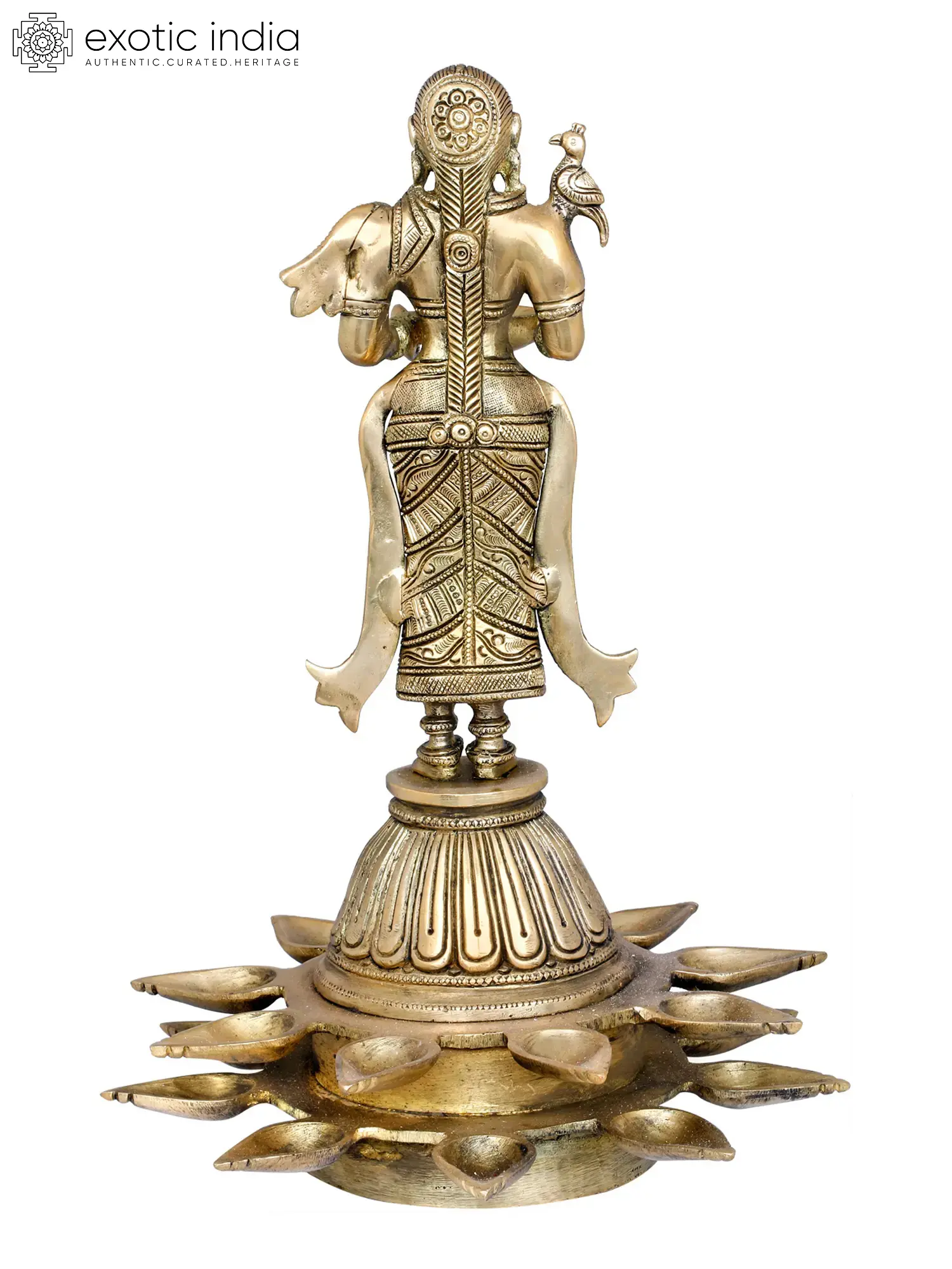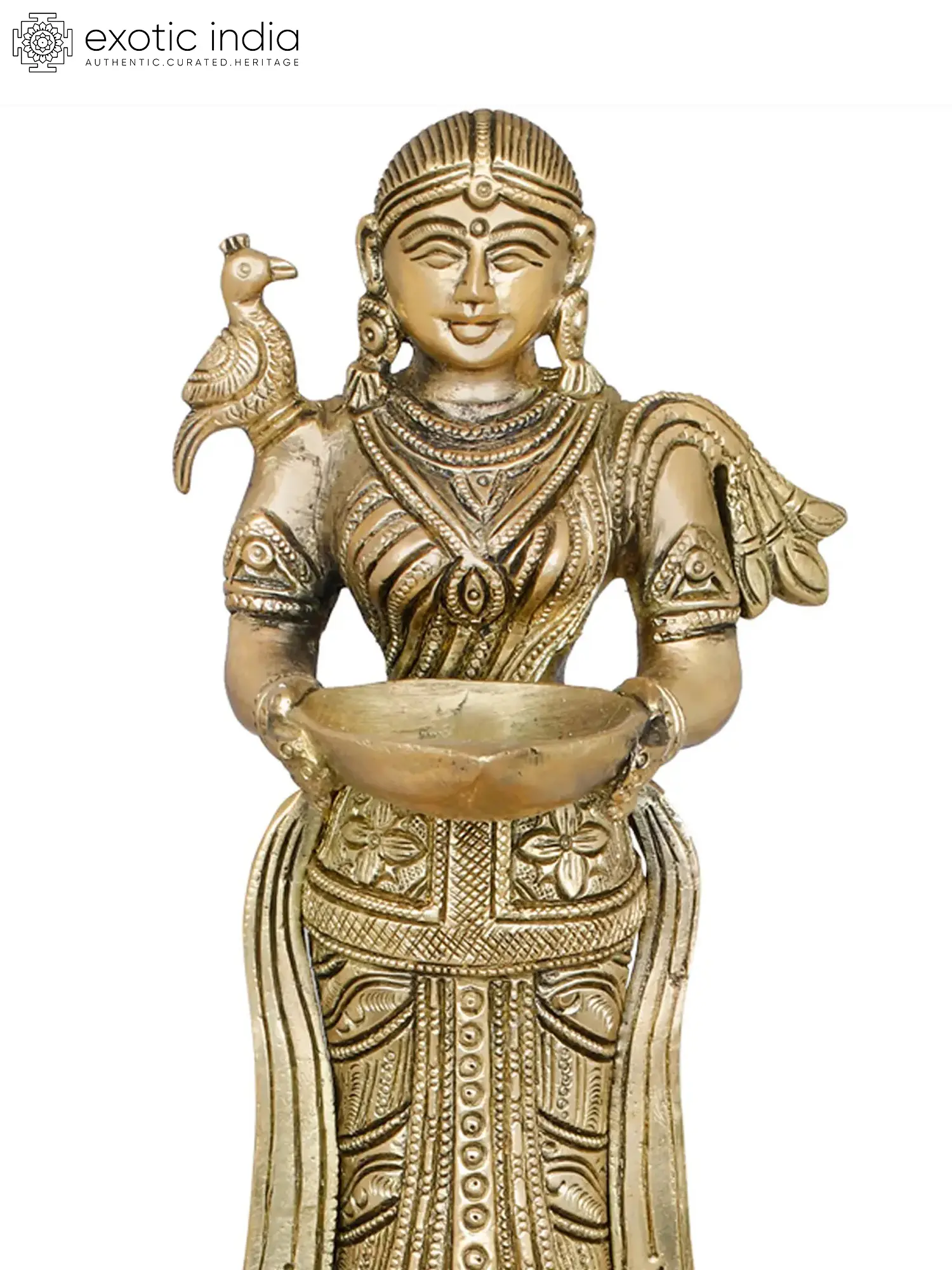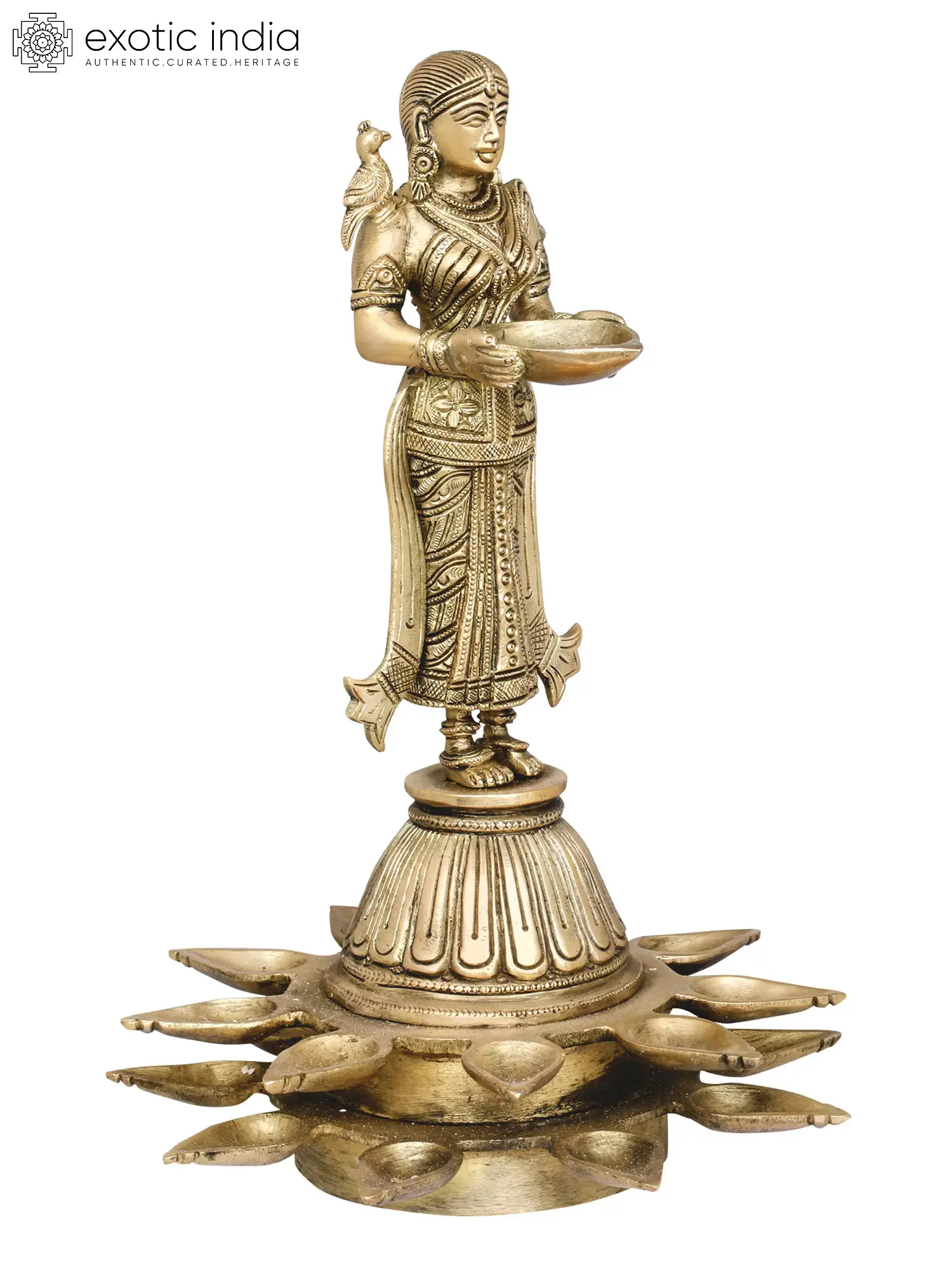 This brass Deepalakshmi, also known as a Pavai diya or Vilaku Lakshmi, is a classic Diya that was said to be particularly popular during the Pandya dynasty. These Diyas were intended to illuminate the way leading to a temple or a certain god. The lamp's major feature is a standing lady holding a diya. A parrot perched on her shoulder is a fertility sign. The nineteen wicks make this diya a unique and gorgeous piece to be put in a worship location, with highly delicate detailing of the lady's dress, jewelry, and facial characteristics.