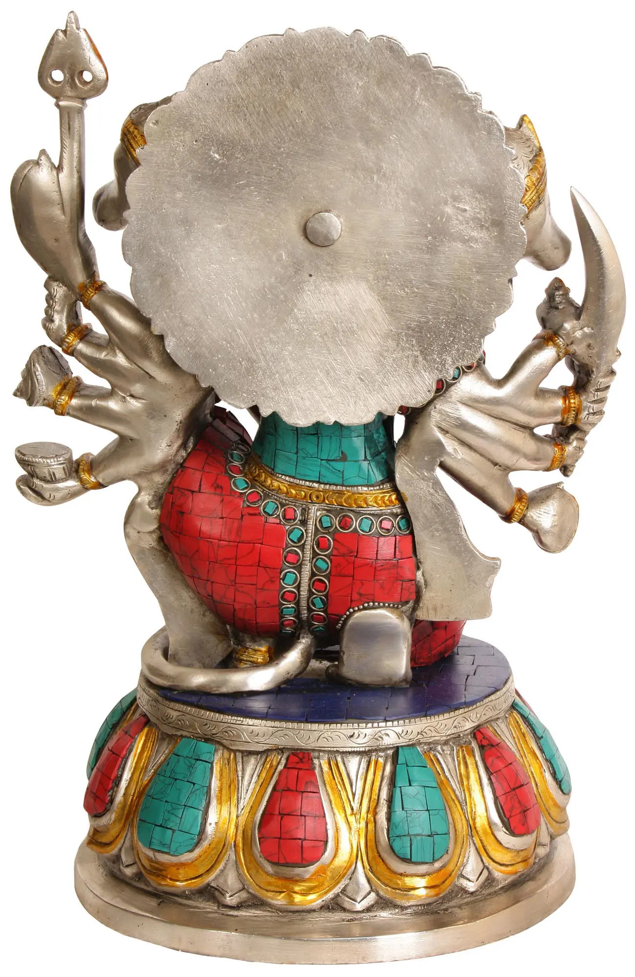 Unveil the divine courage and strength of Hanuman with our handcrafted Panchmukhi Hanuman Brass Sculpture which beautifully captures Hanuman with five faces, iconising his multifaceted nature and profound devotion. Panchamukhi Hanuman, the embodiment of unwavering dedication, represents the core teachings of devotion and loyalty in Hindu philosophy. His five faces speak of the balance of five elements and the harmony between human and divine attributes. The intricate details, from Hanuman's powerful build to the finely sculpted faces, reflect the artistry and devotion of Indian craftsmen - may it encourage you to cultivate the dedication to your spiritual path and embody the teachings of Hanuman.