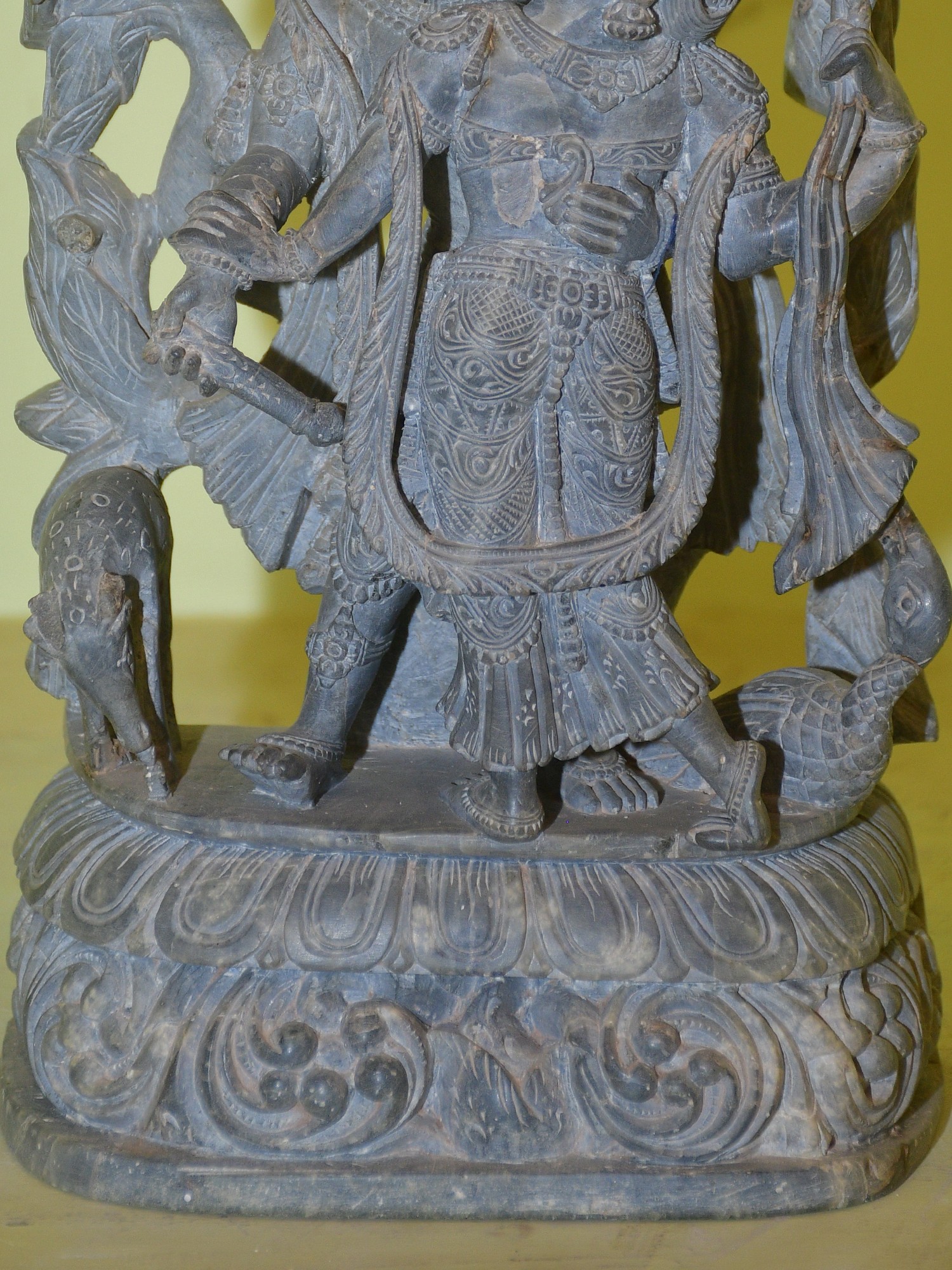 13" Superfine Idol of Four Amred Lord Vishnu with Oil Lamp and Wood Base | Brass Sculpture