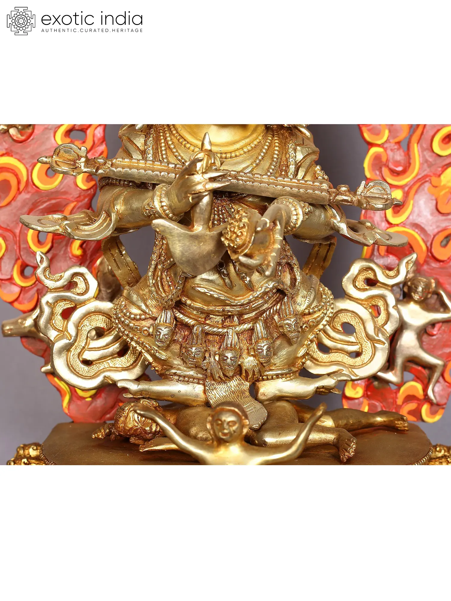 In his left hand, he holds a skull cup filled with blood, signifying the transformation of the ego and worldly desires. This represents the wisdom of emptiness and the transmutation of impurities into the enlightened state.