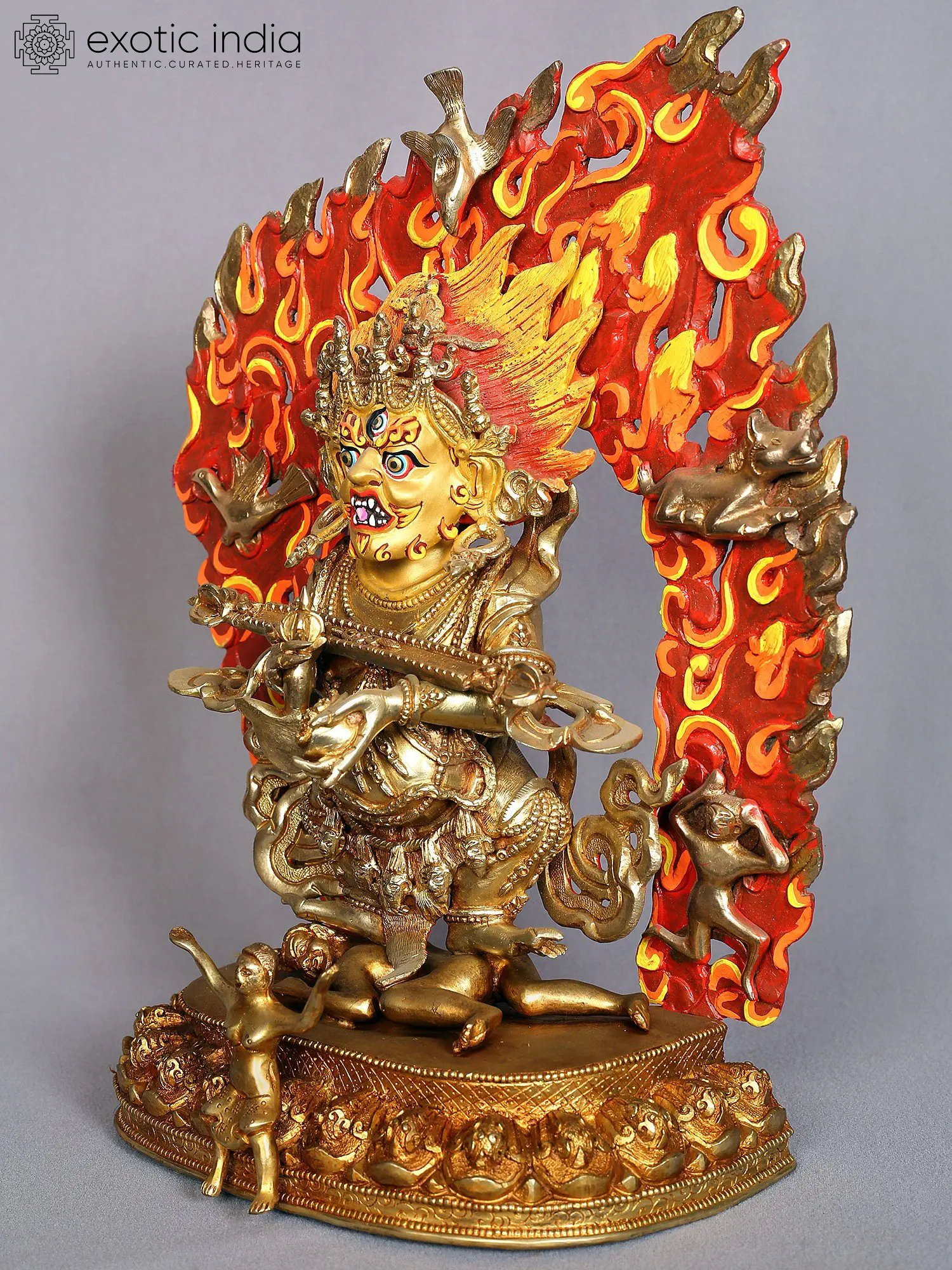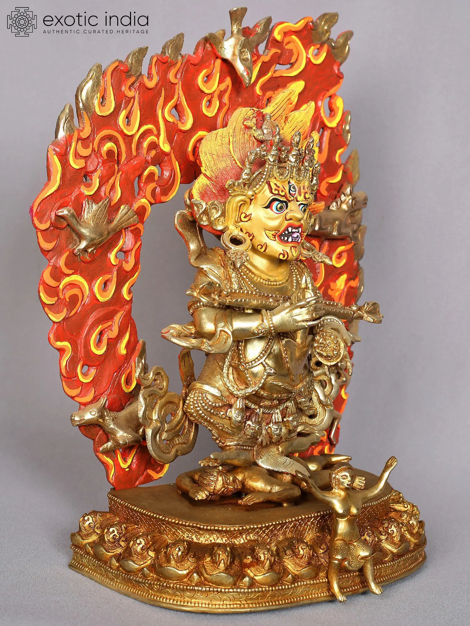 Two-armed Mahakala, also known as "Dorje Bernagchen" or "Safu Mahakala," is a significant protector deity, especially revered in the Karma Kagyu School of Tibetan Buddhism. He is particularly popular among the Newari community of Nepal. In his right hand, he holds a chopper, symbolizing the cutting through of negative patterns, such as attachment, hatred, and ignorance. This represents the severing of these afflictions to free beings from their grip.