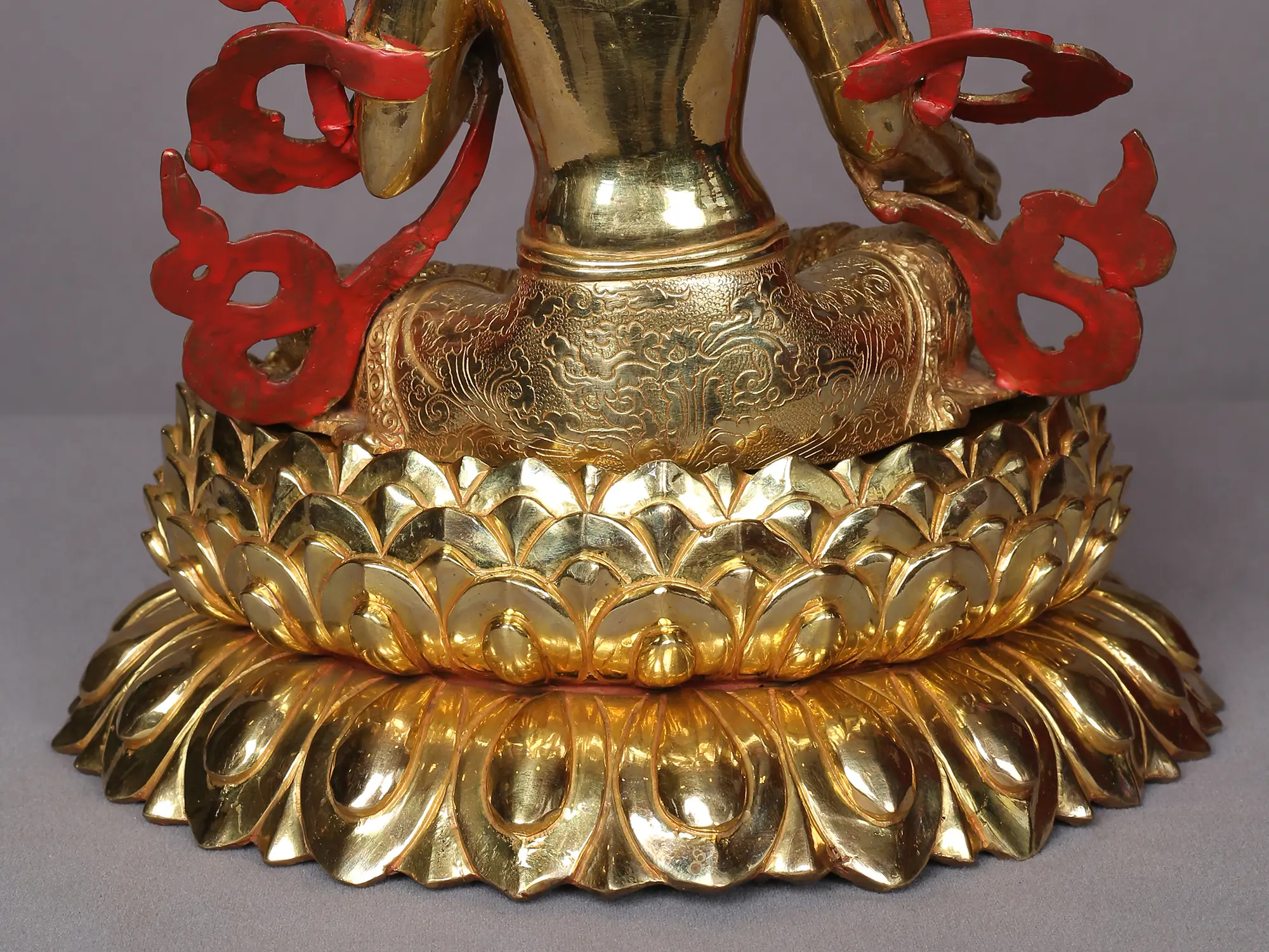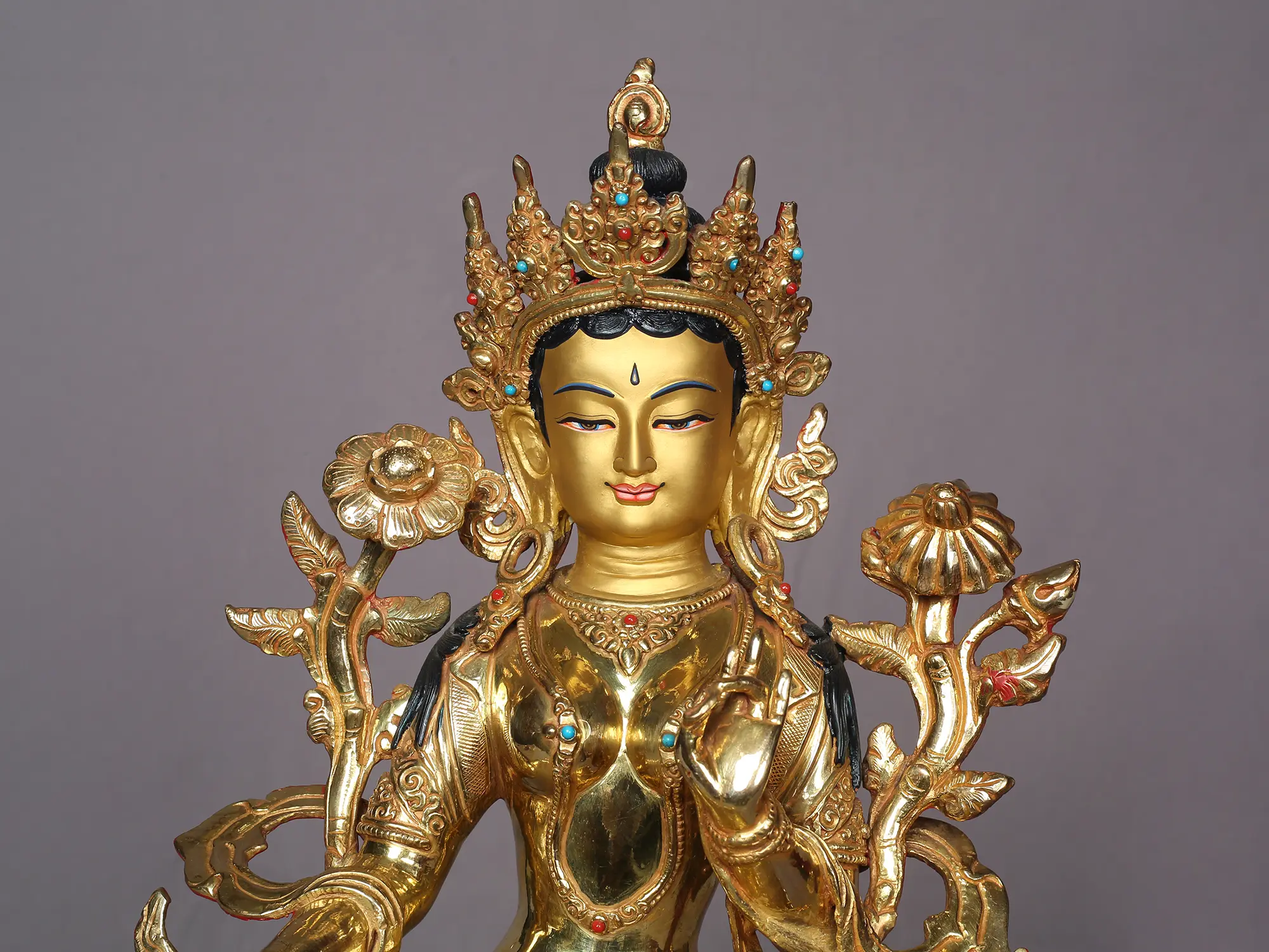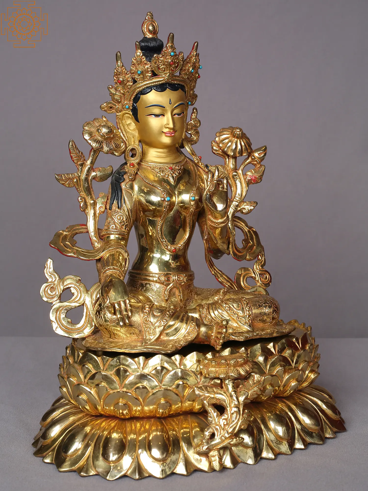 The 13" Seated Goddess Green Tara from Nepal is a remarkable depiction of the revered deity. Green Tara, an important figure in Tibetan Buddhism, is known for her compassionate and nurturing nature. This exquisite statue showcases her unique iconography, with her right hand in the gesture of granting protection and her left hand holding a lotus, symbolizing purity. Green Tara is worshipped for her ability to grant wishes and provide swift assistance in times of distress. Bringing this sacred statue home invites blessings, compassion, and a sense of tranquility, making it a meaningful addition to any spiritual space.
