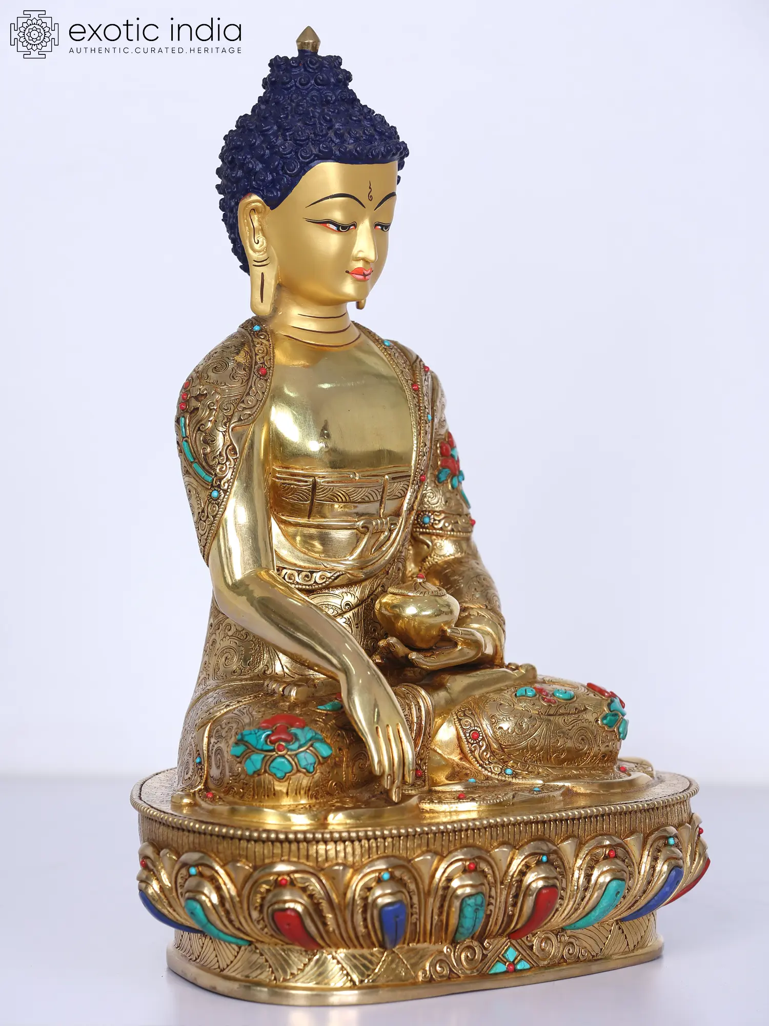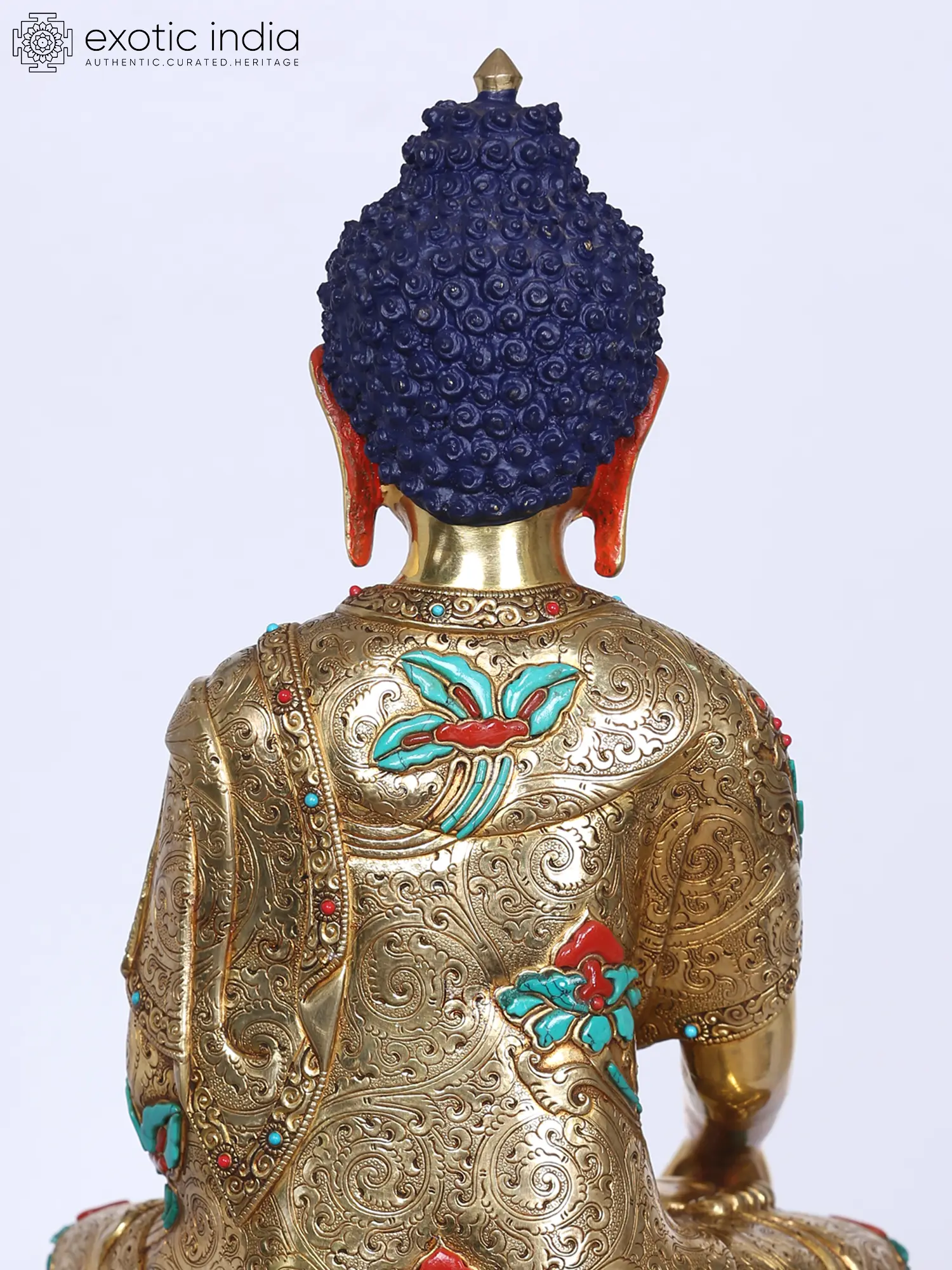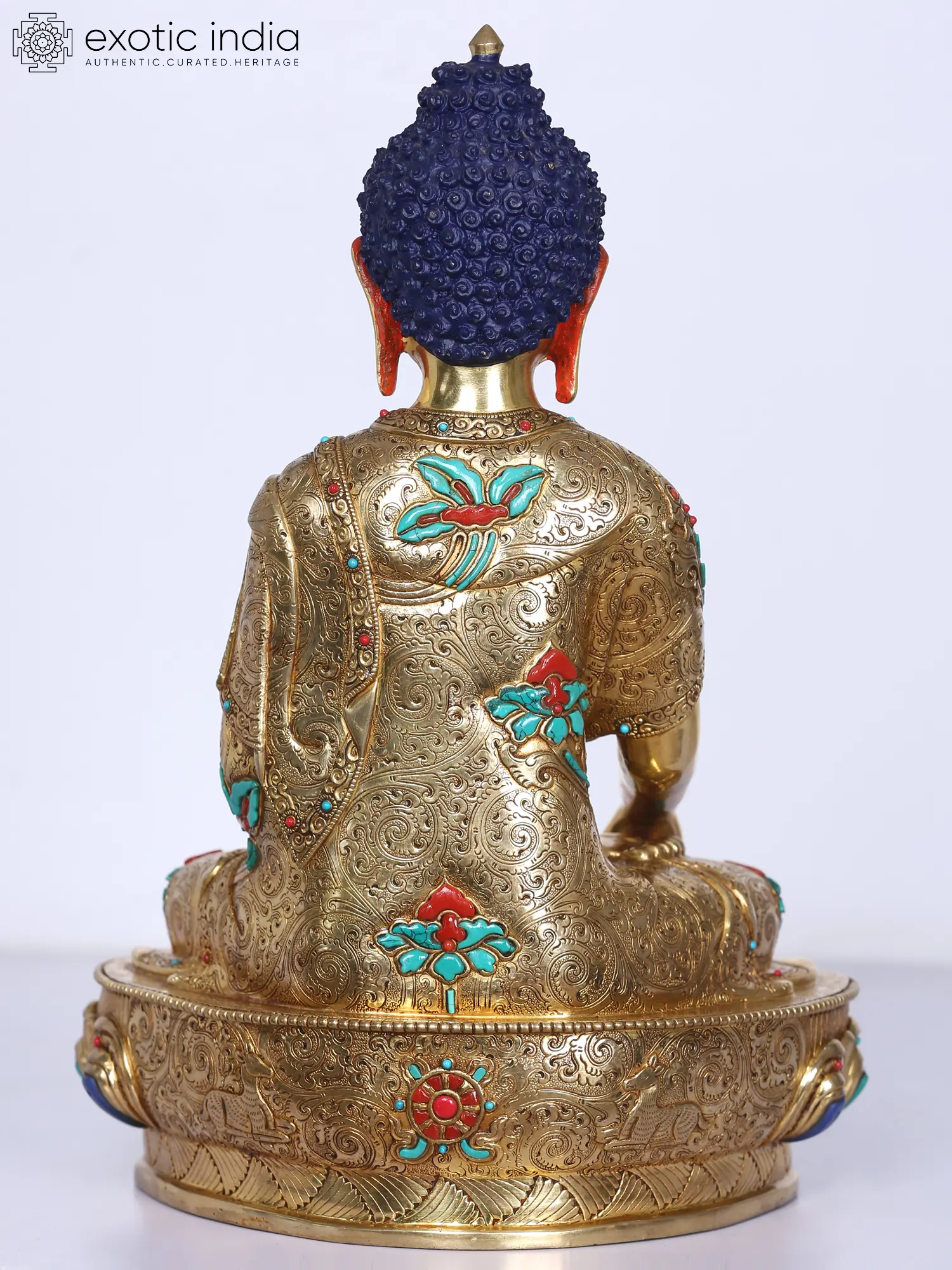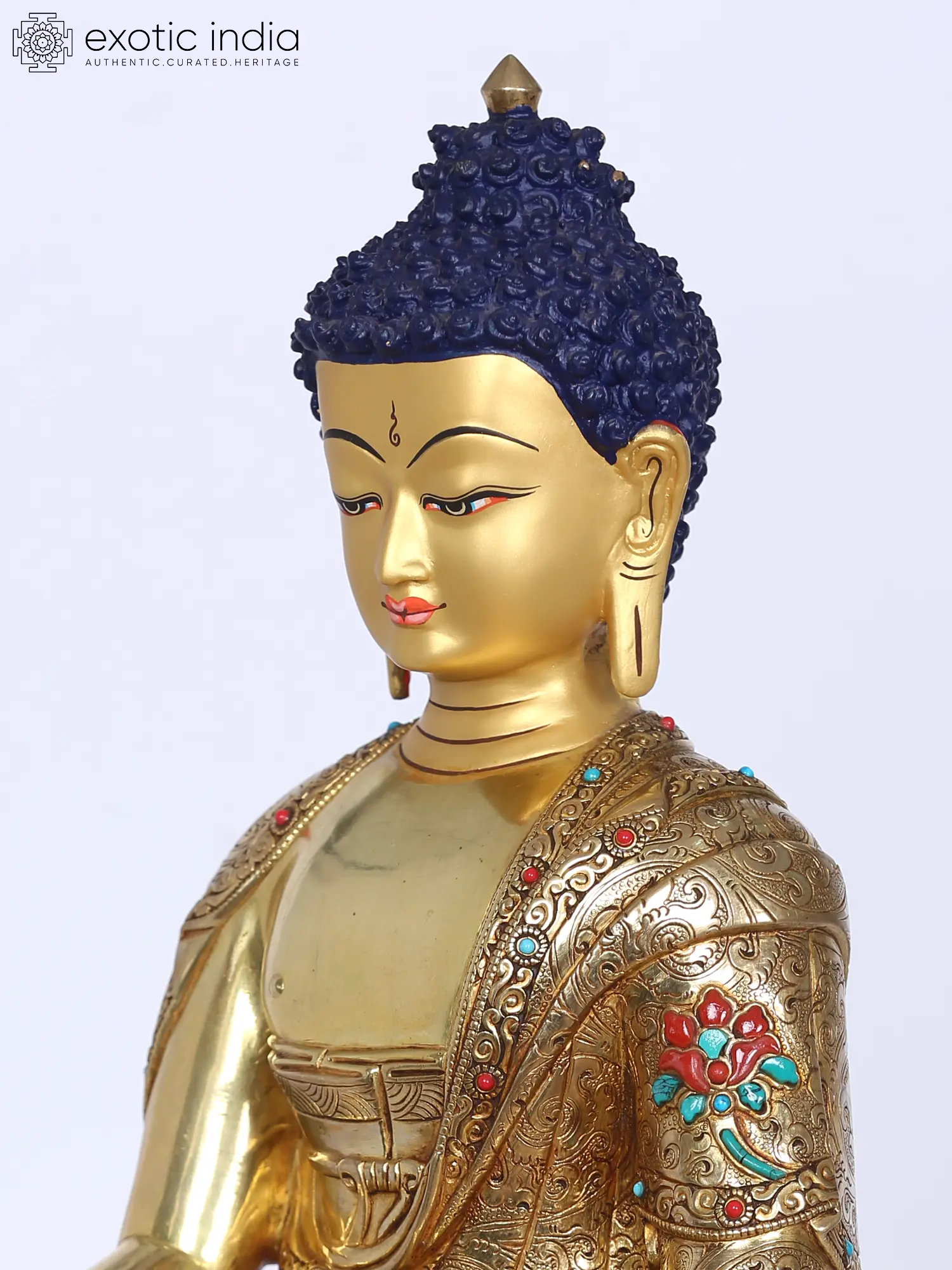 The traditional iconography of Nepal is used in this stunning gilded copper statue to depict the oceanic stillness of Buddha Shakyamuni (the Shakya ascetic), in his Bhumi-sparsha aspect. The Bhumi-sparsha or earth-touching gesture of Buddha narrates the episode of Buddha defeating the forces of Mara, the demon of desire. Mara challenged Buddha to prove his worth as an enlightened being, and as an answer, Tathagata called upon the universal witness, goddess earth, or Vasudhara to become his witness.