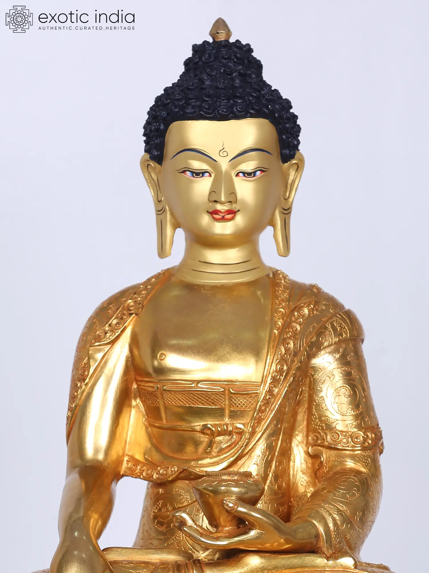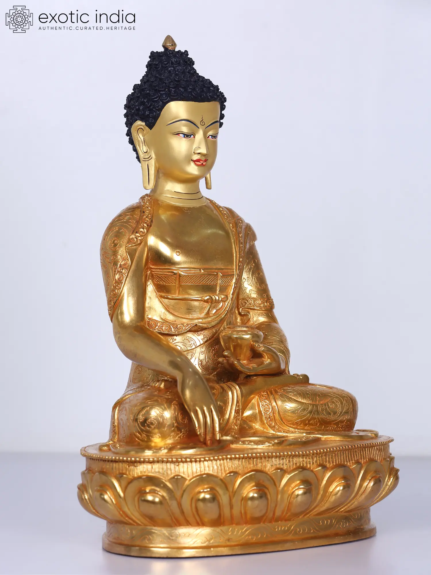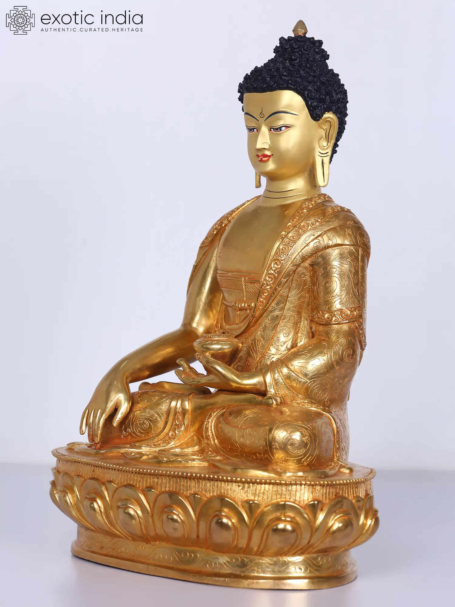 On a glowing Padmasana or lotus throne that symbolizes the sprouting of wisdom, Shakyamuni- the great ascetic of the Shakya clan, Buddha is depicted in this gilded copper statue from Nepal. He is holding an alms bowl in his left hand and his right hand in the gesture of touching the Earth. He wears a gorgeously sculpted monk's robe and is infused with signs of perfection. His curled hair is meticulously delineated, with the Ushnisha (cranial bump) and Urna (mark on the forehead) symbolising his pure wisdom.