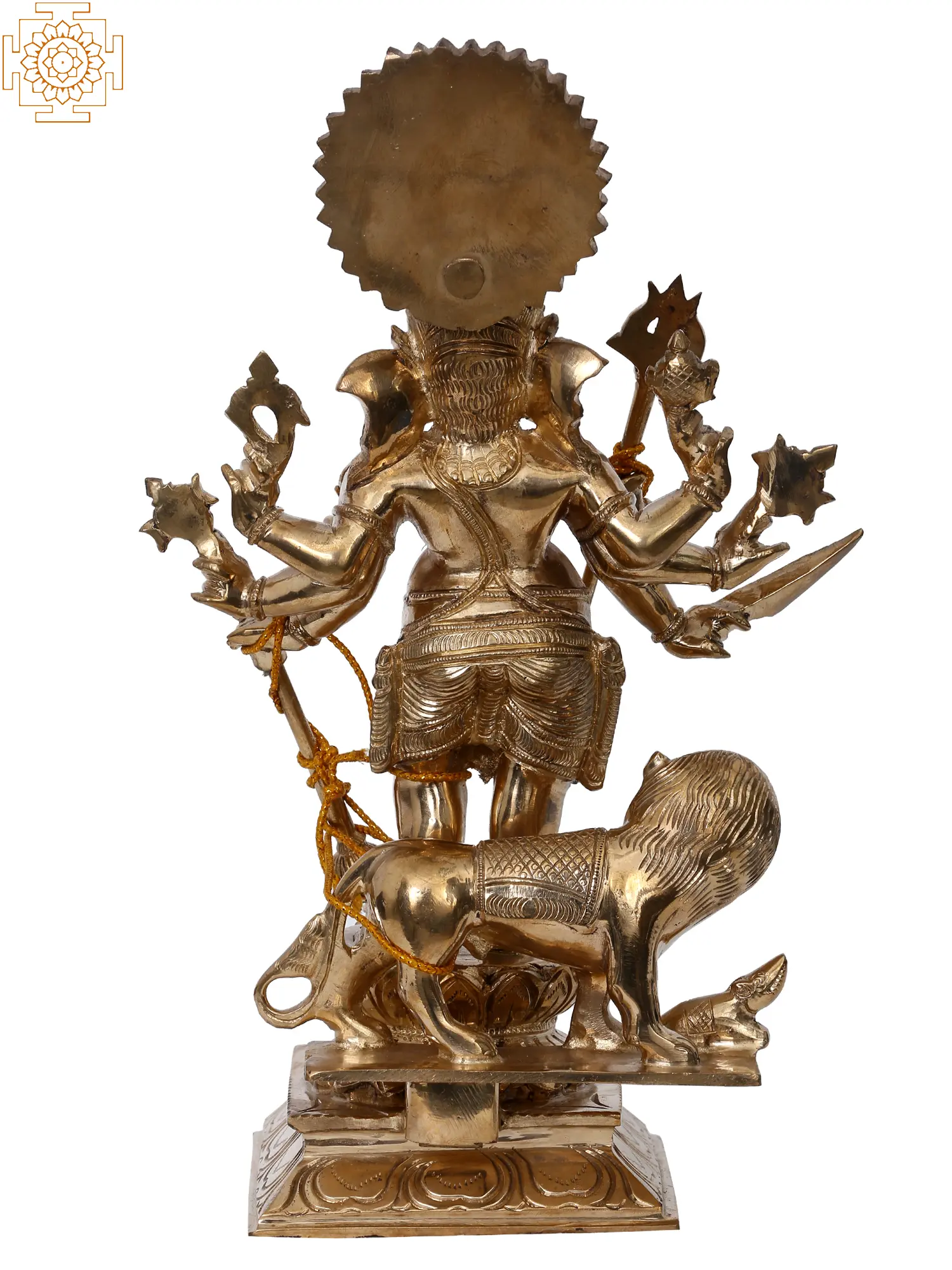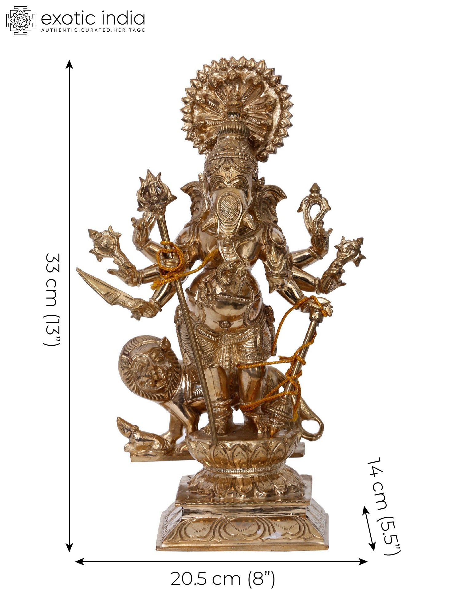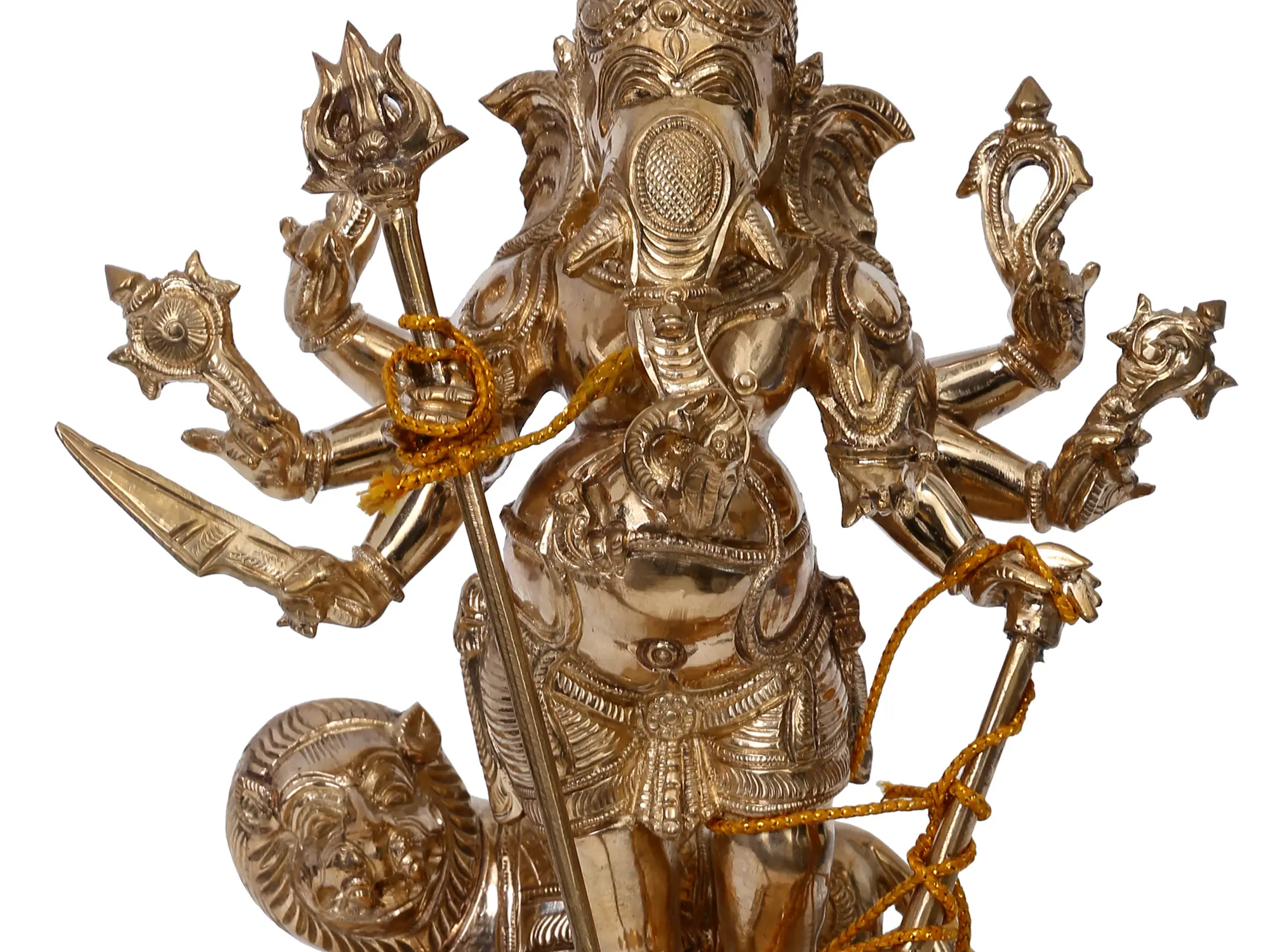 In the divine tapestry of mythology, “Sinha Ganpati” emerges as a celestial masterpiece, standing proudly on a lotus pedestal. With eight hands gracefully orchestrating cosmic energies, Lord Ganesha, “the harbinger of Success and good fortune”, wields a trident (Trishul), a goad, a noose, a discus, a conch shell, a sword, a mace, and a pot of jewels, each symbolising his mastery over cosmic forces. Adorned in regal splendour, “Sinha Ganpati” wears the sacred thread “Yajnopavita”, a royal crown, and resplendent jewellery. Behind him, a lion, the epitome of strength, stands as his loyal guardian. This divine artwork, crafted in brass, signifies the harmonious convergence of power, protection, and regality, encapsulating the boundless majesty of Sinha Ganpati.