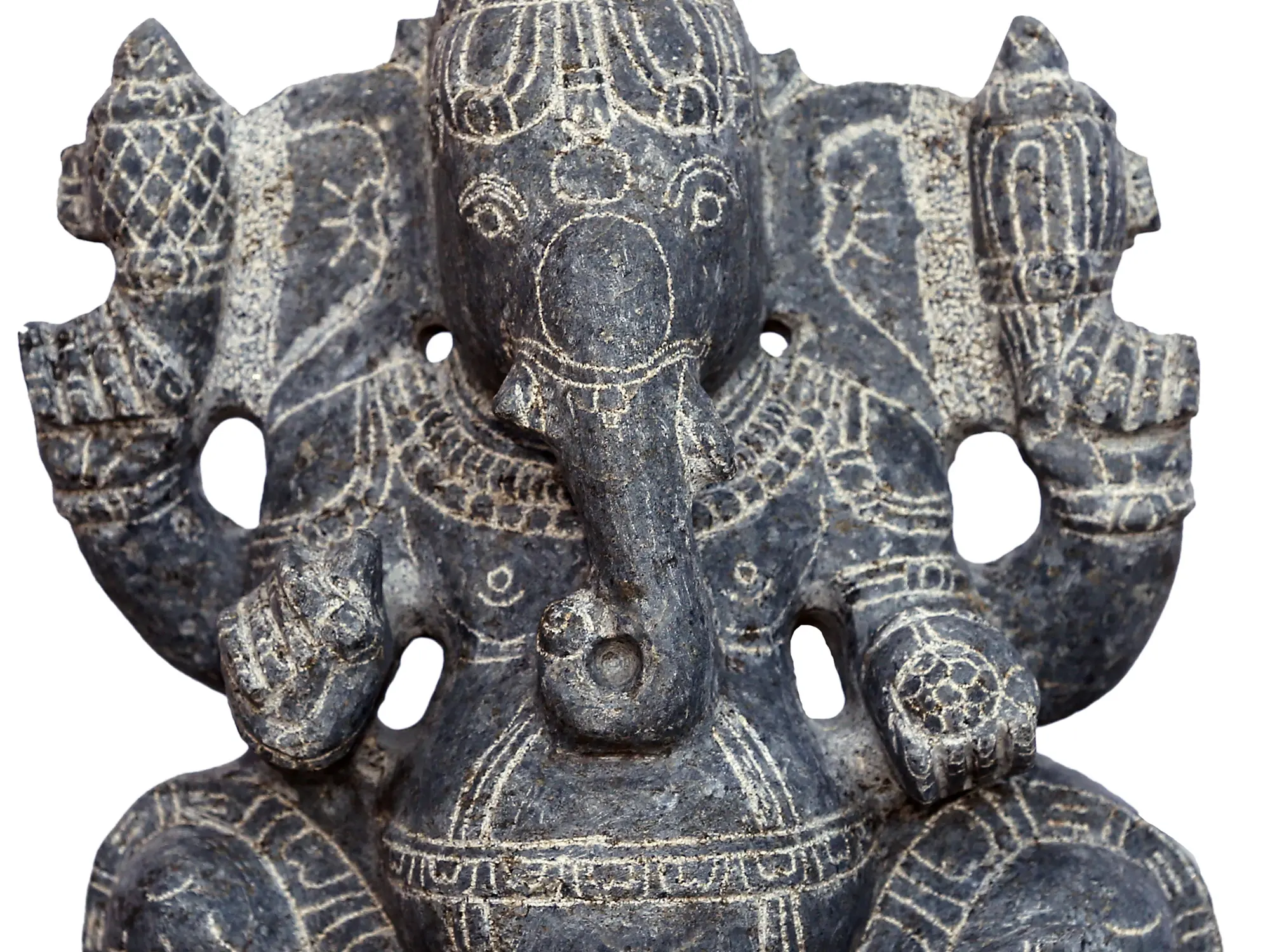Each of Ganesha's four limbs bears precious artifacts representing his blessings: a modak (sweet) for rewards, a Goad for controlling the mind and cravings, a noose to direct followers, and abhaya mudra.