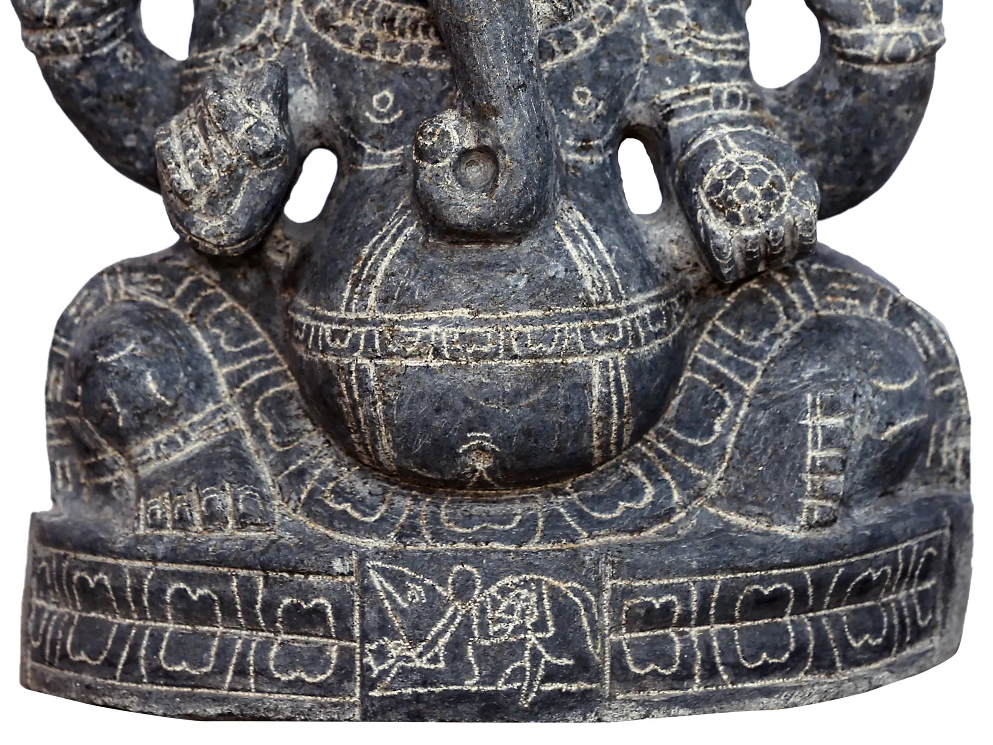 This Chaturbhuja Ganesha huge granite statue is represented sitting with four arms, representing his divine powers and ability to overcome difficulties.