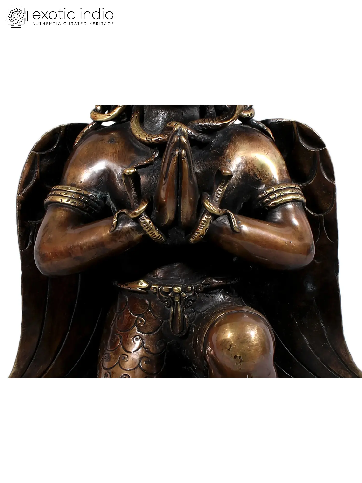Garuda is the divine mount of the great Lord Vishnu. Traditionally, He is portrayed as seated on a single knee with His hands folded in namaskaram mudra. His wings are shut, unless Vishnu-Lakshmi are a-mount each shoulder.