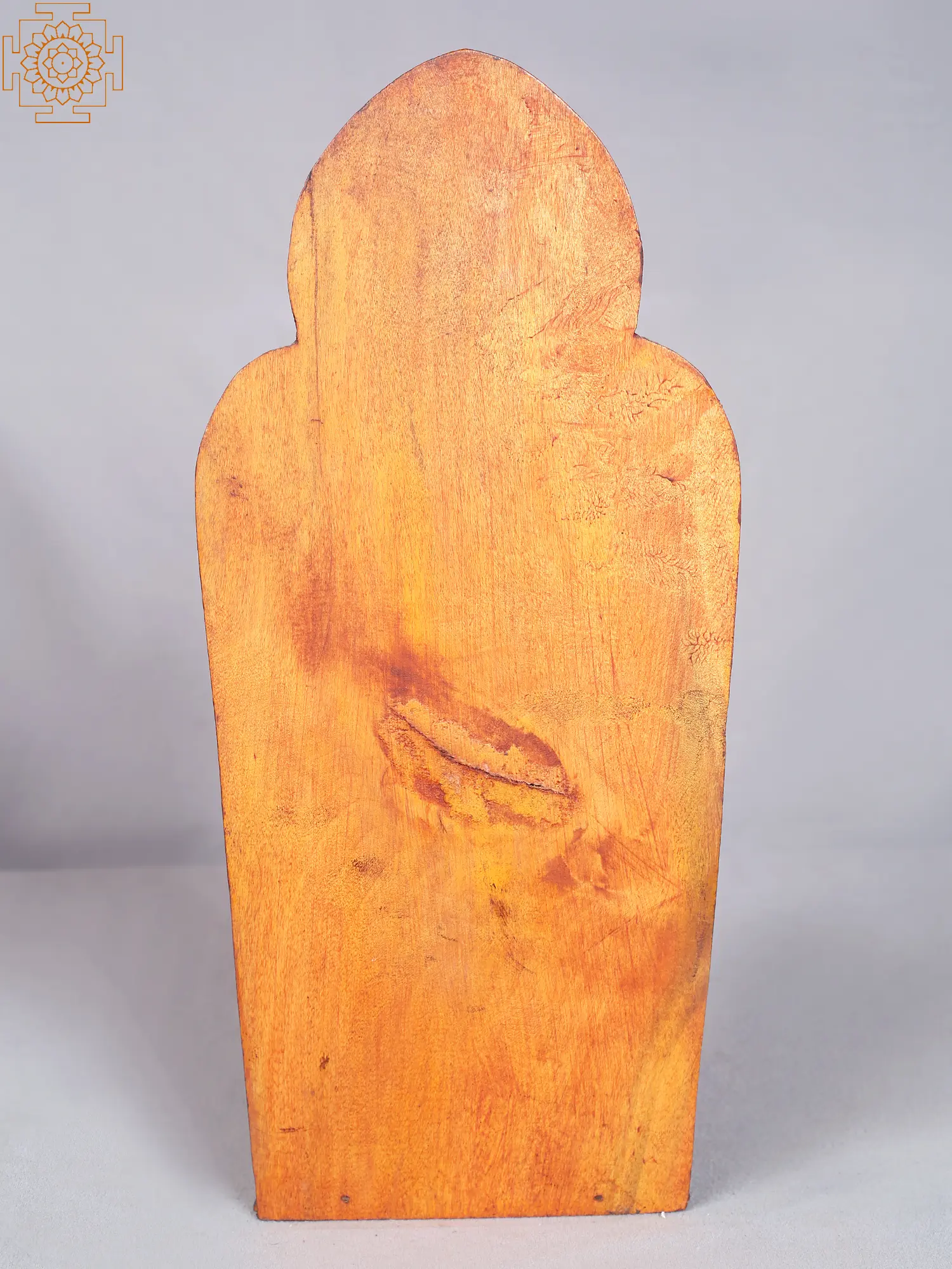 This exquisite wooden carving, a testament to the rich artistic heritage of Nepal, captures a moment of profound grace and spiritual elevation. Carved from a single piece of wood, its warm, natural tones and intricate detailing evoke a sense of timeless beauty. The figure stands in a pose that suggests both reverence and dance, a harmonious blend of earthly movement and celestial connection. Her serene expression, downcast eyes, and gentle smile invite contemplation and a sense of inner peace. The artistry extends to every element, from the delicate rendering of her jewelry and headdress to the flowing folds of her garments. The elaborate border framing the figure, with its leaf-like motifs and beaded patterns, accentuates her divine presence and adds a regal aura to the piece. The smooth finish of the wood highlights the skilled craftsmanship, making this statue a tactile as well as visual delight. It is a piece that speaks of devotion, artistry, and the enduring spirit of Nepalese culture, often drawing inspiration from the sacred and the symbolic.
