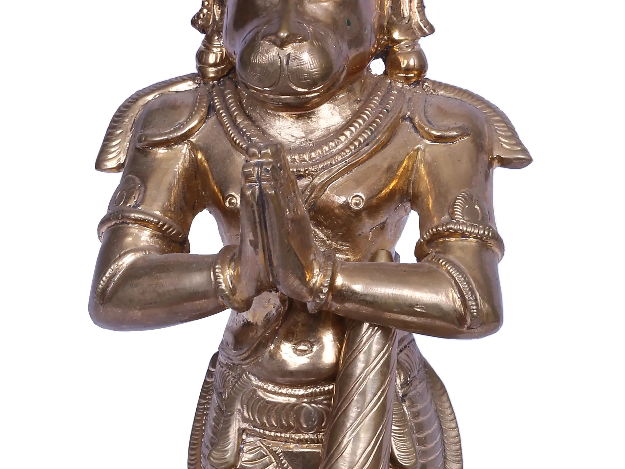 Such a stance is indicative of gentleness and devotion. Typically, the Hanuman idol for pooja may depict Him as a soldier and a fighter (Bajrangbali Hanuman statue), but the one you see on this page shows the bhakta (devotee) side of Him. It is made from panchaloha, an alloy whose precious gold and silver content delivers an inimitable metallic finish.