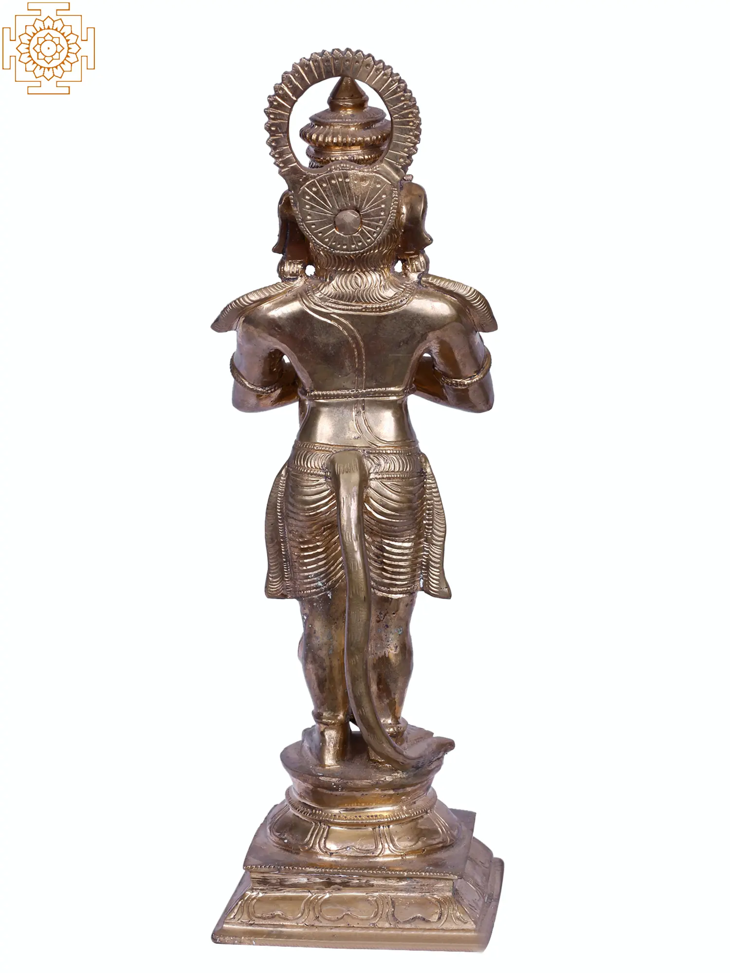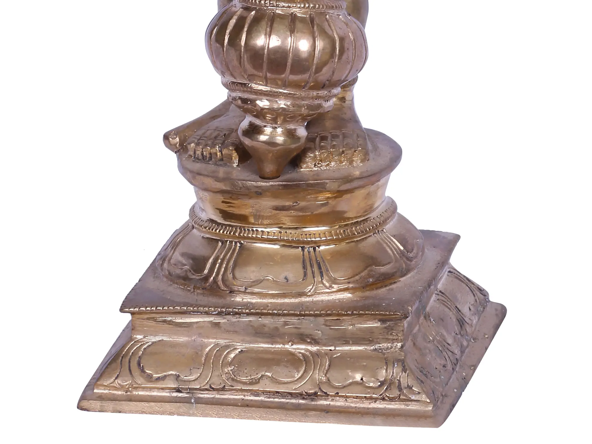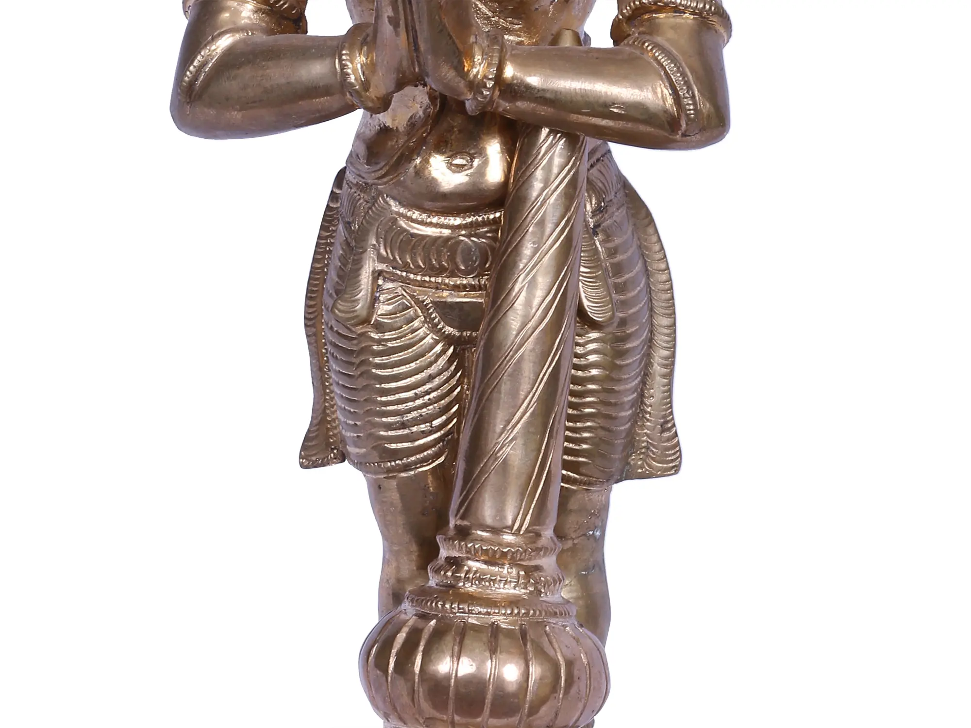 This panchaloha Hanuman statue bronze is a collector’s item. From amongst all the Hanuman sculptures at Exotic India, this one stands out because of its expressiveness and stateliness. On a traditional multi-tiered pedestal stands the loving servant of Lord Rama. His goad rests head downwards between His feet and His hands are joined in the namaskaram mudra.