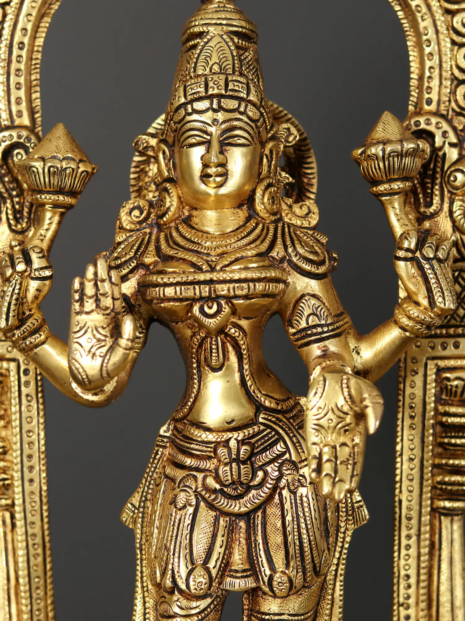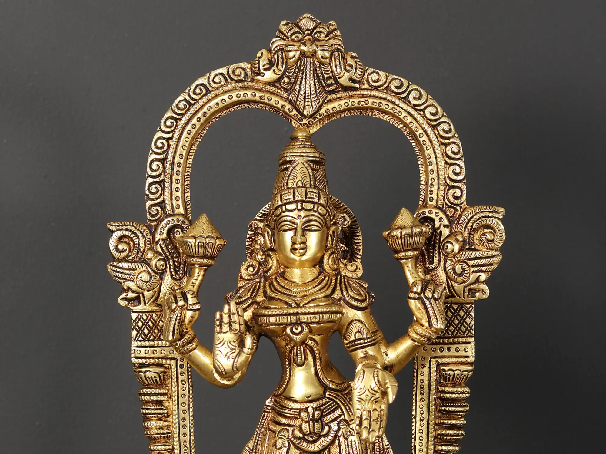 This exquisite brass set captures the essence of divine harmony and prosperity, featuring Lord Vishnu and Goddess Lakshmi standing resplendent on a Kirtimukha throne. The Kirtimukha, meaning "face of glory," is a motif in Indian art symbolizing auspiciousness and warding off evil, its benevolent gaze overseeing this sacred pairing. This detailed craftsmanship in brass evokes the rich spiritual heritage of India, making it a truly remarkable addition to any devotional space or as a statement piece of cultural art.
