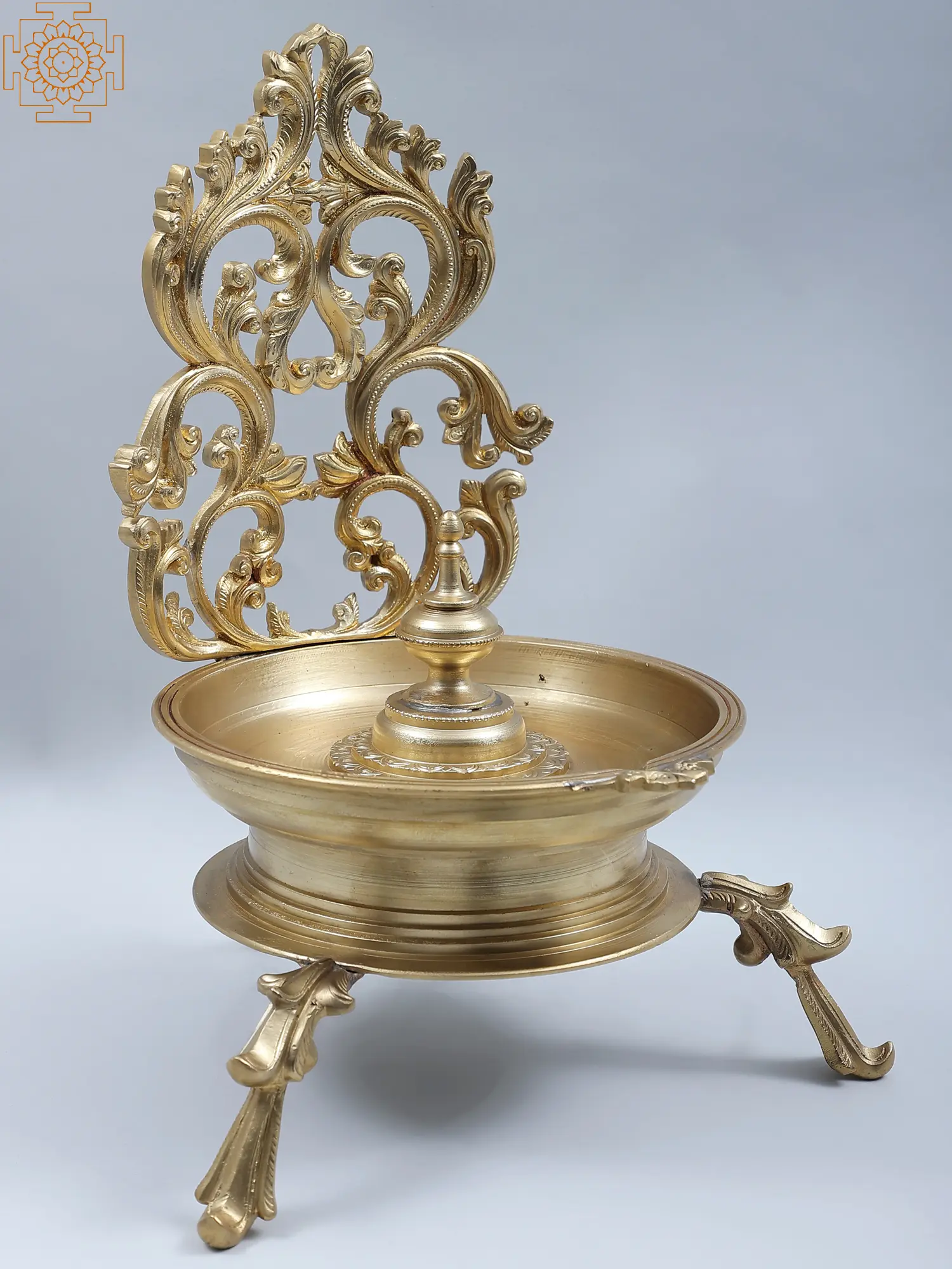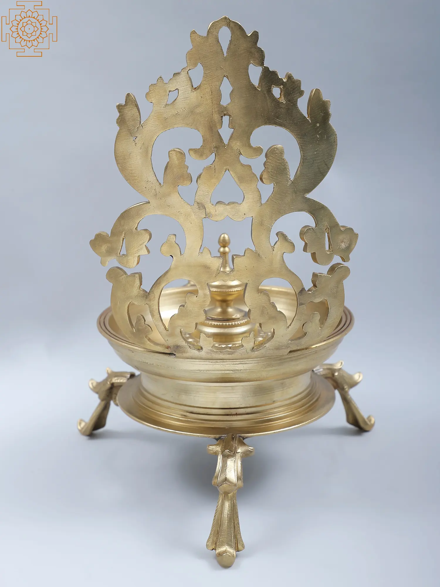This Hoysala-style classic bronze oil lamp may also be used as an Urli. This lamp has a beautiful wick and a center circular oil pan. A center motif of coiling vines adds to the attractiveness of the light. The lamp is supported by three leaves-themed supports. This magnificent piece is a monument to the Hoysala craftsmen's superb accuracy, conveying the grandeur and cultural legacy of a bygone period via a beautiful combination of metal and craftsmanship.