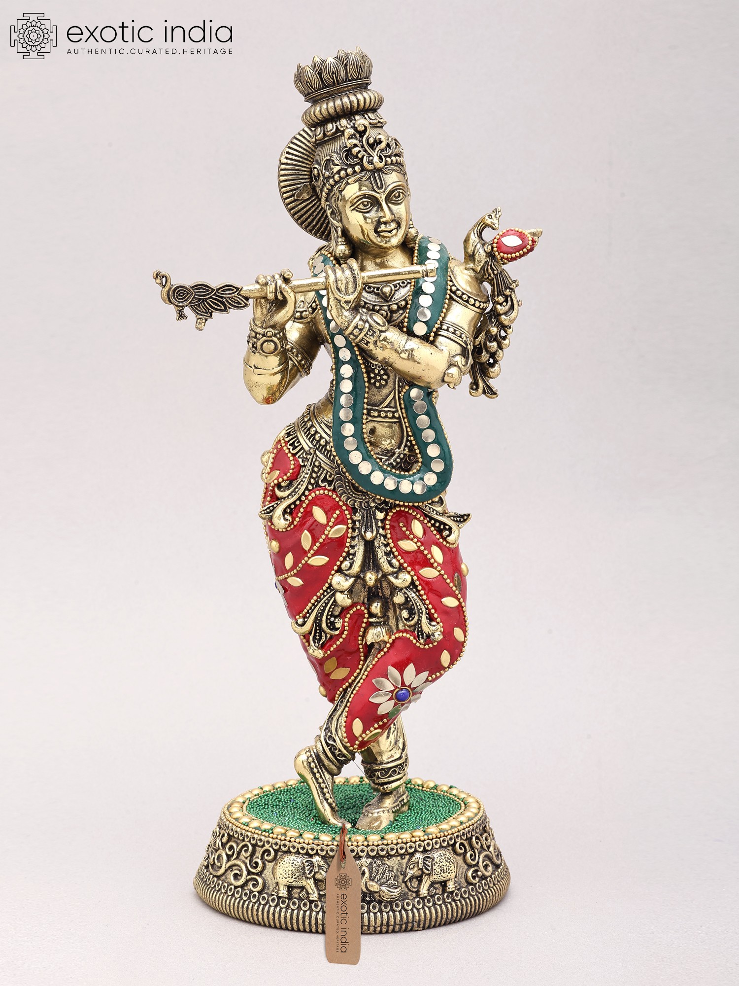 17" Brass Lord Krishna Playing Flute on Lotus Pedestal