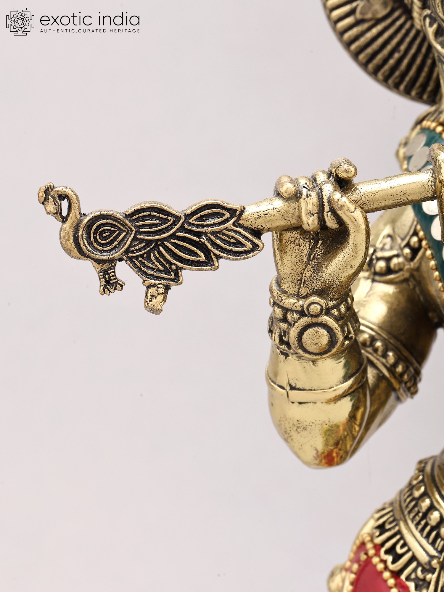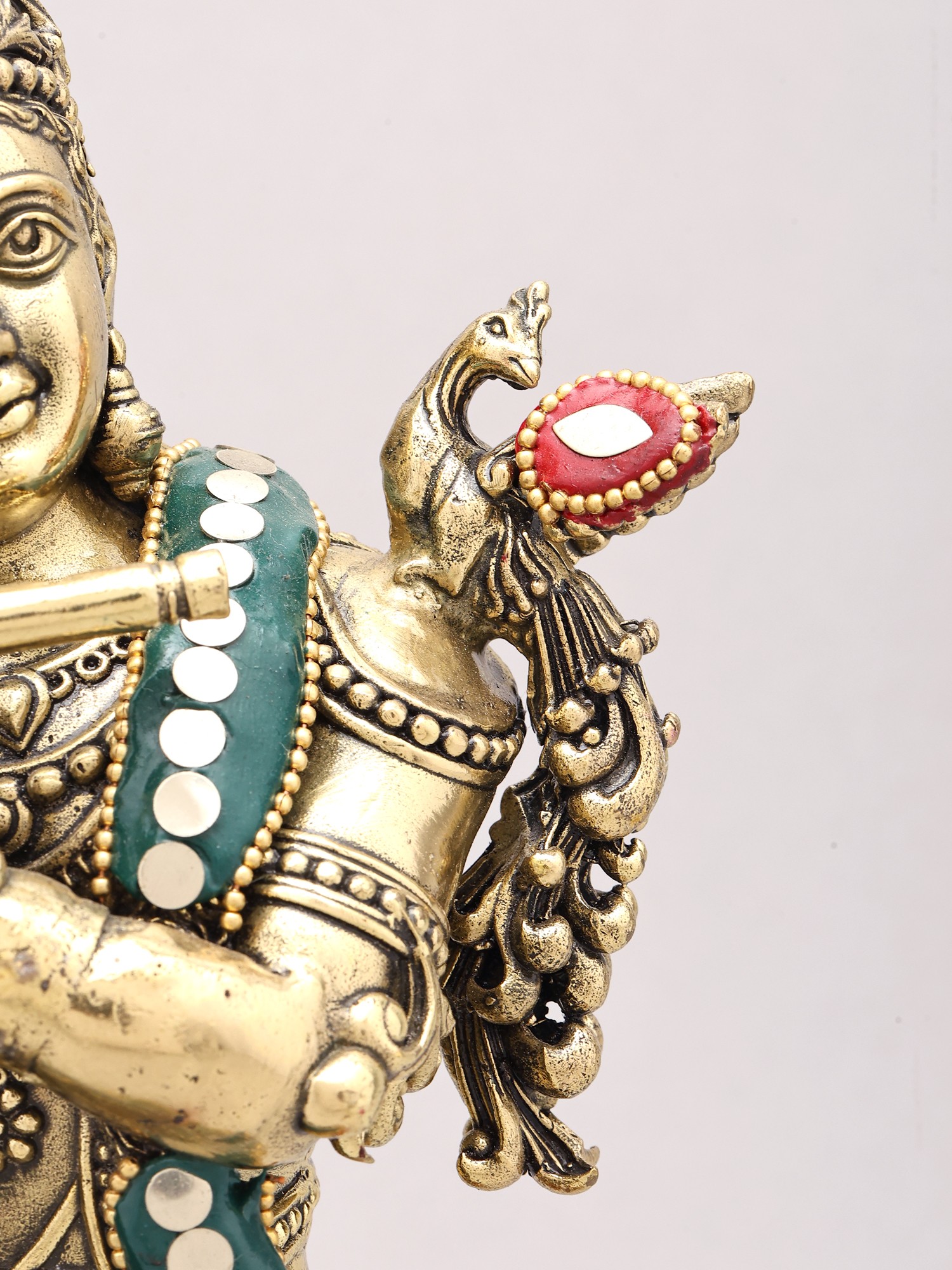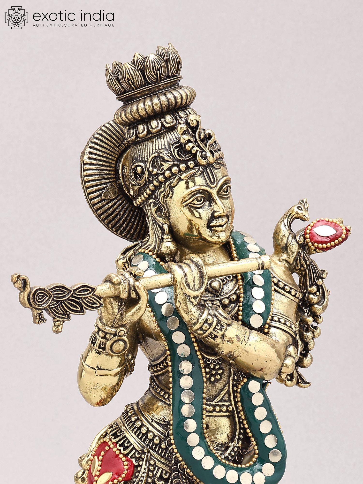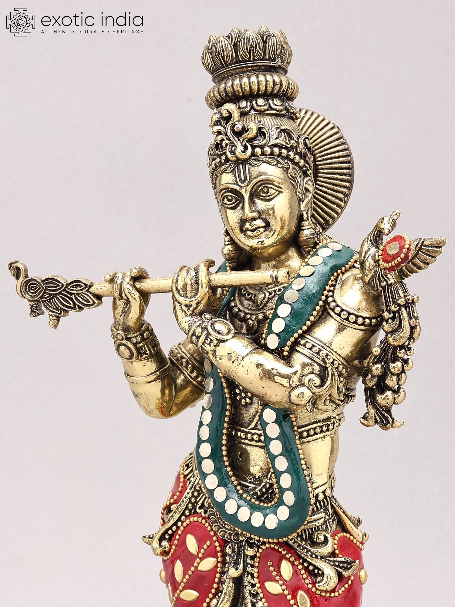 Depicts Lord Krishna, the divine flautist, in a characteristic pose.