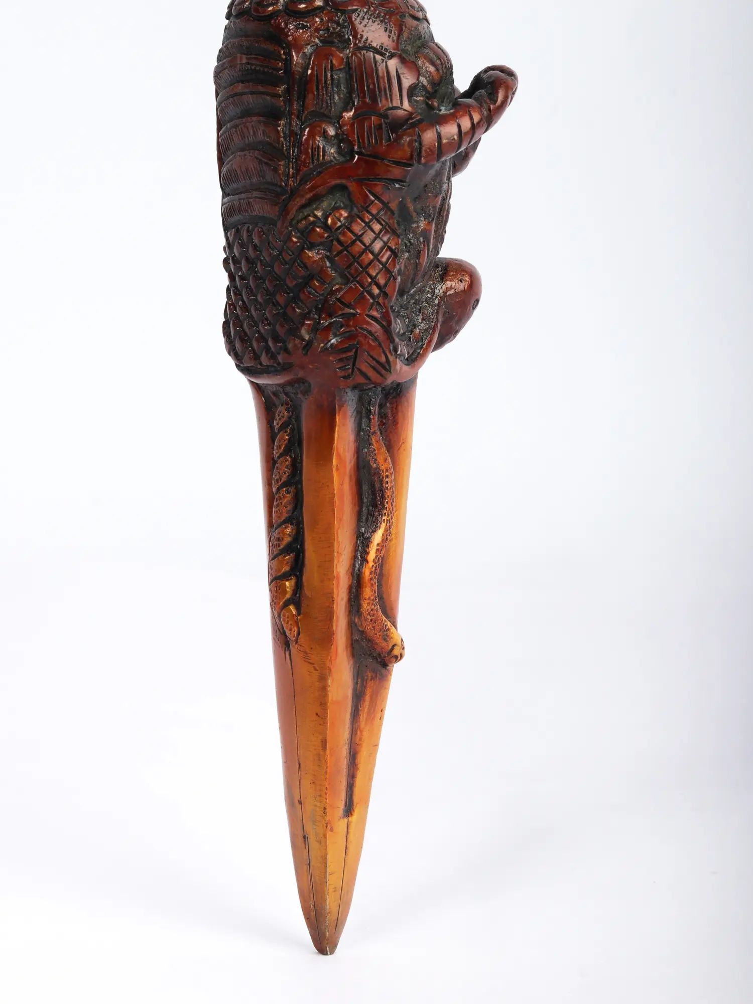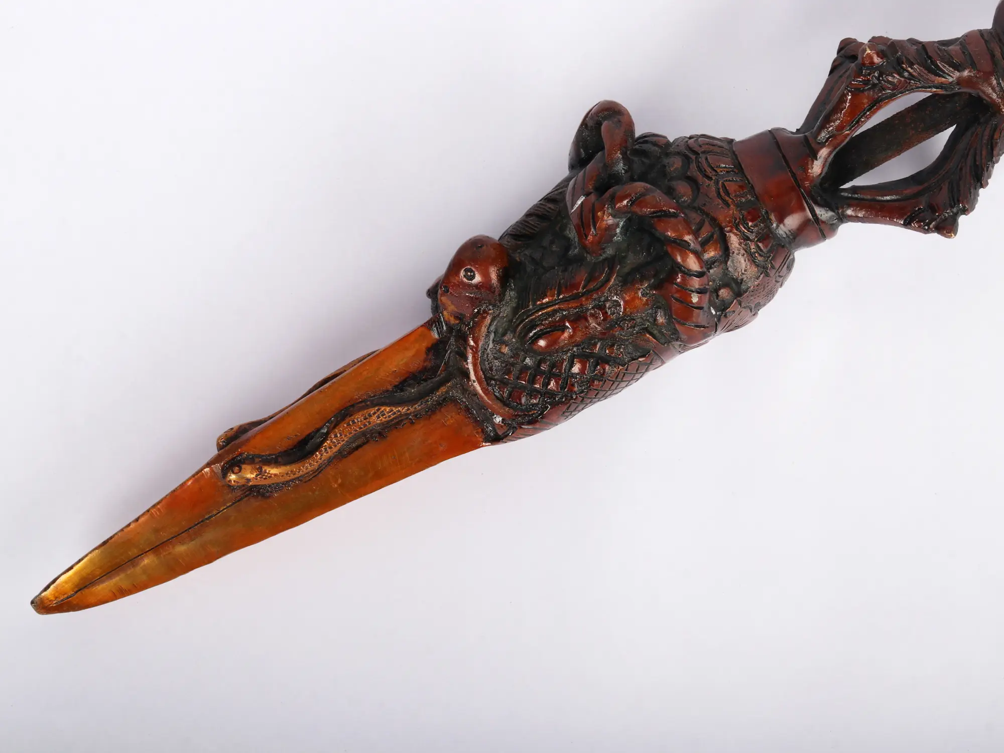 The Phurpa, also known as a kīla in Sanskrit, is a ritual dagger or stake used in Vajrayana Buddhism for various tantric practices. It symbolizes the piercing of ignorance, the destruction of demonic forces, and the stabilization of the practitioner's energy. The tripartite blade of the Phurpa is said to represent the mastery over the three poisons: attachment, aversion, and ignorance. Its purpose is not to inflict physical harm but to symbolically cut through the veils of delusion and suffering, purifying the mind and transforming negative karma. The intricate details on this Phurpa, including the coiled serpent and the fierce visage often associated with Hayagriva, further amplify its symbolic power. The serpent, in many cultures, represents both danger and healing, transformation and rebirth, echoing the very nature of Hayagriva's wrathful compassion.