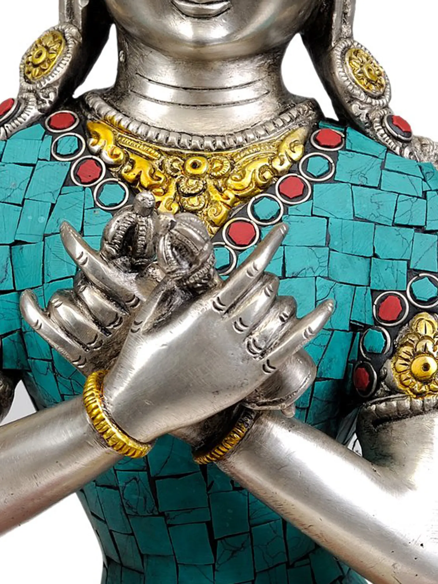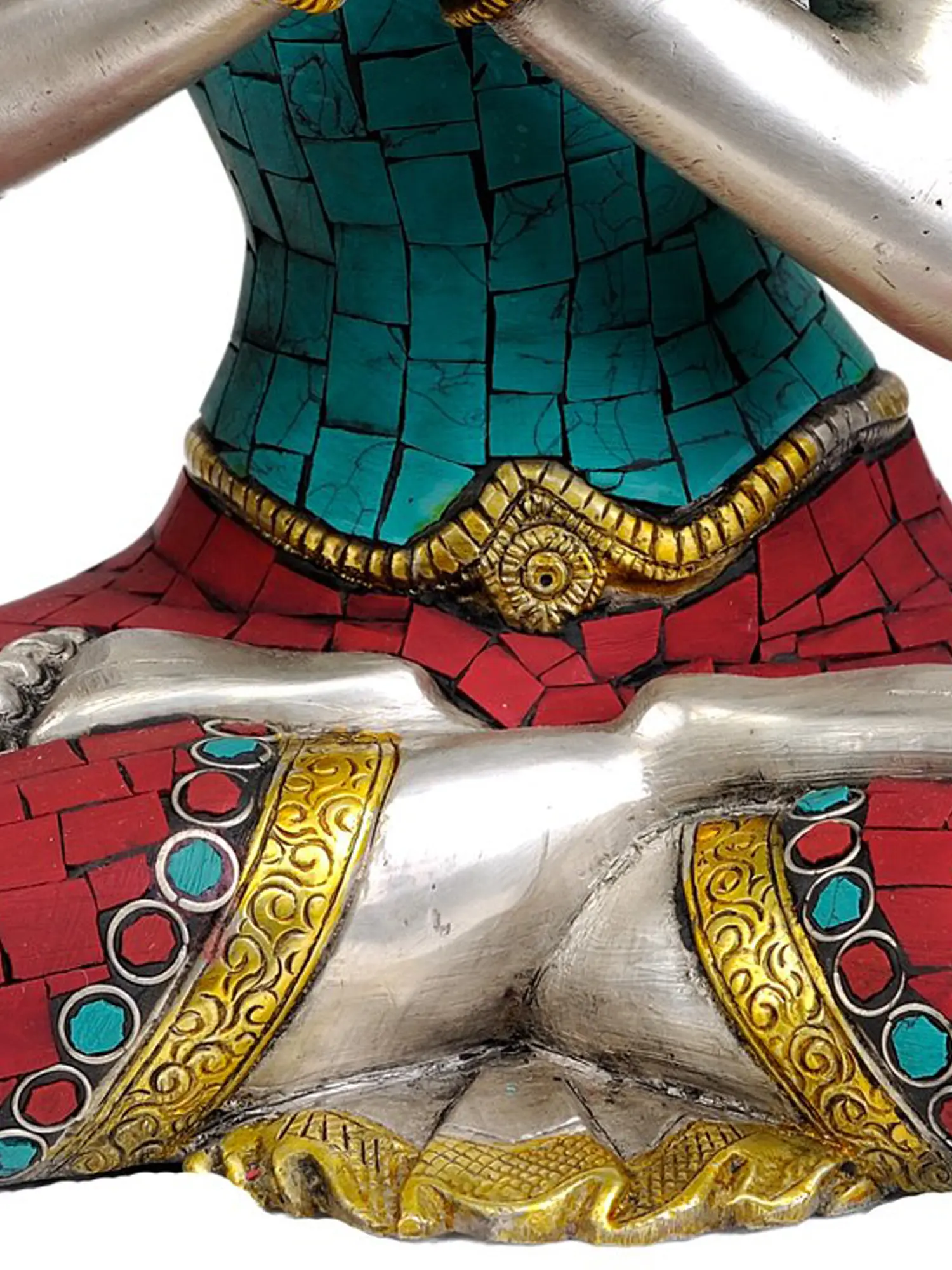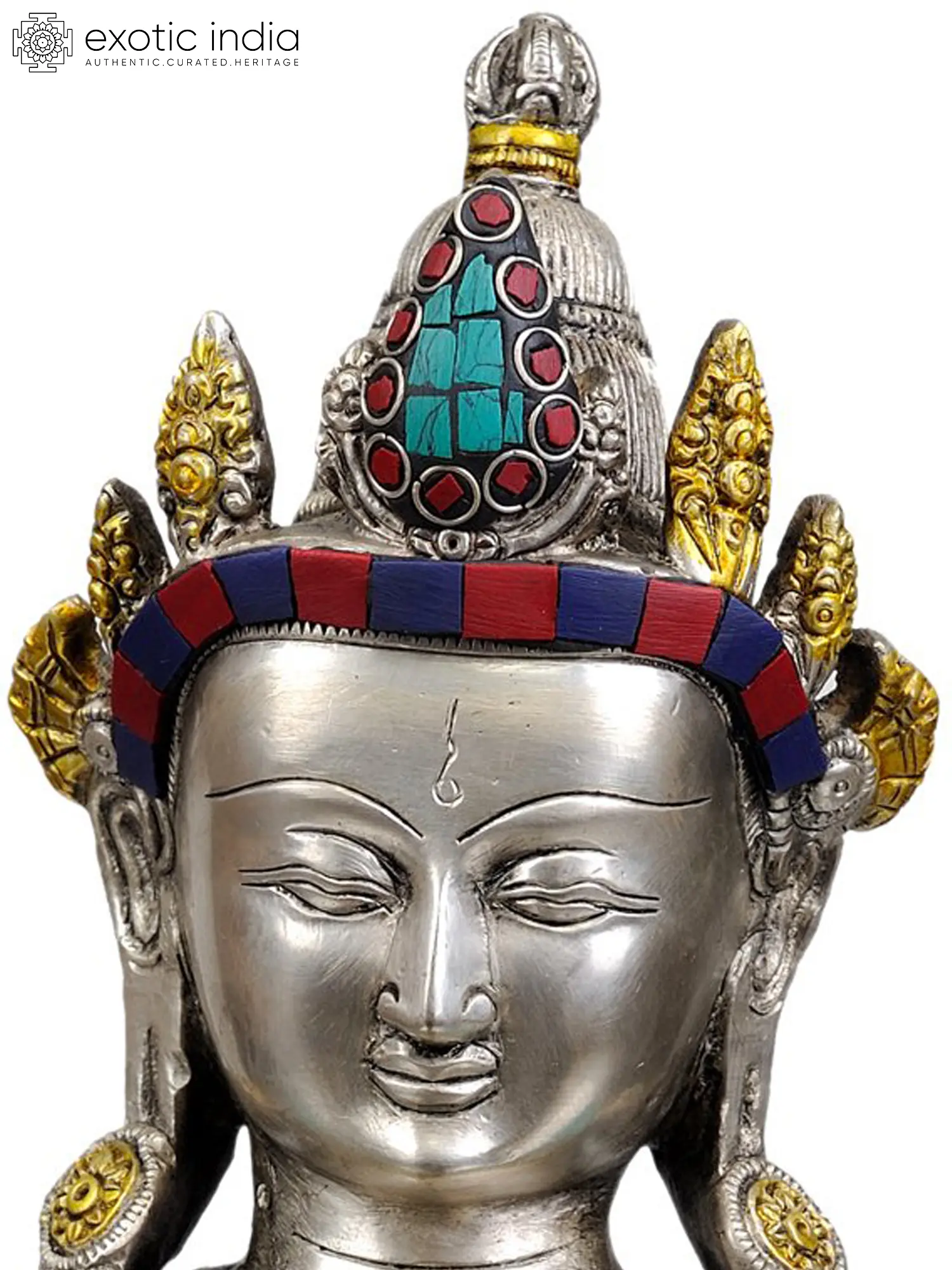 Handcrafted in India, this statue is a testament to exquisite artistry. The intricate inlay work, featuring vibrant turquoise and red stones, adds a layer of opulence and spiritual resonance. Turquoise, revered in many cultures, symbolizes wisdom, healing, and protection, while red is often associated with vitality and spiritual energy. The gleaming brass, meticulously polished, forms the foundation of this sacred image, radiating a warm, divine glow. The detailed ornamentation on the crown, robes, and jewelry further enhances its majestic presence, reflecting the celestial regalia befitting a supreme deity. Each element of this sculpture has been painstakingly created, ensuring a piece that is not only aesthetically breathtaking but also spiritually potent.