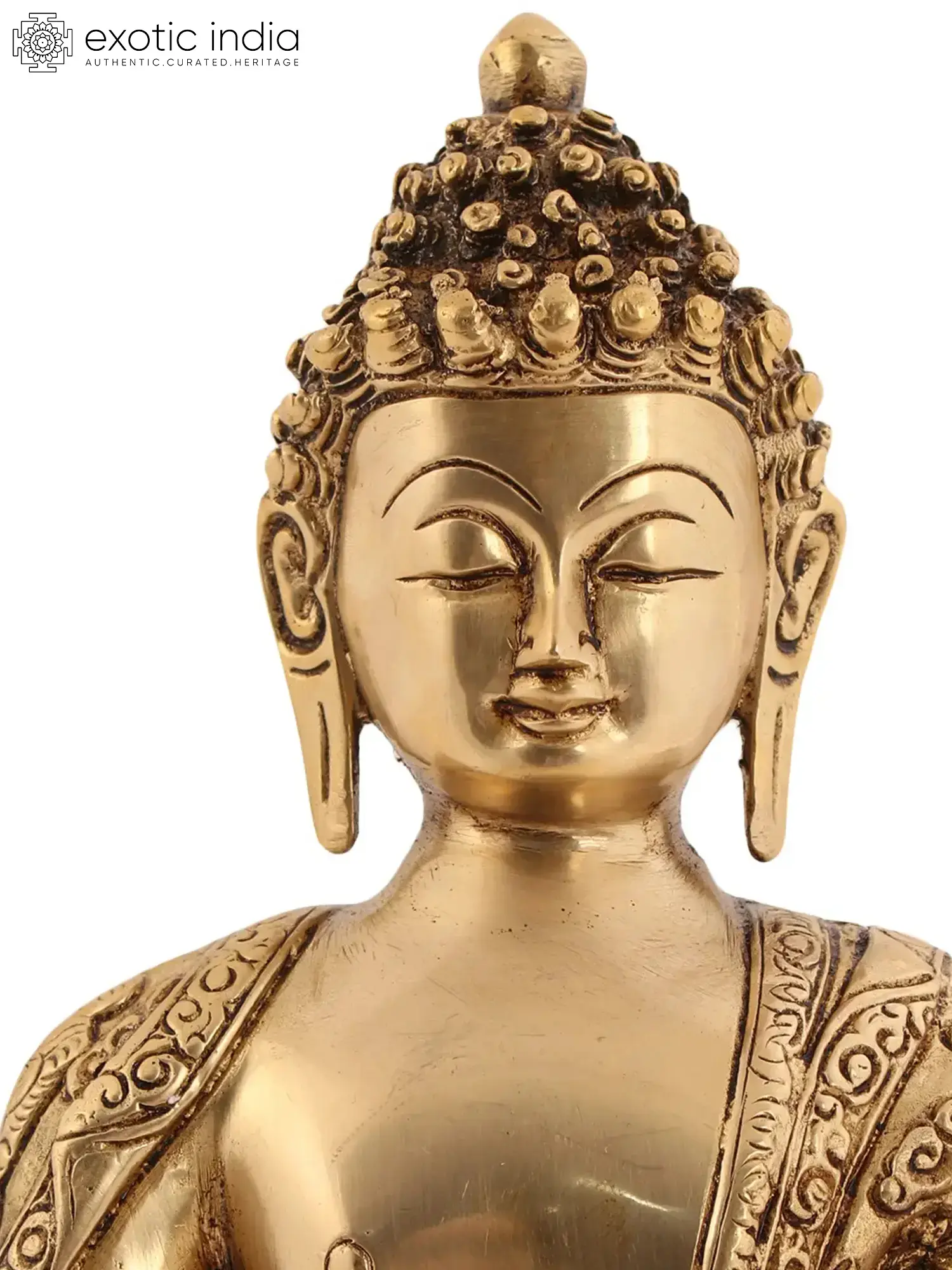 The Bhaishajyaguru murti that you see on this page is a heavily and luxuriantly carved composition. On a high plinth He sits, roughly a third of the seated figure’s stature. The robe drawn over His princely shoulders is engraved with episodes from the life of Shakyamuni. Beneath the same is a complexion of molten gold colour.
