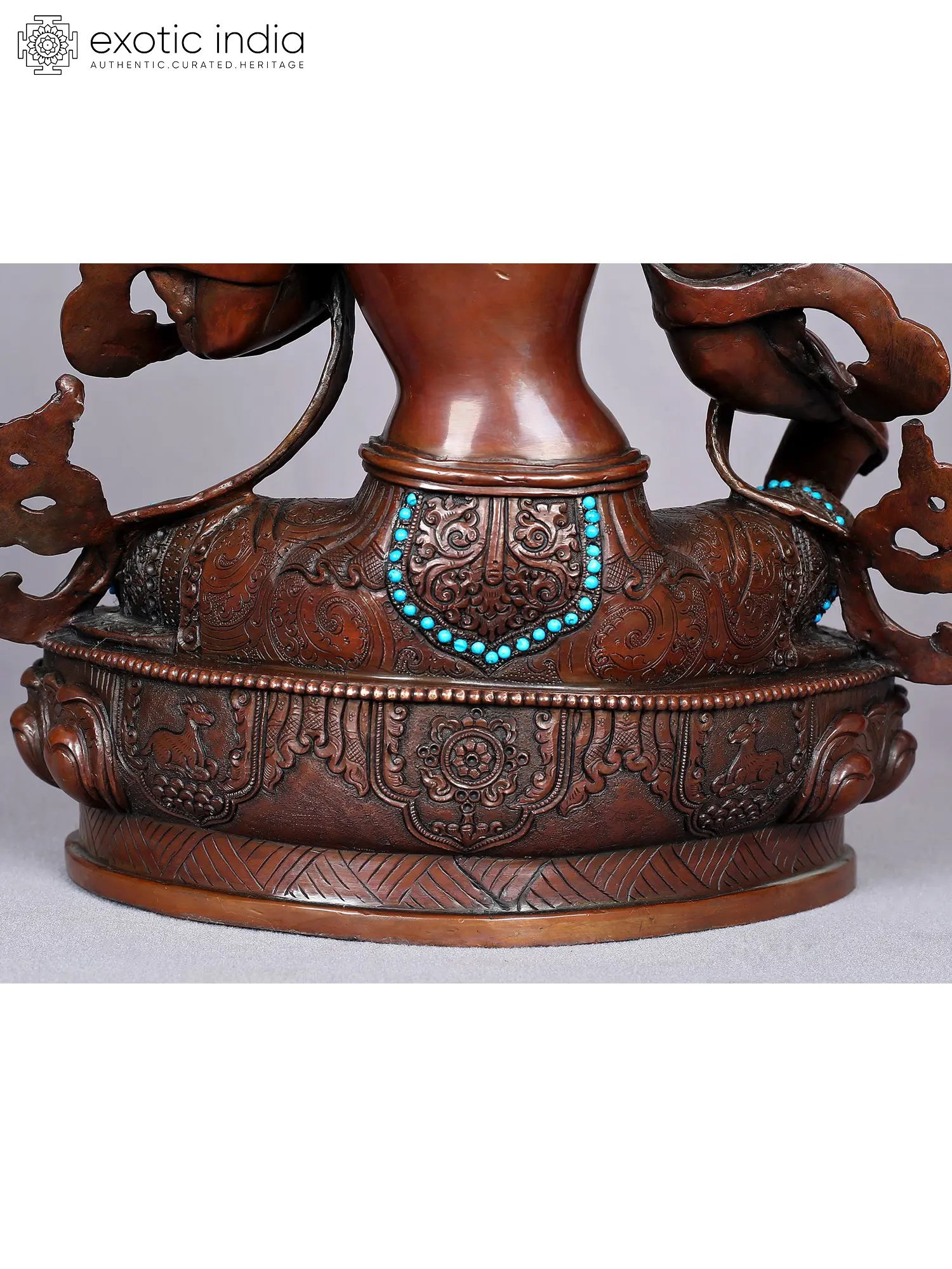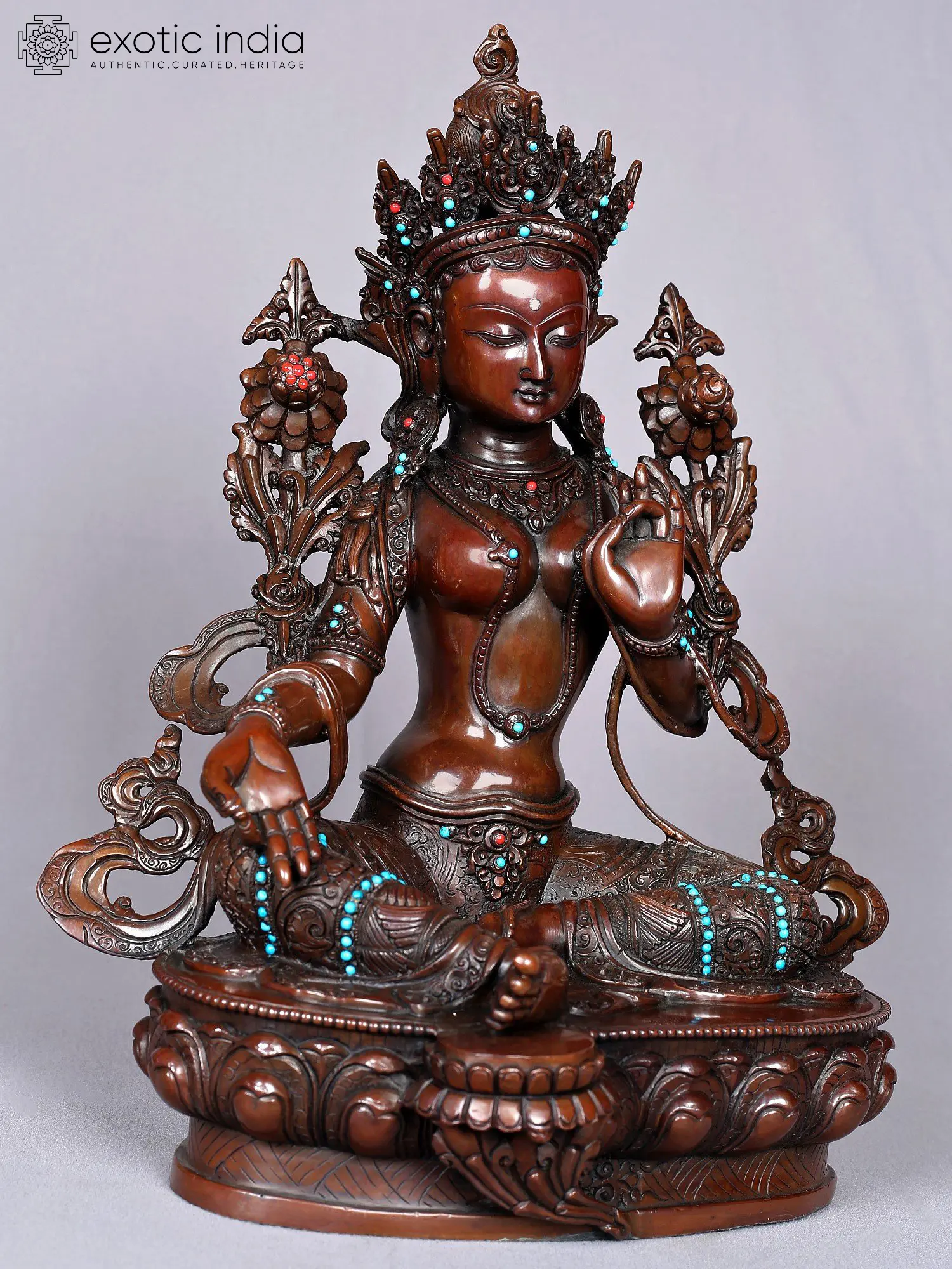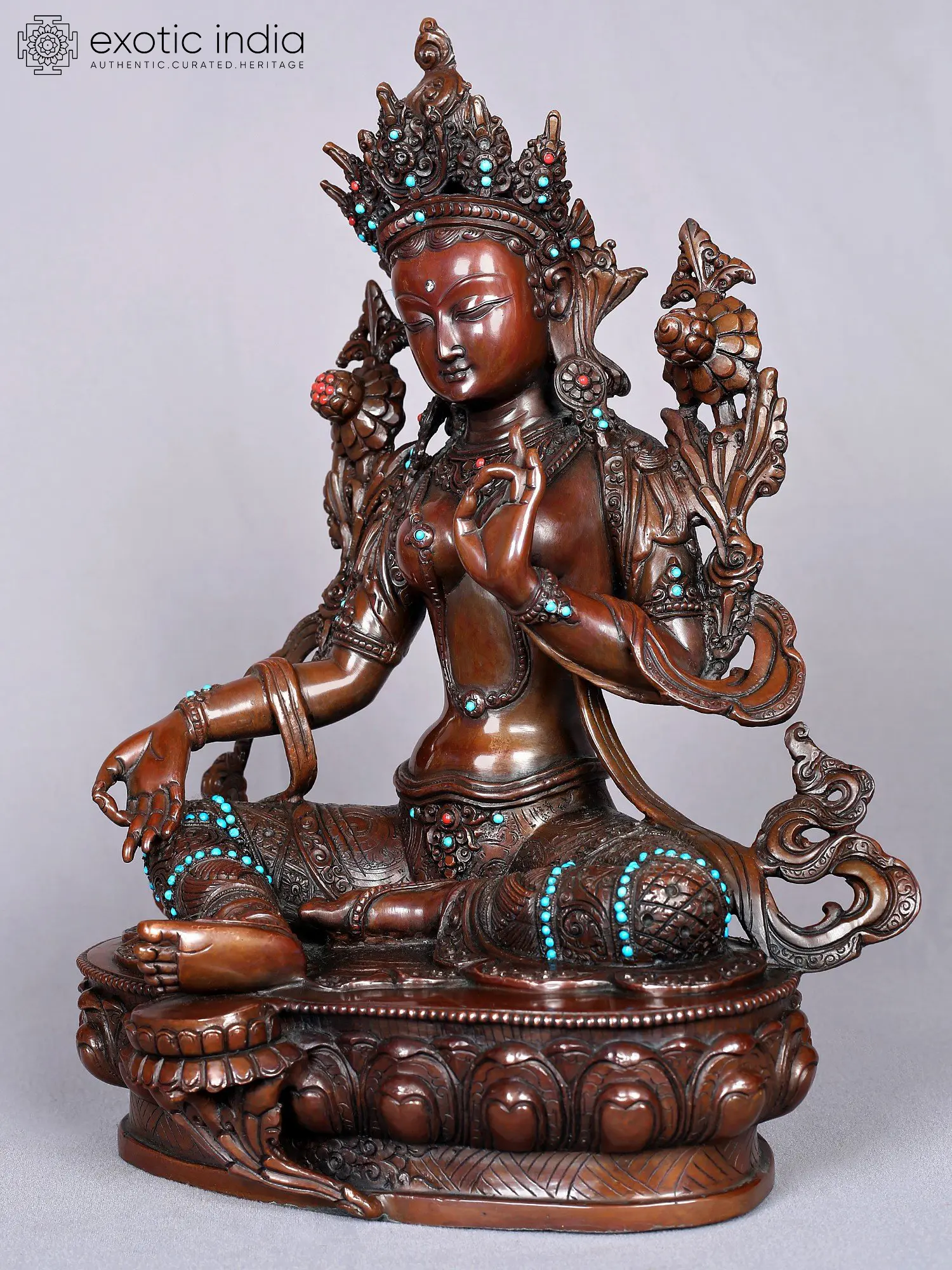 Tara, a fully enlightened female Buddha, embodies the essence of compassion and wisdom. Her enlightened presence serves as an inspiration for us to awaken our own innate Buddha nature. In her depiction, Tara's right foot is slightly extended, symbolizing her readiness to come to the aid of all sentient beings. Her right hand is open and resting on her right knee, in a gesture of boundless generosity.