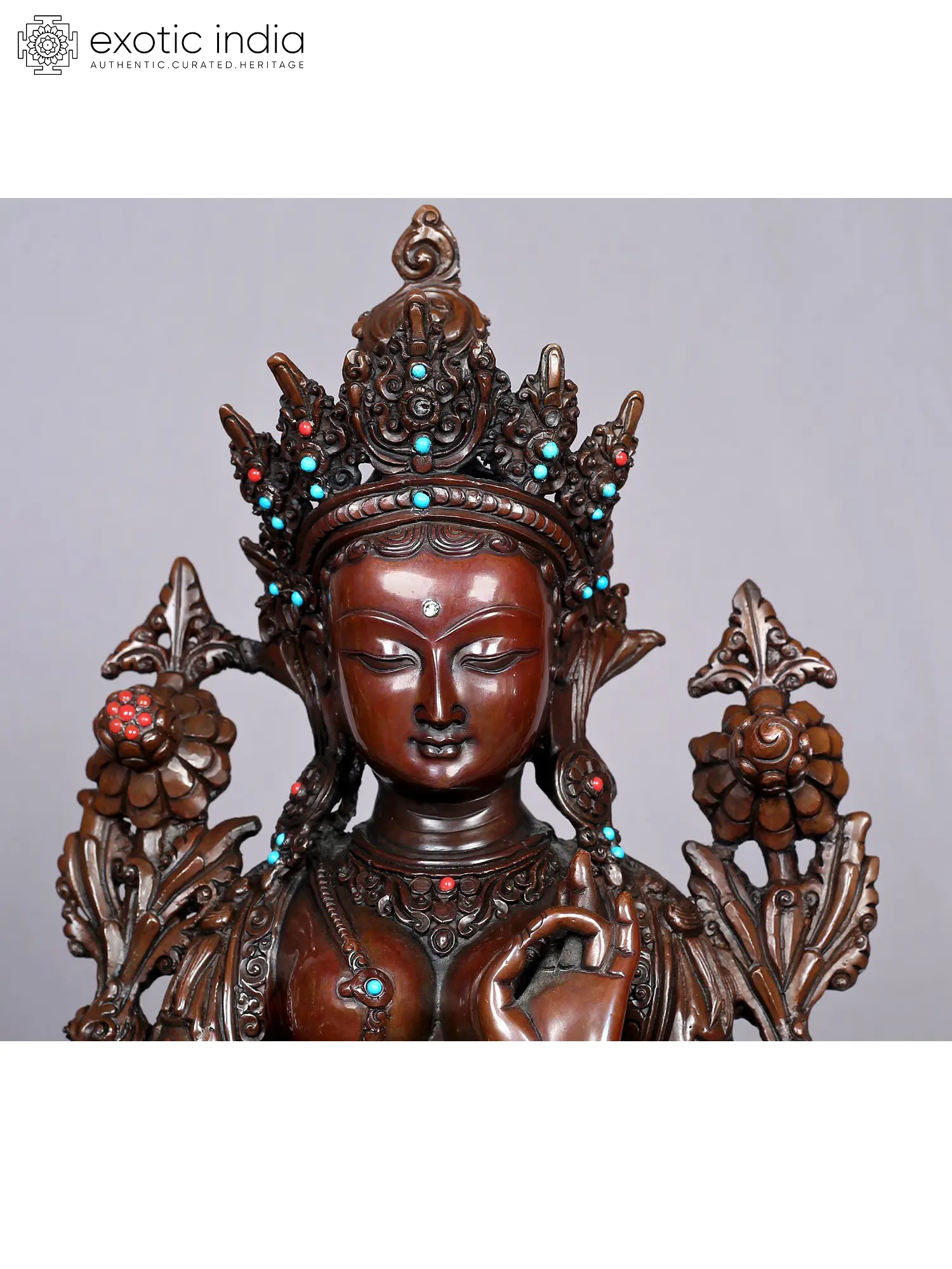 In her left hand, she gracefully holds the stem of a lotus flower, which is in full bloom next to her left ear, symbolizing purity and enlightenment. Tara's image encapsulates the virtues of compassion, wisdom, and readiness to assist all beings on their spiritual journeys.