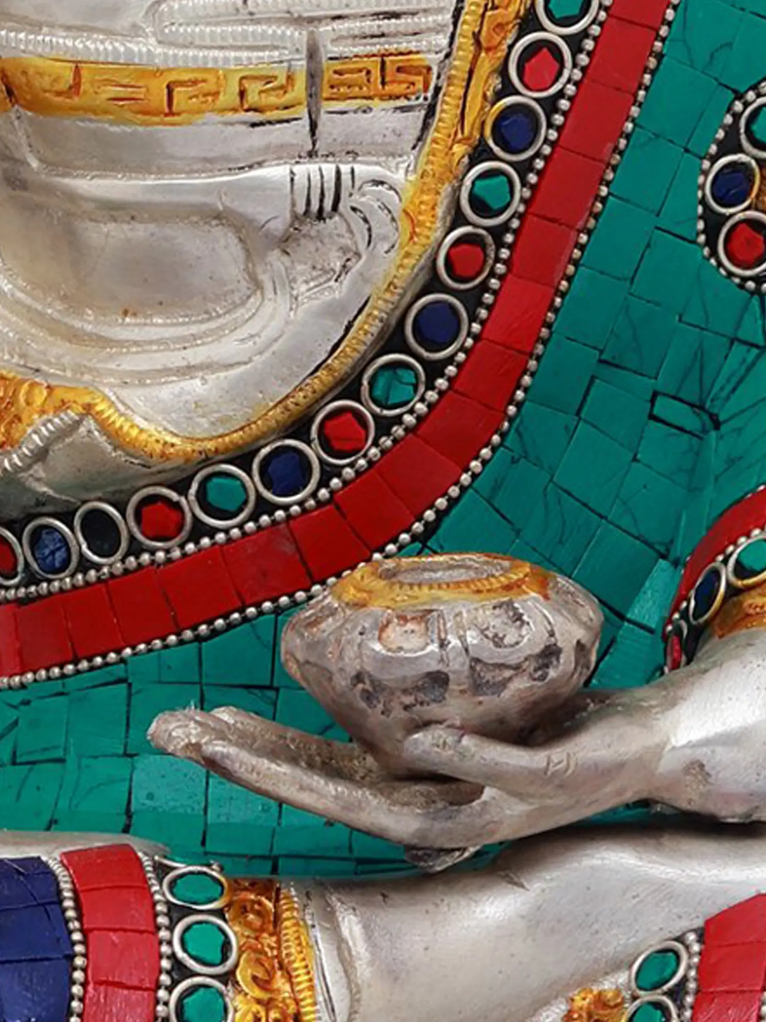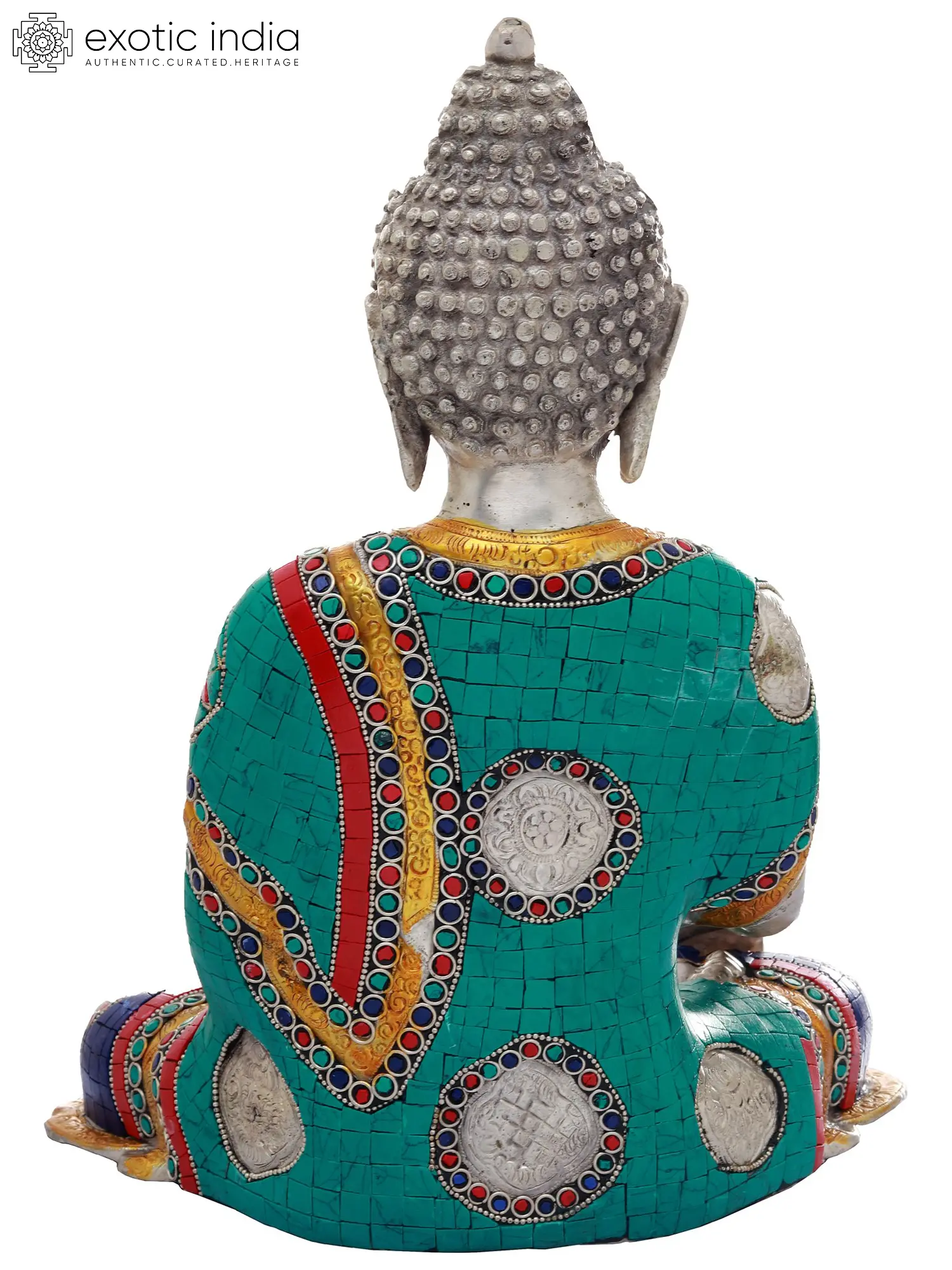 Handcrafted in India with meticulous attention to detail, this statue is fashioned from high-quality brass, giving it a substantial and dignified presence. The serene countenance of the Buddha, with his closed eyes and gentle smile, conveys a deep sense of inner peace and profound wisdom. His urna, the raised dot between his eyebrows, symbolizes his all-seeing vision, and his ushnisha, the cranial protuberance, signifies his elevated consciousness. The intricate detailing extends to his flowing robes, which are adorned with vibrant inlay work. This embellishment, featuring a mosaic of turquoise, red, and blue stones, along with golden accents, not only enhances the visual appeal but also alludes to the richness and multifaceted nature of the Dharma. ––––––––––