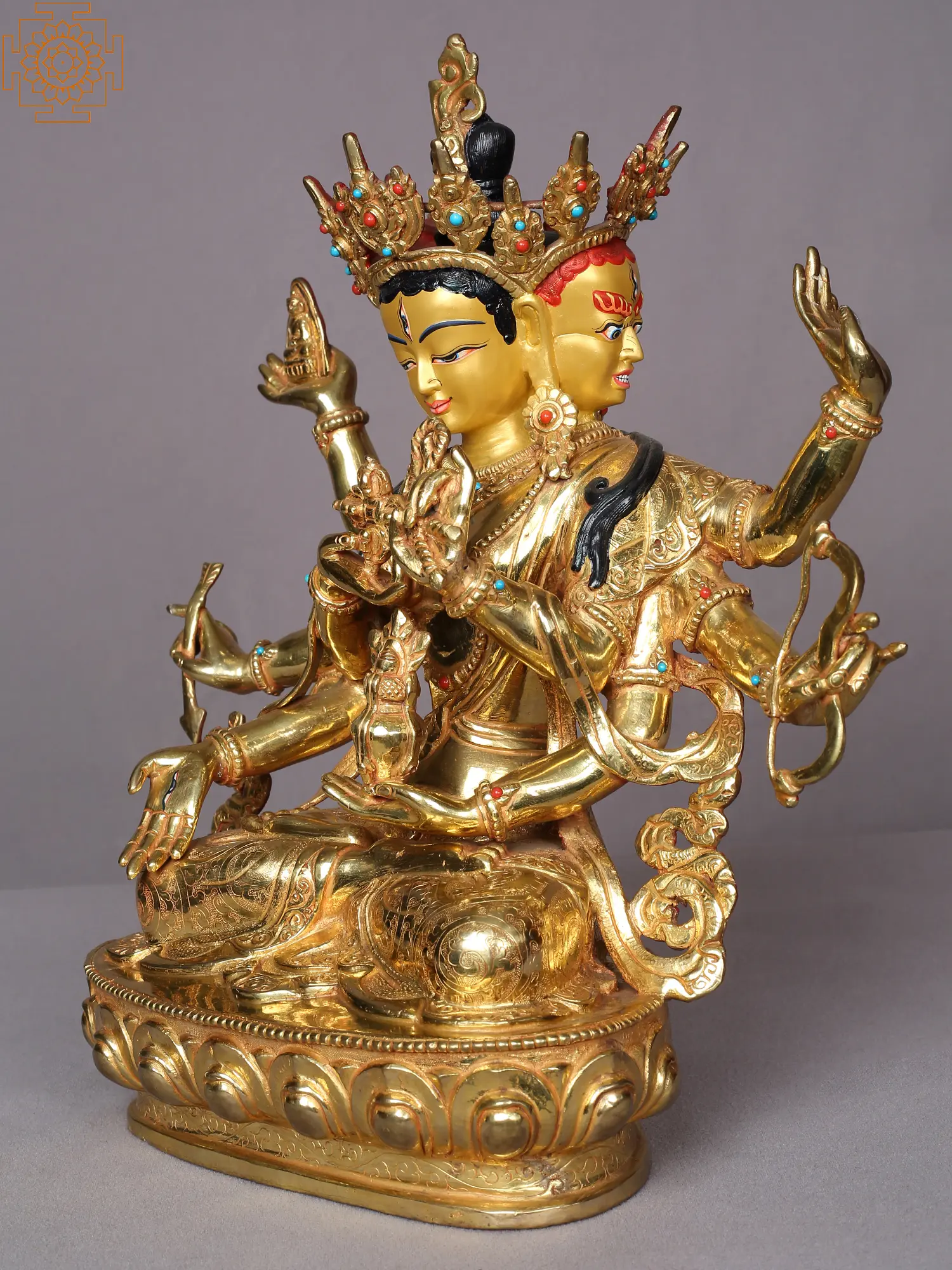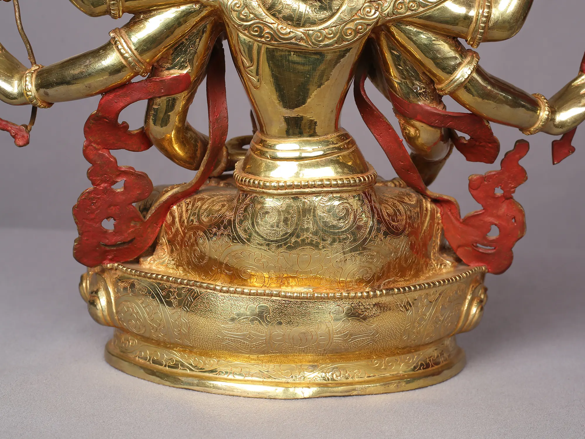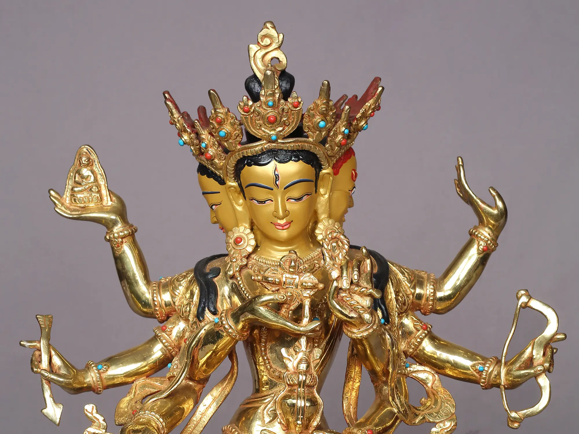 The personification of the divine light that emits from the Ushnisha or cranial protuberance of the Enlightened One, Namgyalma as delineated in this brilliant copper with gold statue from Nepal is a Tibetan Buddhist deity who bestows longevity on the followers. In this form, the sacred trinity of Namgyalma, White Tara, and Amitayus- all divinities that affirm long life, are presented together, adorned with exquisite ornaments, and enthroned on a lotus seat which symbolizes the blooming of wisdom within.