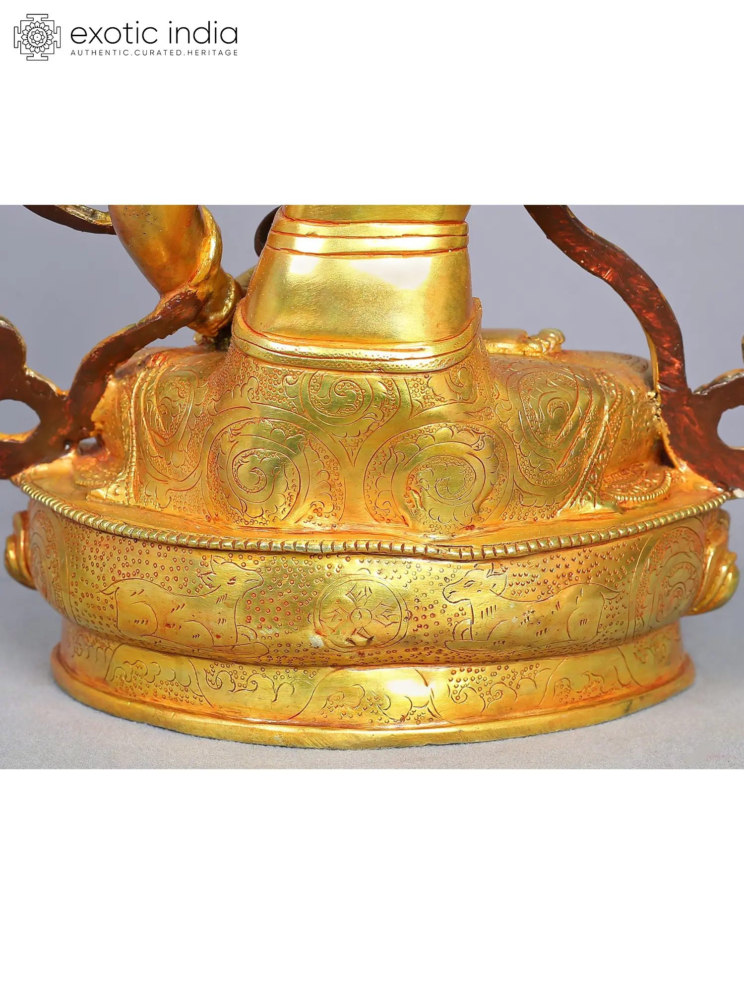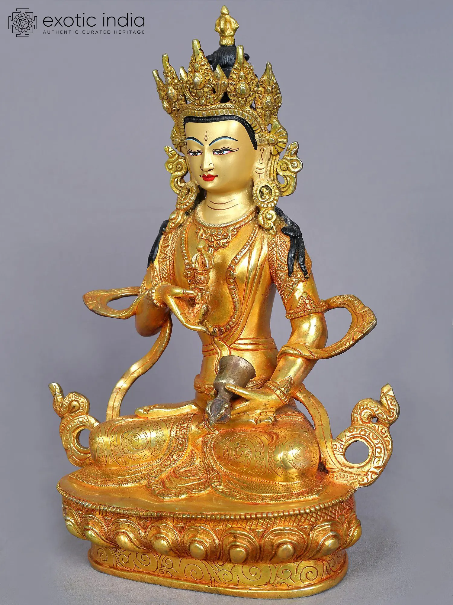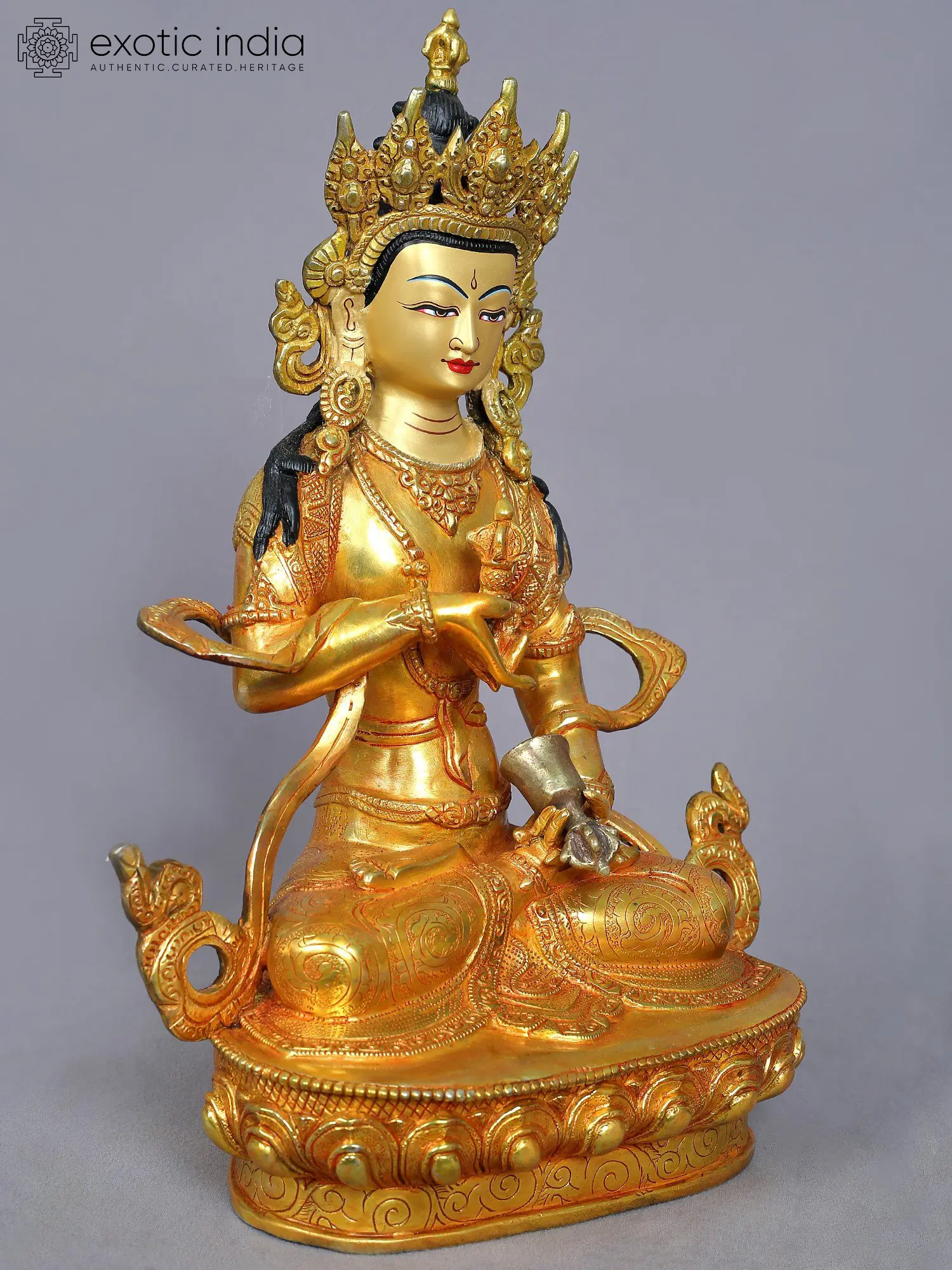 In his right hand, he holds a golden vajra or Dorje close to his heart, while his left hand is holding a silver ghanta, a bell with a vajra handle. The vajra symbolizes compassion and method, while the ghanta represents wisdom. The unity of these attributes, methods and wisdom, is essential for achieving Buddhahood.