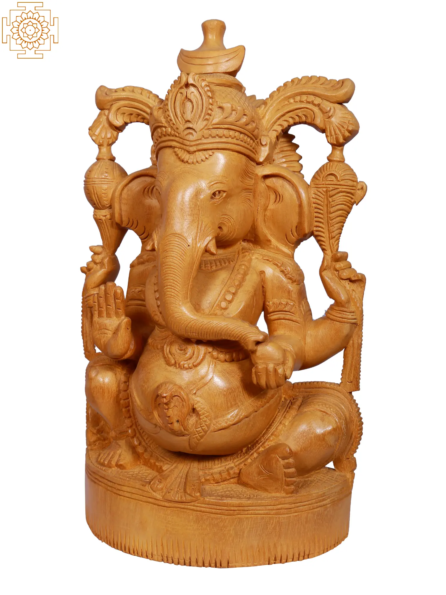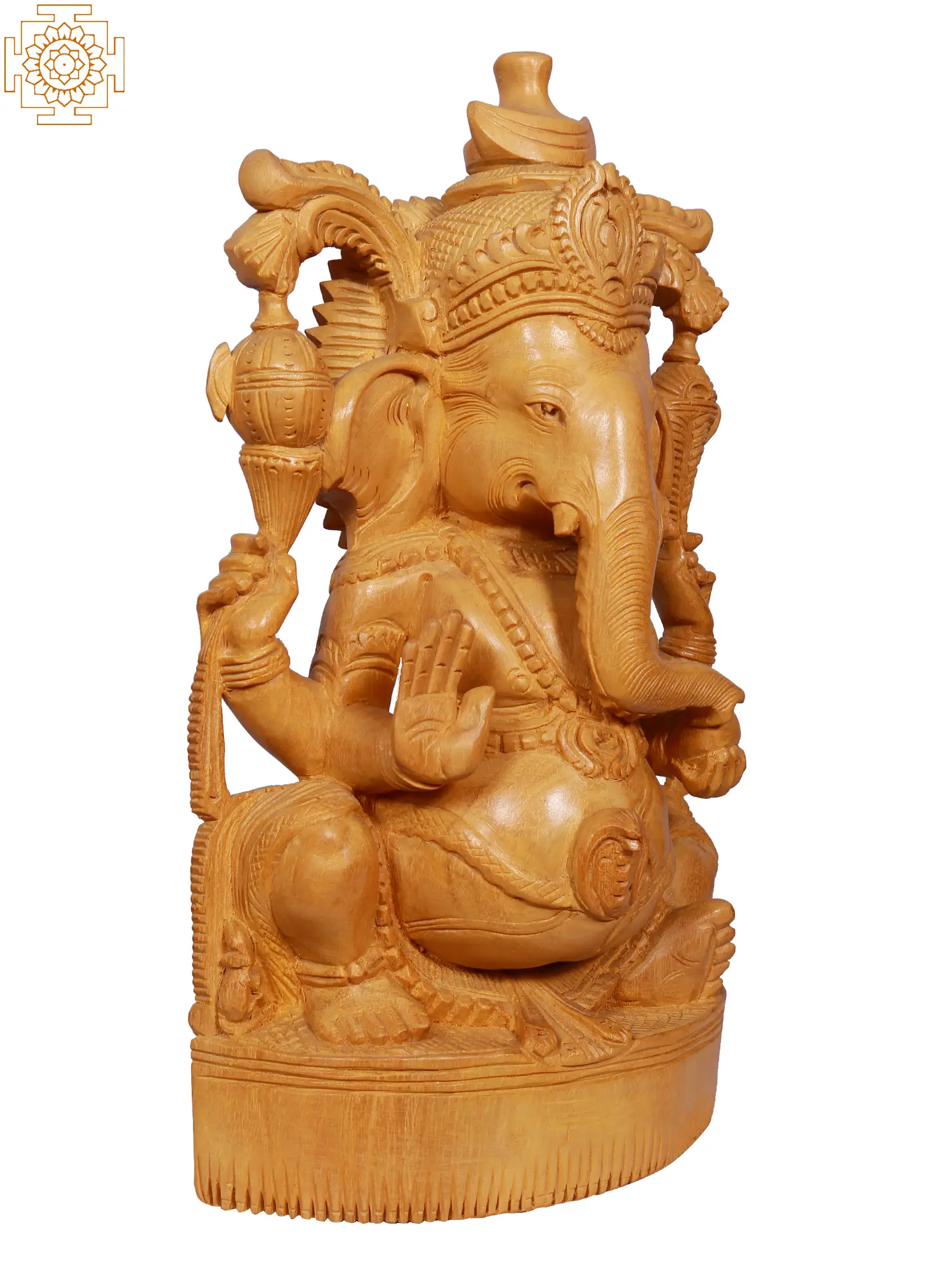 Lord Ganesha, also known as “Gajanana”, the god of new beginnings, the enchanting deity, gracefully sculpted in whitewood, captivates with his divine presence. Here, Ganesha tenderly cradles a Modak, the sacred sweet offering. His right hand extends in the reassuring “Abhaya Mudra”, offering protection and dispelling fear. In his upper hands, a goad and a noose symbolise his ability to guide and lead devotees on the righteous path. Adorned with resplendent jewels and an ornate crown, his magnificence radiates. Seated in “Utkutakasana”, Ganesha symbolises auspicious beginnings and the removal of obstacles. His round belly, wrapped by the serpent (Vasuki), embodies wisdom and the eternal cycle of life. Ganesha, the remover of impediments, reigns in tranquil majesty.