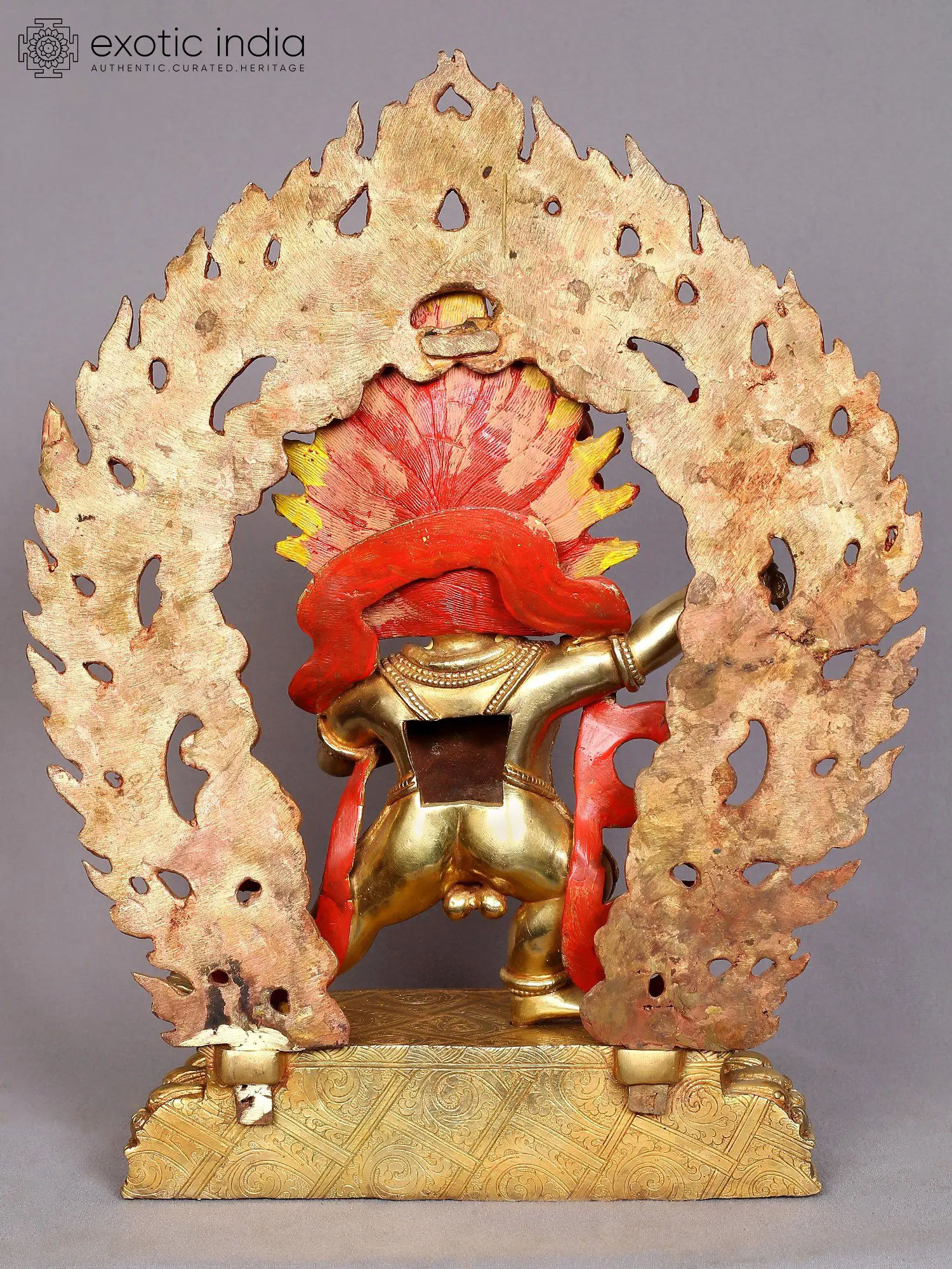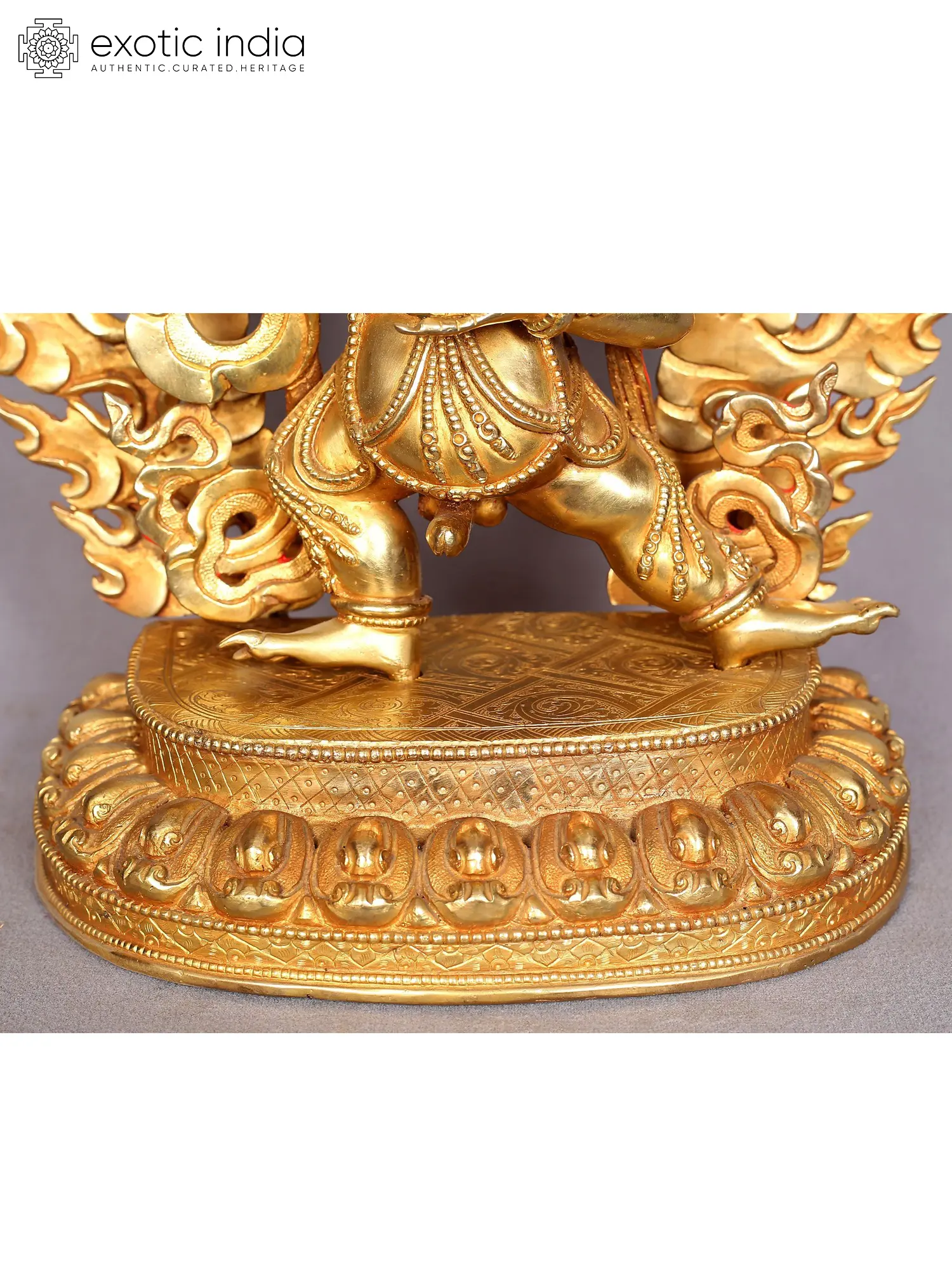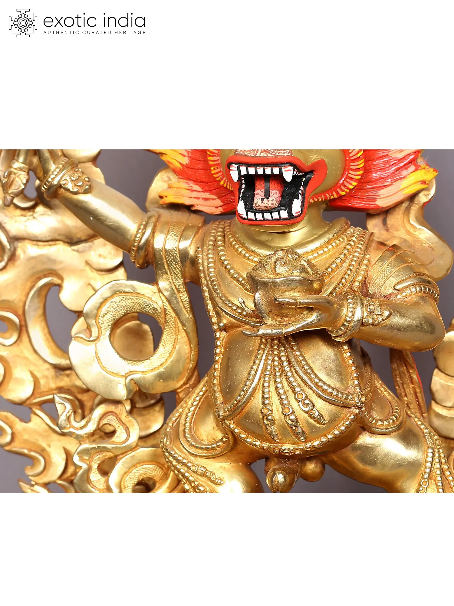 Yamantaka is characterized by nine faces, thirty-four arms, and sixteen legs, embodying an overwhelming and fierce presence that symbolizes the inability to escape his wrath. His primary face resembles that of a buffalo and features flaming eyebrows, eyelashes, and beard, which enhance his ferocity. Above his main head and positioned between his two horns, there is an incredibly fierce red face. Above this red face appears the youthful yet slightly wrathful visage of Manjushri, creating a complex and potent representation of this protector deity.
