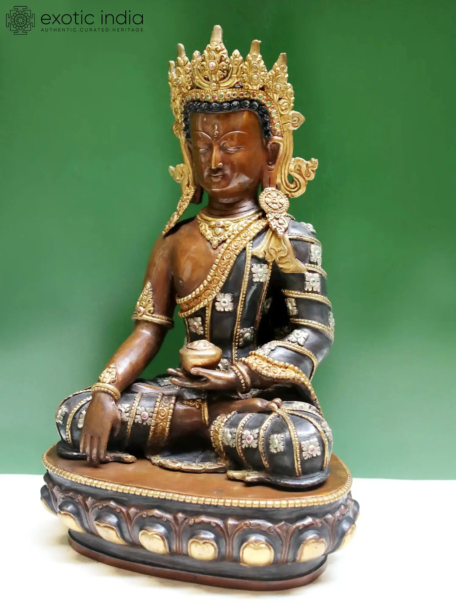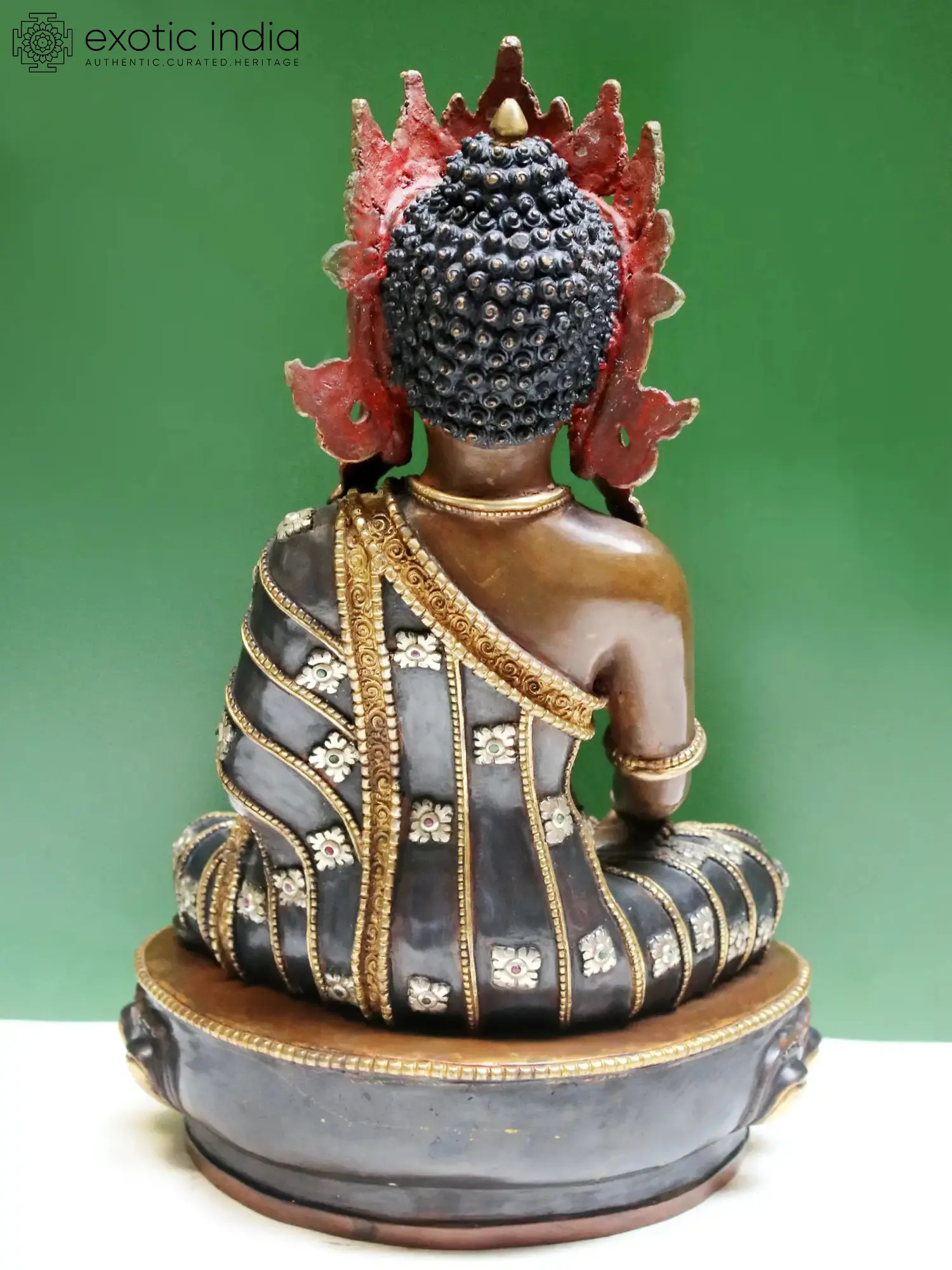 Uniting the two themes together, this copper sculpture depicts the Buddha in regal attire, with a lovely five-pronged Nepalese crown on his head, earrings, necklace, and a patterned garment adorning him, embellished by fine precious stones. The seamless polish of copper lends the icon an aesthetic appeal, enhanced by the stylized ornamentation. Victorious through non-violence, Bhumisparsha Buddha in the tradition is the pinnacle of divine royalty.