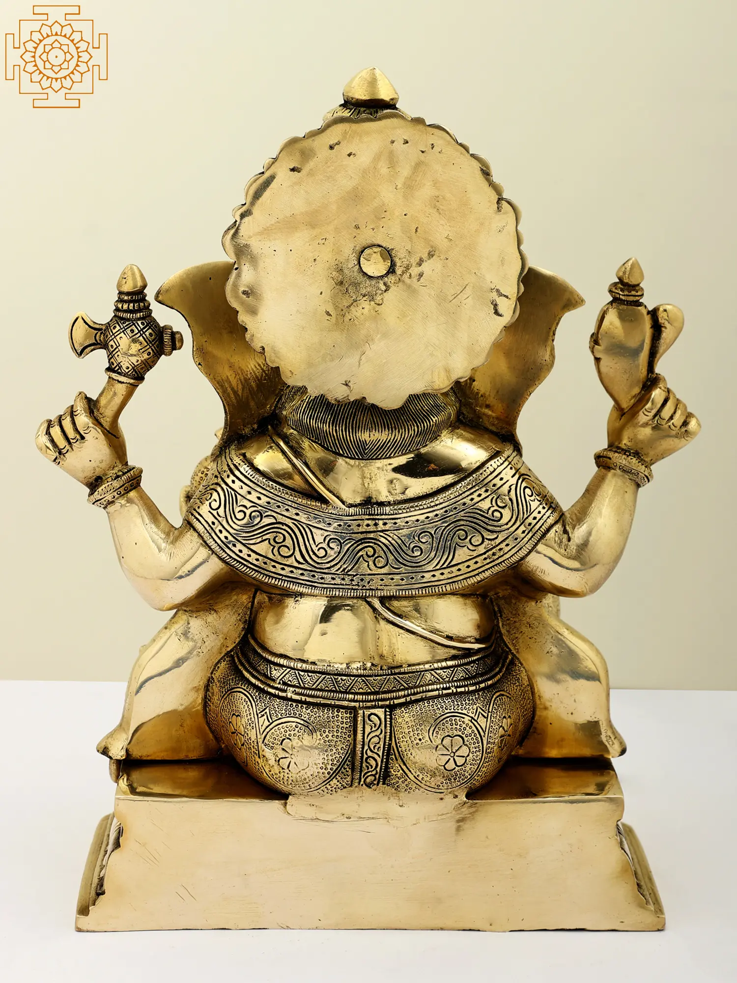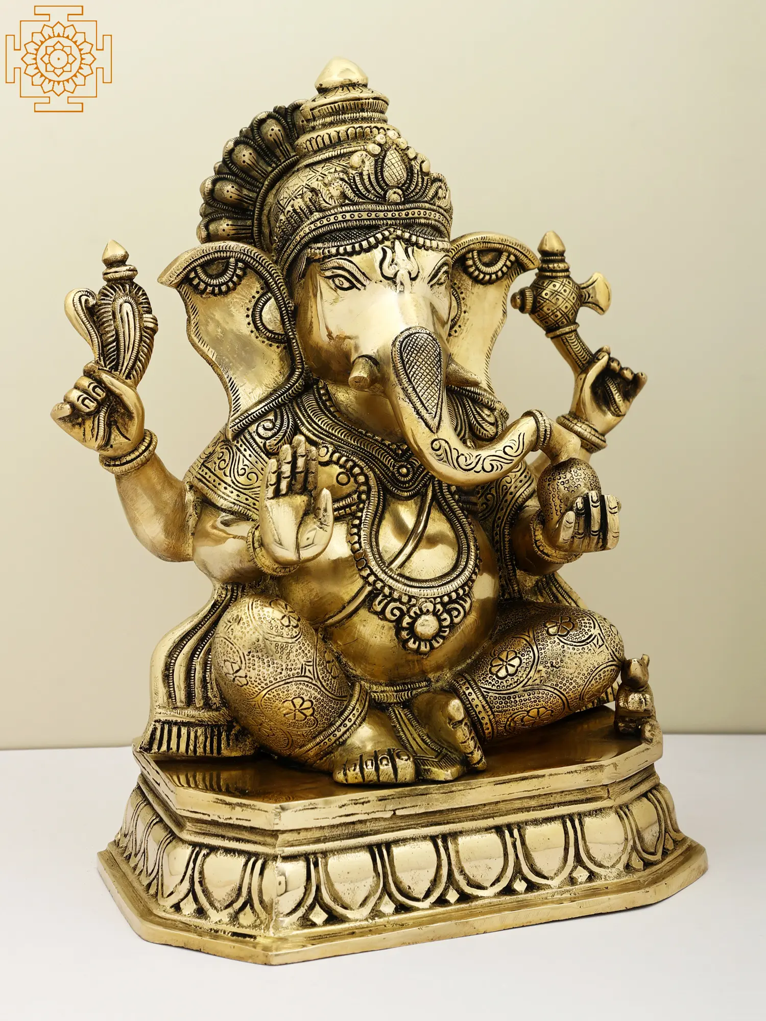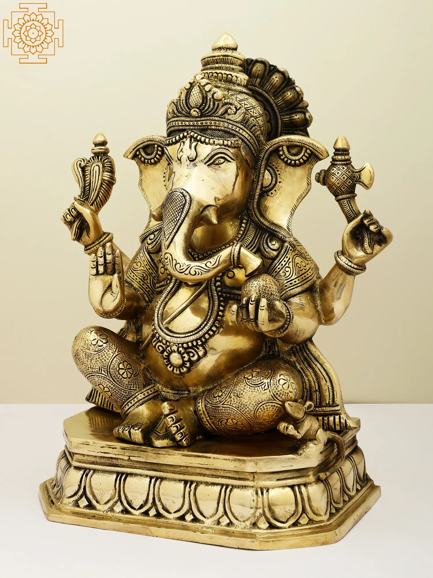 Lord Ganesha also known as Vinayaka and Lambodara is one of the best known and most worshipped deities in Hindu Pantheon. The sculpture depicts Lord Ganesha in Ashirwad Mudra (gesture of benediction), signifying his readiness to bestow blessings, guidance, and protection upon those who seek his divine intervention. In this beautiful artwork, Vinayaka is carrying a goad (ankusha) and a Noose, representing his power to steer one’s life in the right direction. The mark or tilak of trident (trishul) on Lambodara’s forehead represents his connection to the cosmic forces and his ability to harmonise opposing energies. Before embarking on new ventures, devotees seek Lord Ganesha’s blessings since he paves the way for success and removes hindrances on their paths.