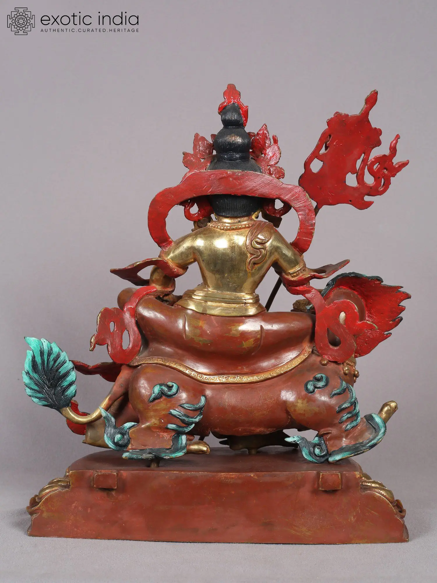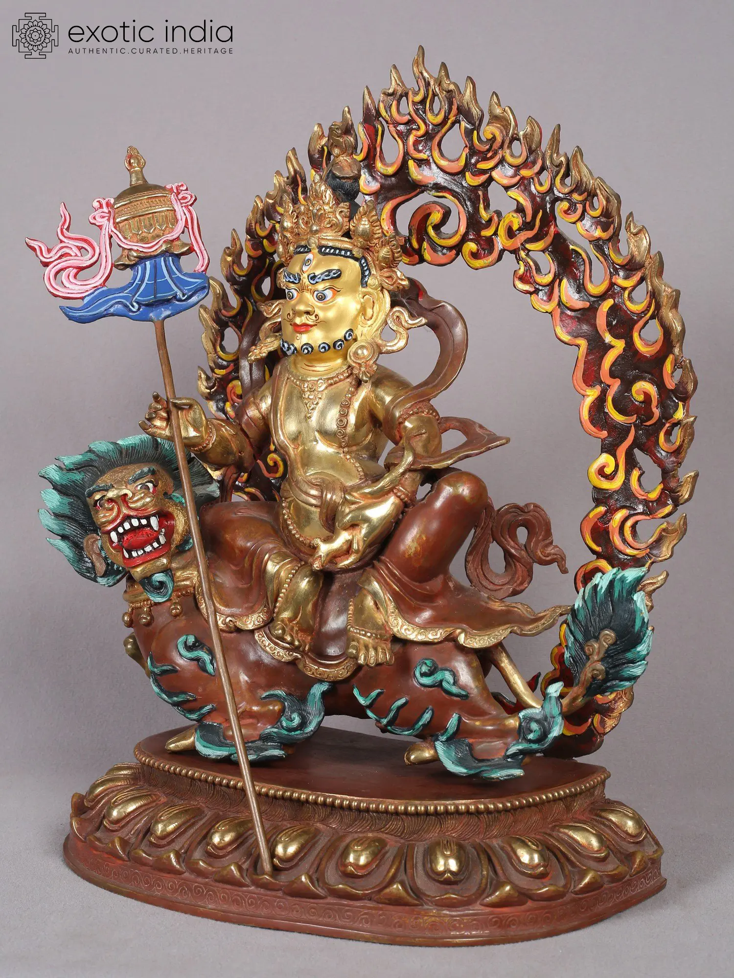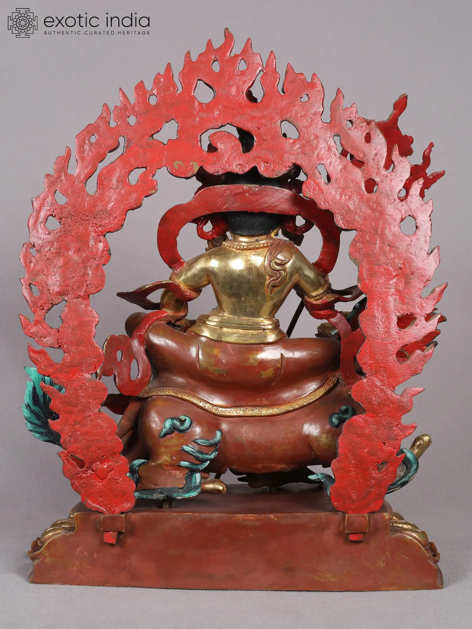 Kubera, the God of wealth in Buddhism, also known as Vaishravana, is revered as the guardian king of the northern direction and the protector of Mount Sumeru, believed to be the center of the universe. In this thangka depiction, Lord Kubera, the God of wealth, is seated in a regal posture. He possesses a golden-yellow complexion and a plump torso adorned with exquisite gold ornaments. His distinctive features include large, expressive eyes, upturned lips, and a unique mustache and beard.