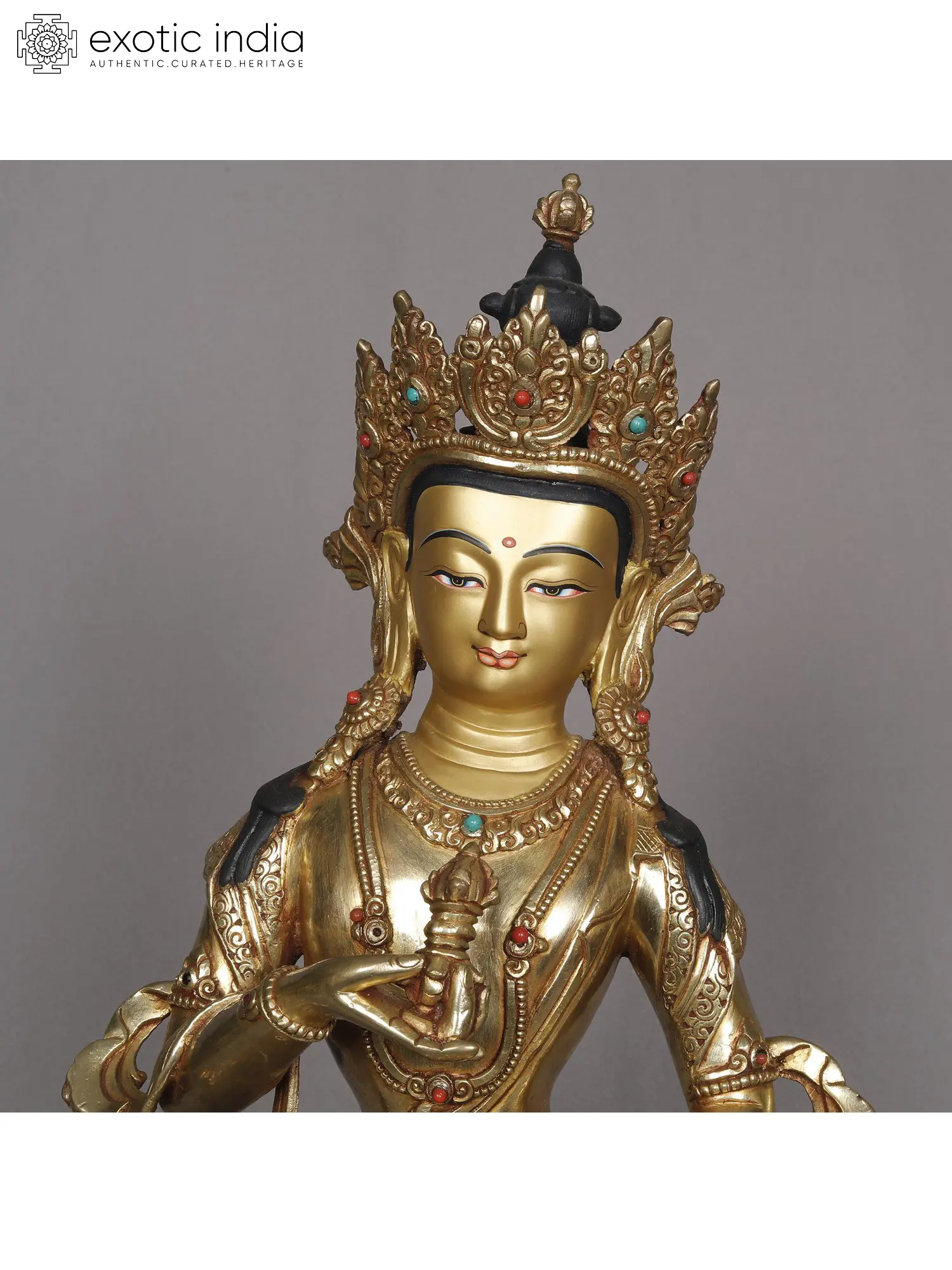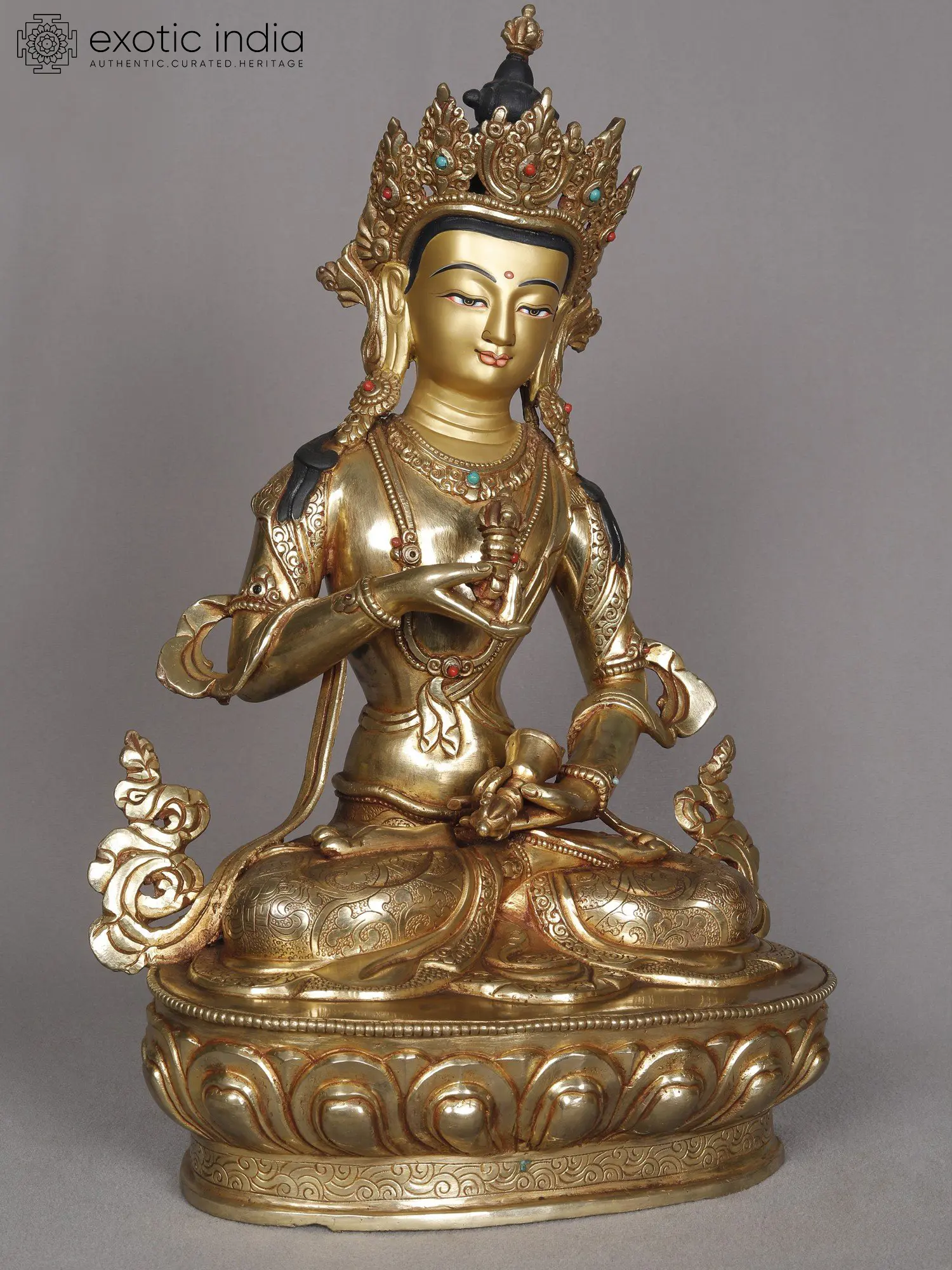 Each detail of this sculpture speaks of the meticulous craftsmanship honed over generations in Nepal. The use of copper as a base material provides a robust structure, while the application of gold plating imbues the statue with a divine radiance. The fine carving of the facial features, the delicate rendering of the adornments, and the precise ornamentation of the lotus base all contribute to the statue's exquisite beauty. The dynamic yet balanced posture, combined with the subtle embellishments, creates a piece that is not merely an object of devotion but a work of art that resonates with spiritual energy. This statue is a perfect addition for any practitioner seeking a tangible connection to Vajrasattva's purifying grace or for collectors who appreciate the finest examples of Buddhist art. Its substantial size and exquisite finish make it a commanding presence, suitable for altars, meditation rooms, or as a statement piece in any sacred space.