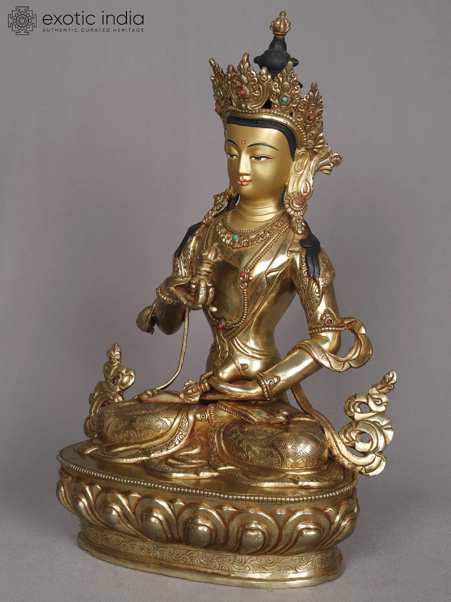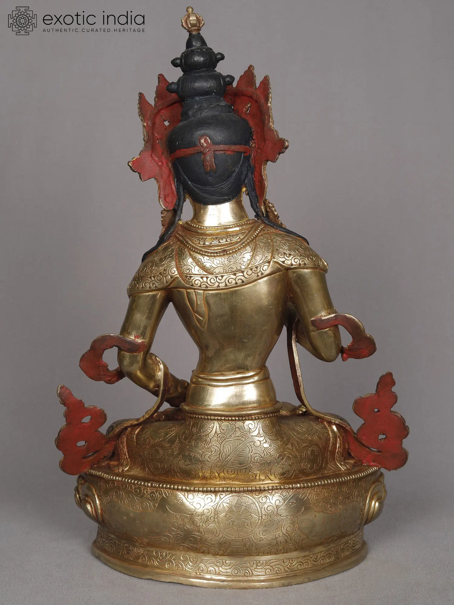 This magnificent 14-inch sculpture from Nepal embodies the profound spiritual significance of Vajrasattva, a central figure in Mahayana and Vajrayana Buddhism. Crafted with exceptional skill from copper and finished with a lustrous gold plating, this statue is a testament to the rich artistic heritage of the Himalayan region. Vajrasattva is revered as the embodiment of universal purity, wisdom, and the Vajra (diamond) nature of reality. His presence is considered essential for purification practices, offering a path to overcome negative karma and attain enlightenment.