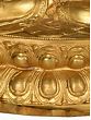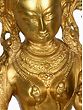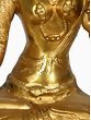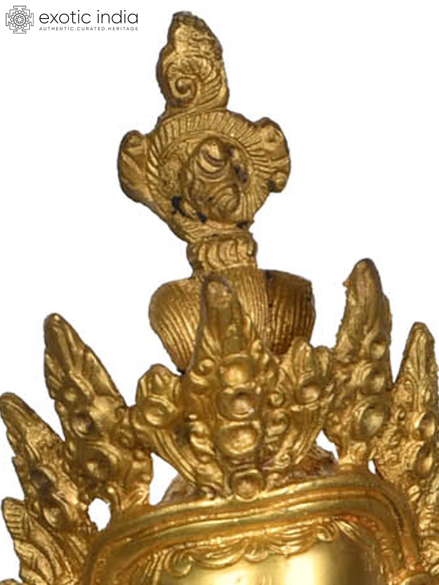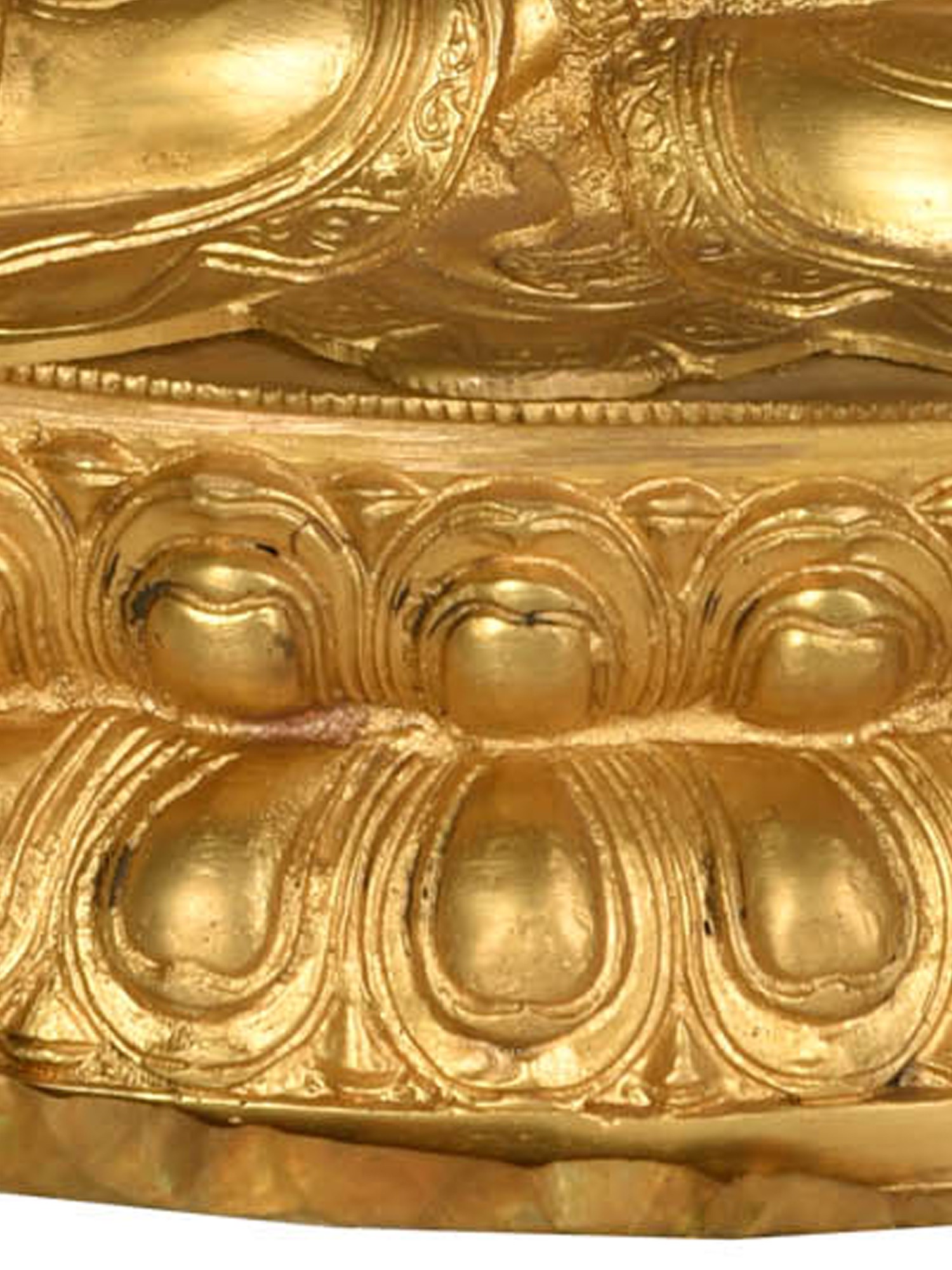 In this statue, she is shown as sitting in a meditation lotus posture with both legs folded, seated on a double lotus. She is represented as wearing a beautifully carved scarf covering her shoulders and neck from the back side and an exquisite long apron. She keeps vigilance on all the sufferings of the world from all sides. She has an enchanting face with three jewels glowing on her neck. Her crown has the pattern of a Buddhist Temple.