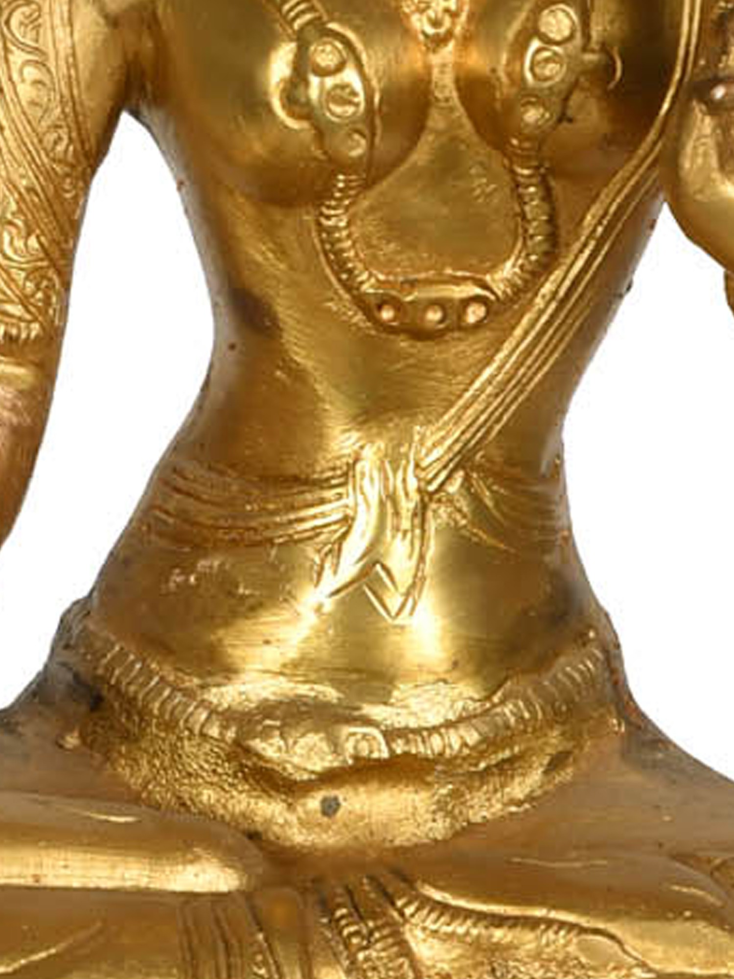 She is holding full blown stem lotus called Utpala, wrapped around her hands and touching both her shoulders respectively in an artistic yet natural look. This lotus has three blooms representing the past, present, and future. Longevity, survival and concern for suffering are the main aspects of this supreme and loving mother goddess White Tara.