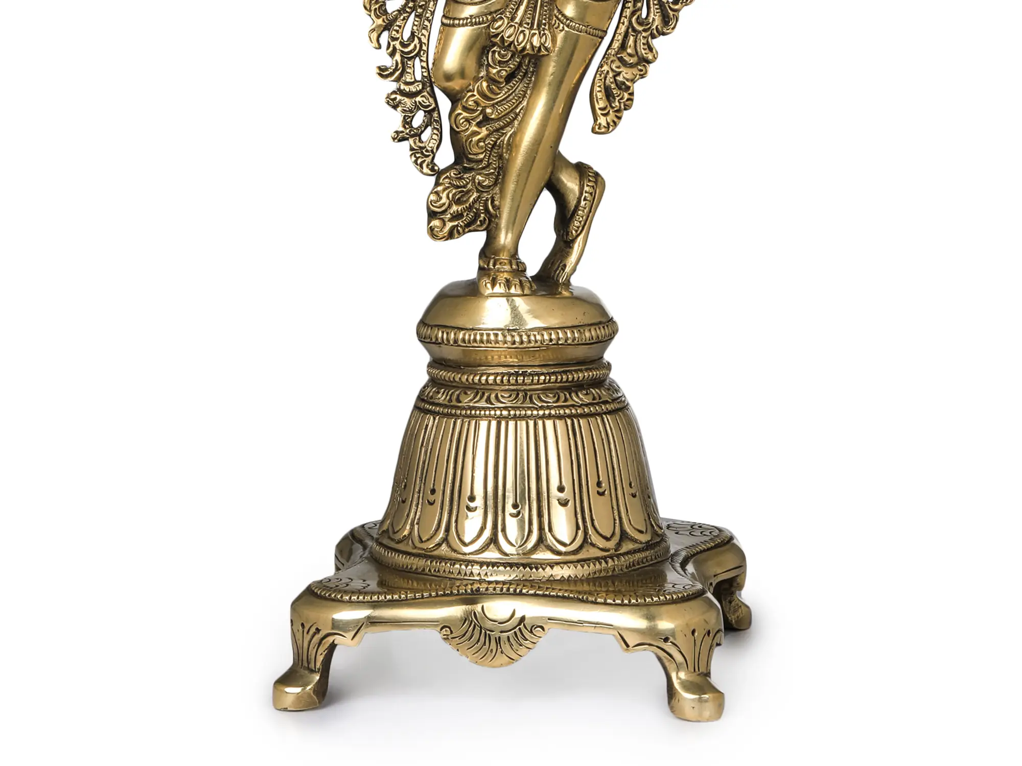 This exquisite brass statue captures the divine charm and playful spirit of Lord Krishna, the beloved deity of Hinduism. Standing at fourteen inches tall, this handcrafted masterpiece is a testament to the rich artistic heritage of India. Lord Krishna, revered as the eighth avatar of Vishnu, is depicted in his iconic pose, flute in hand, about to unleash a melody that enchants all of creation. The intricate details, from the delicate curve of his lips to the flowing fabric of his dhoti, speak of meticulous craftsmanship passed down through generations. The peacock feather adorning his crown, a symbol of his playful nature and connection to the natural world, is rendered with stunning artistry. The flowing tassels and ornate jewelry further enhance the divine aura of this piece. Krishna's stance, with one leg gracefully bent, conveys a sense of movement and joy, as if he is about to dance or begin a divine performance. The artist has skillfully captured the essence of Krishna as the divine cowherd, the mischievous child, and the supreme spiritual teacher. ––––––––––