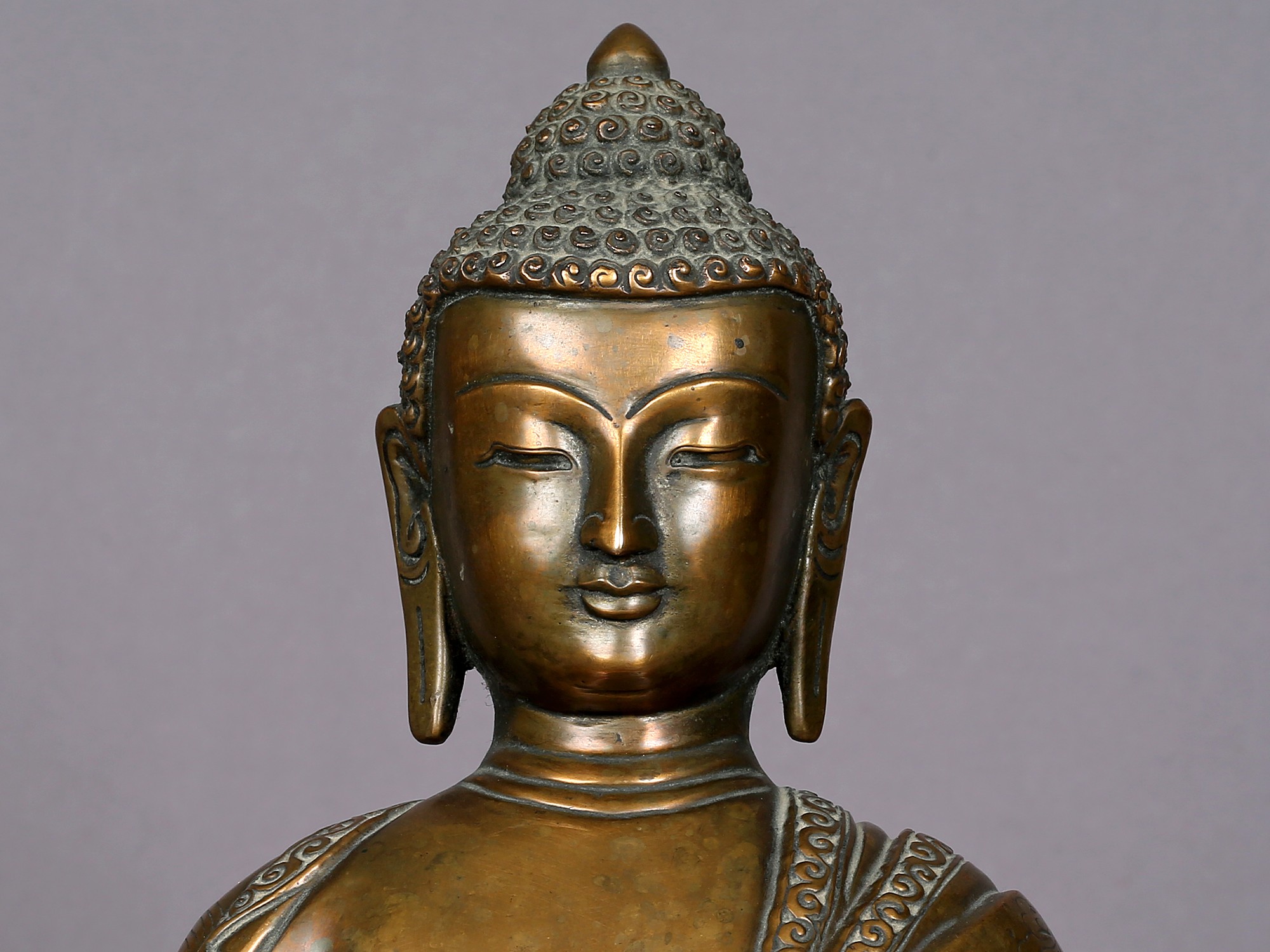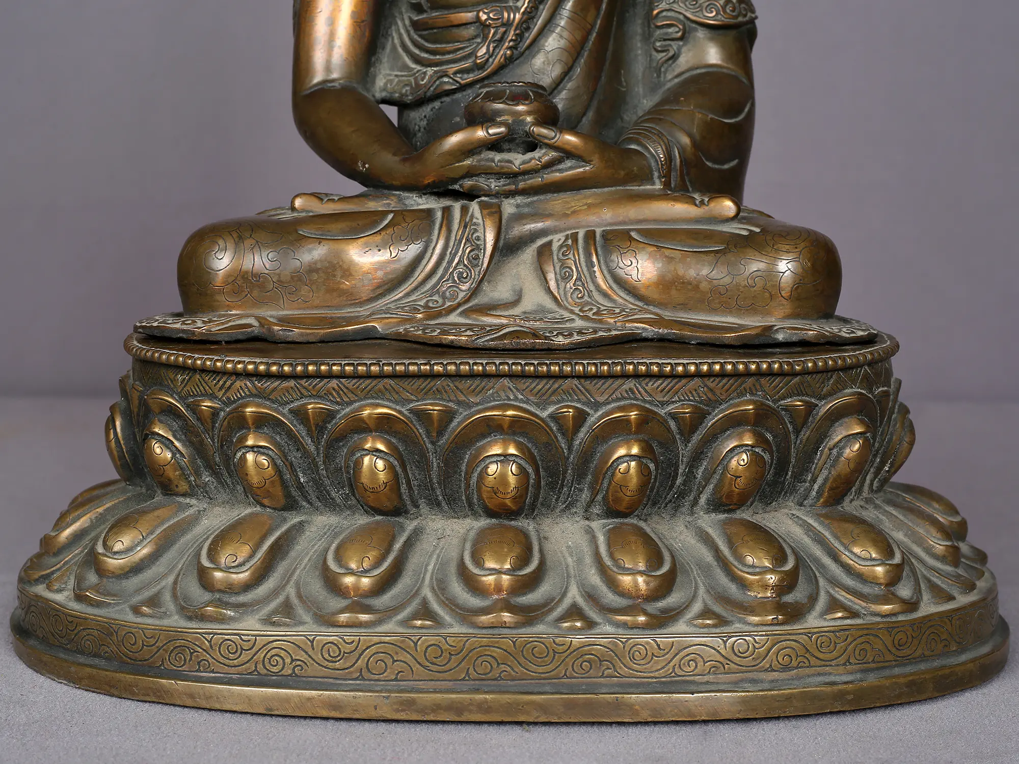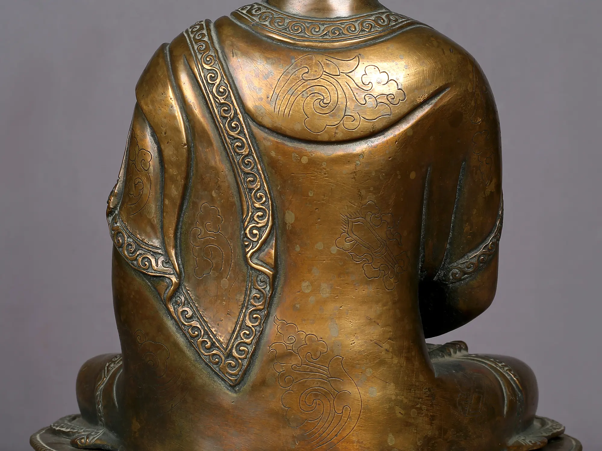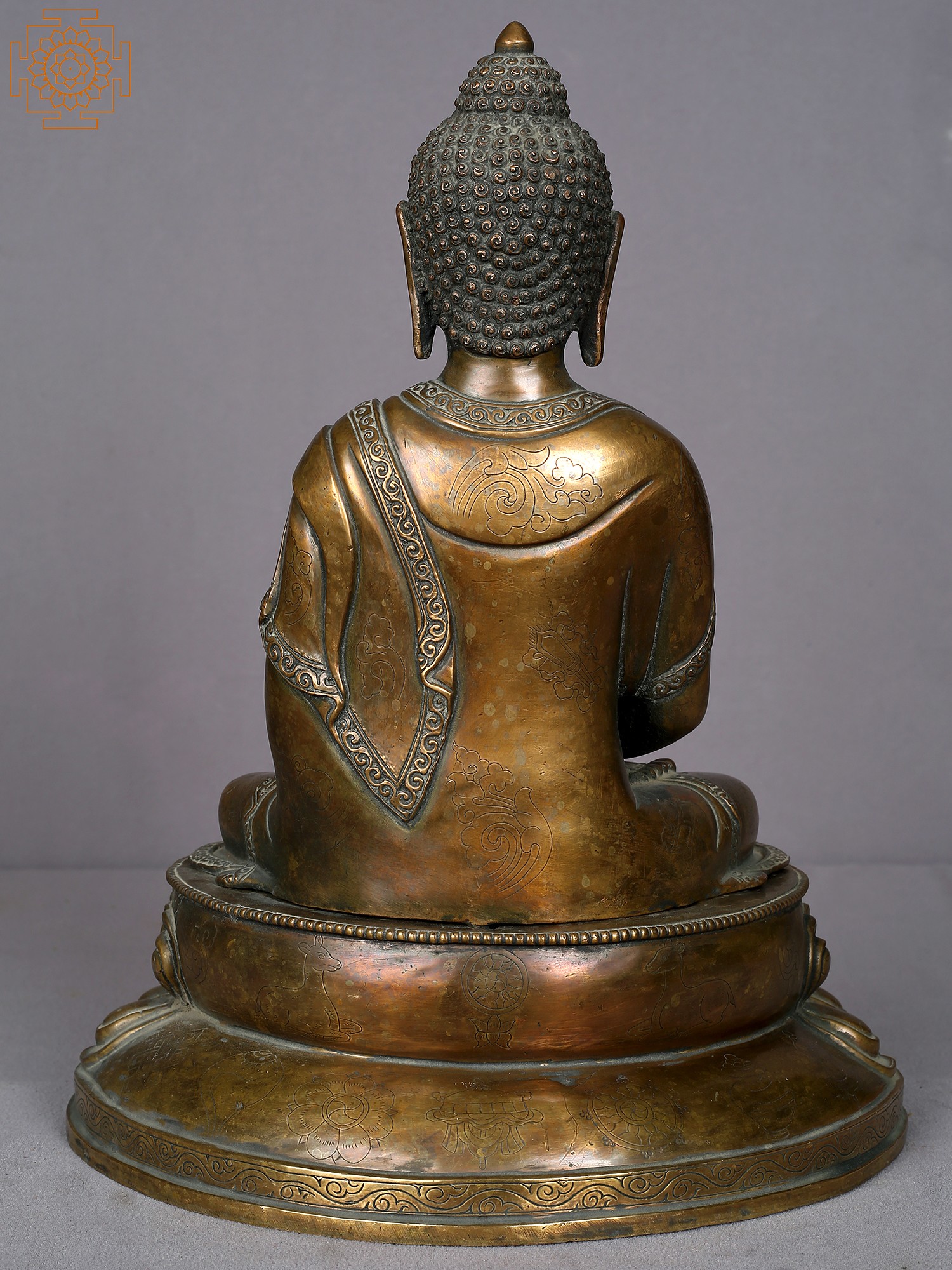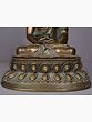 In a deep meditation pose, Amitabha symbolizes his profound love and compassion. His hands are in a meditative gesture, with palms facing upward, resting in his lap while holding an alms bowl containing healing elixir. He is adorned with a huge crown that consists of five precious gemstones. Further, he is seen in a monastic robe that covers his right arm, this depicts him attaining enlightenment. Amitabha Buddha is known as the Buddha of Infinite Light and is believed to offer salvation to all beings who sincerely call upon his name